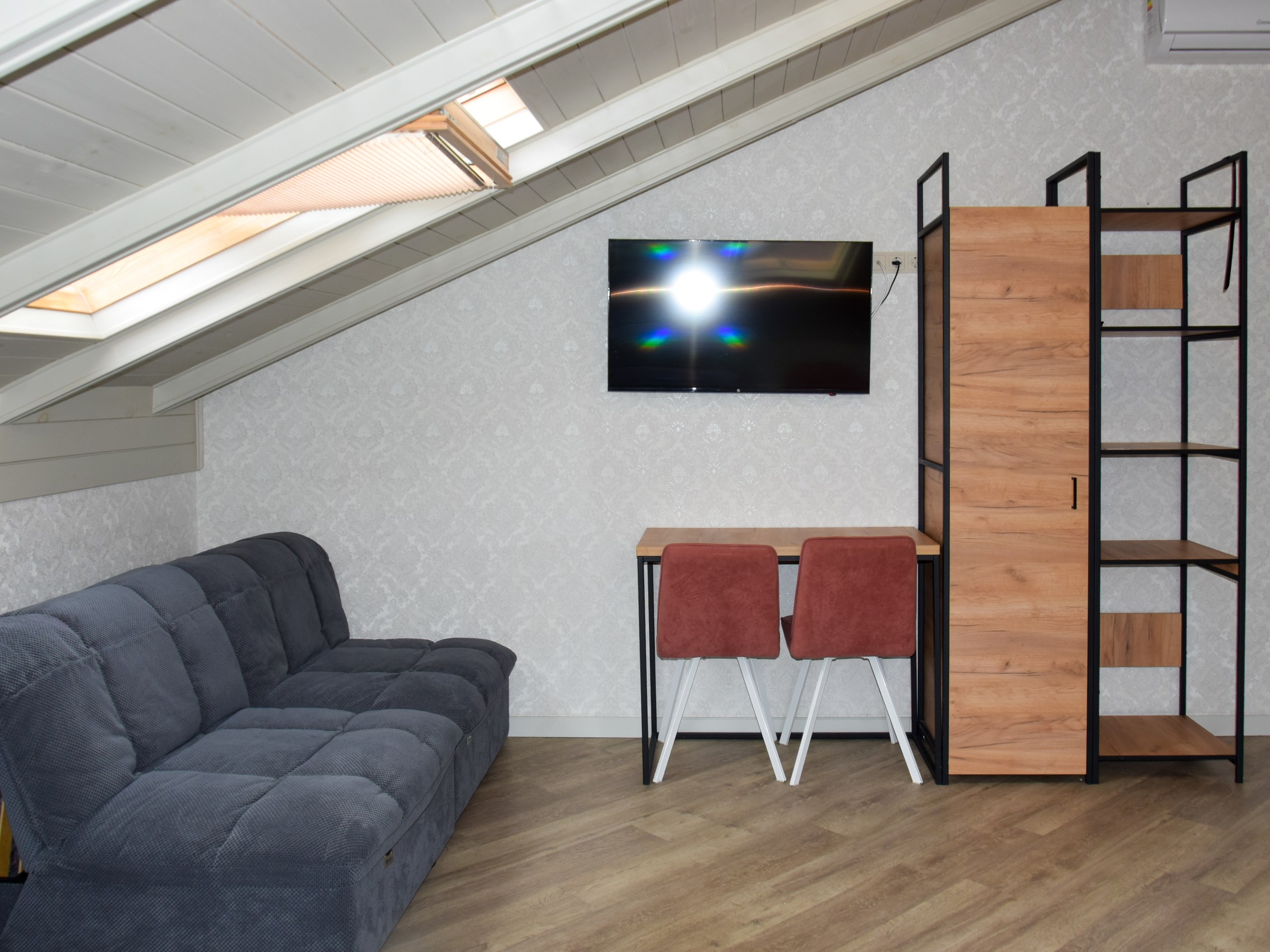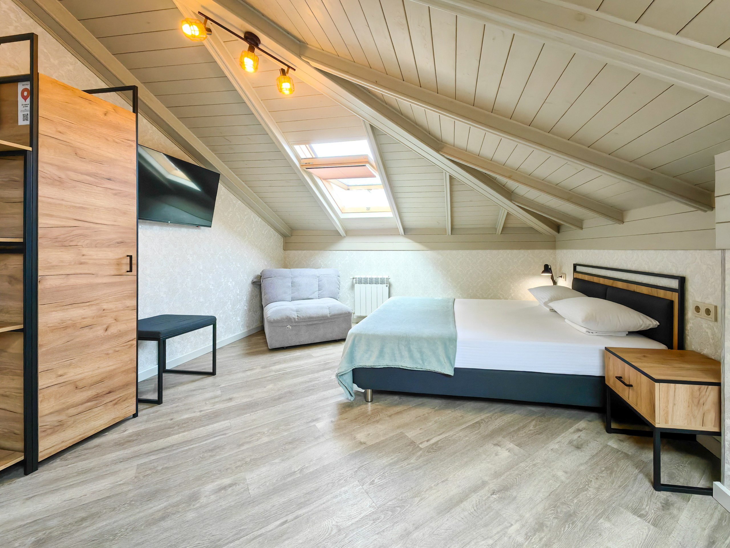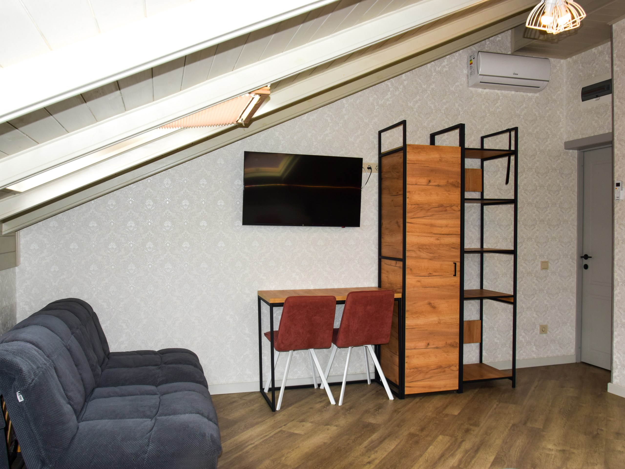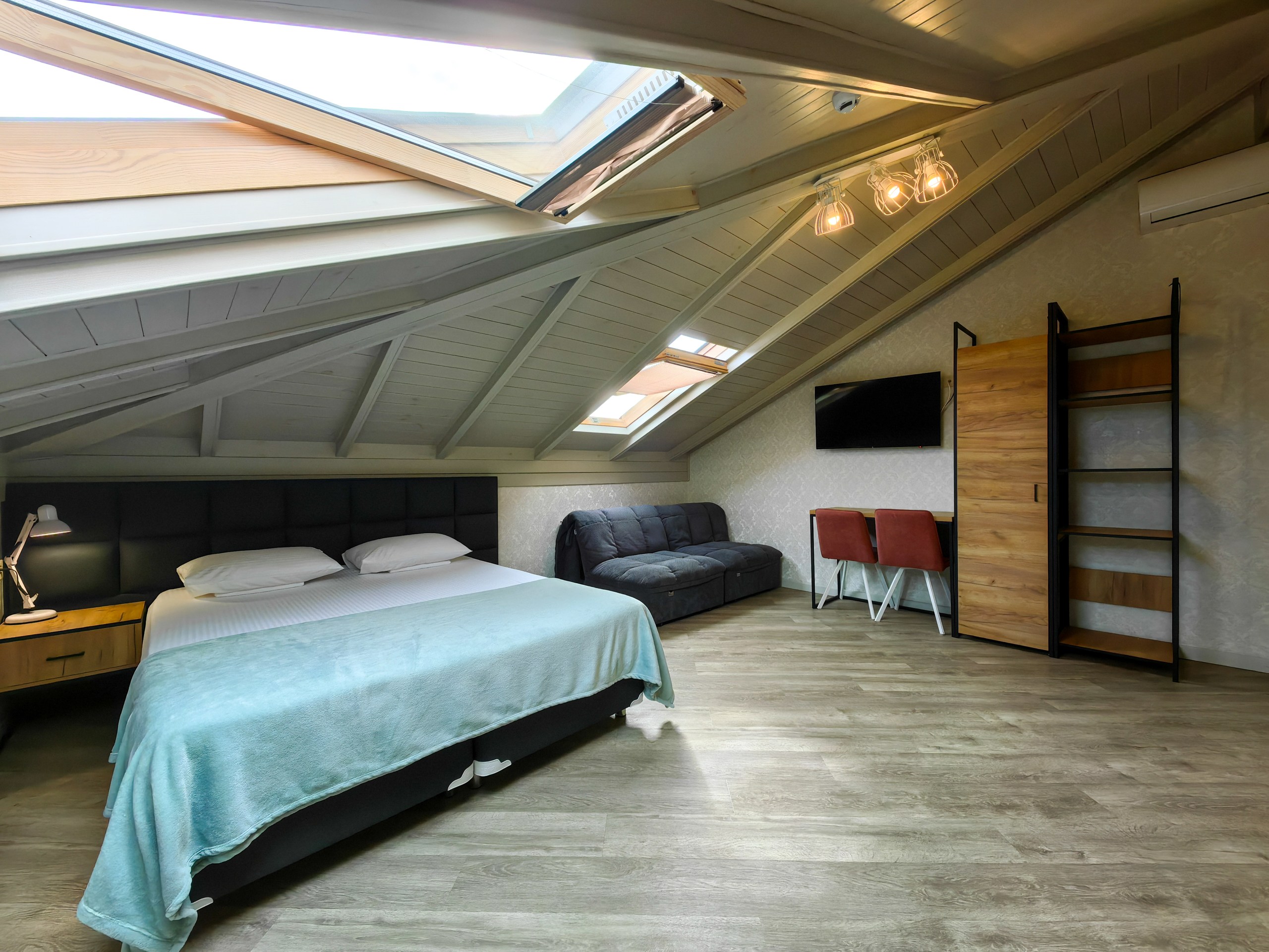 В номере: зеркало, кресло-кровать, кровать двуспальная, прикроватная тумбочка, стеллаж, стол, стулья, шкаф, кондиционер, микроволновая печь, мини-холодильник, набор посуды, телевизор ЖК, электрочайник