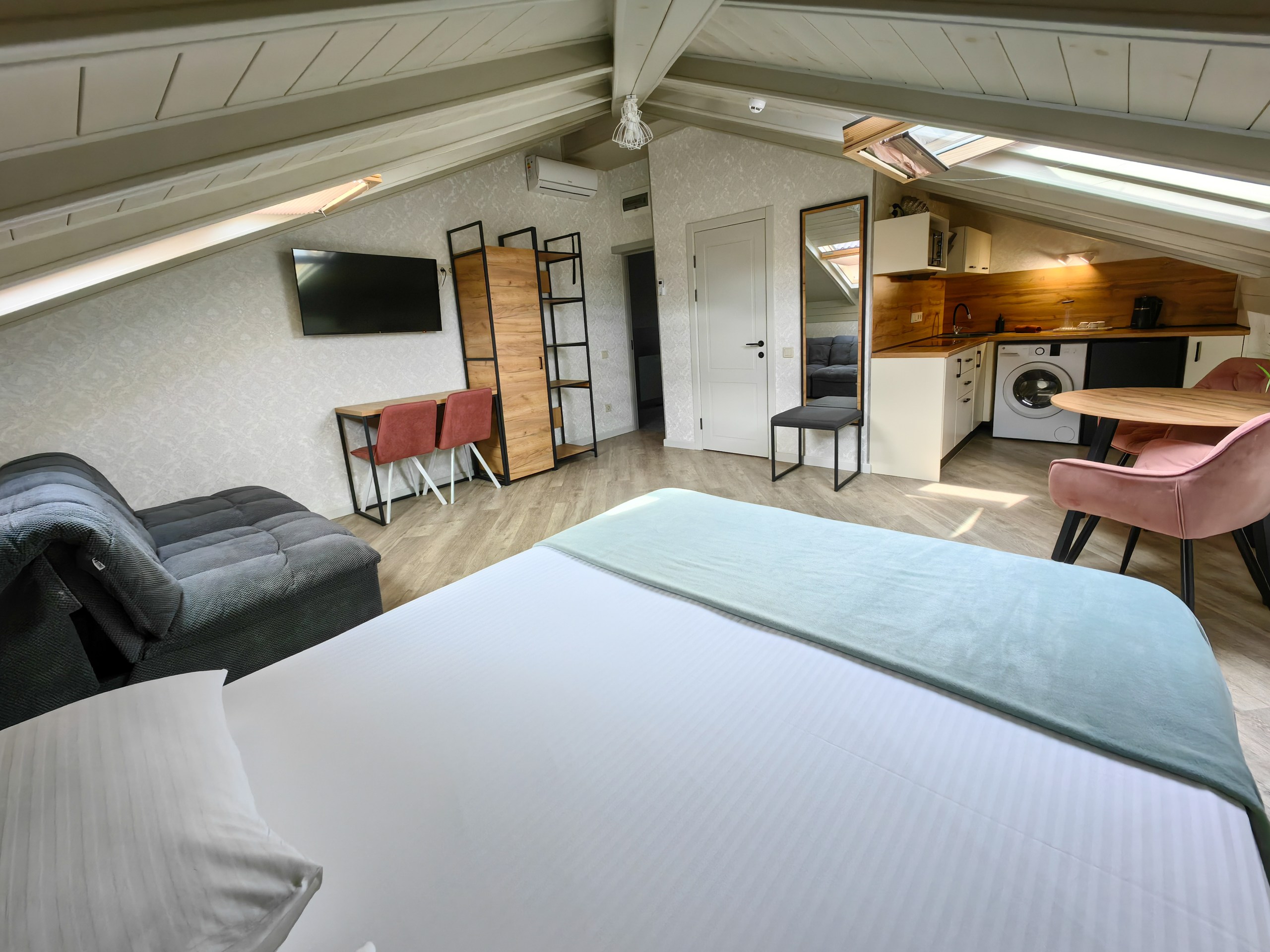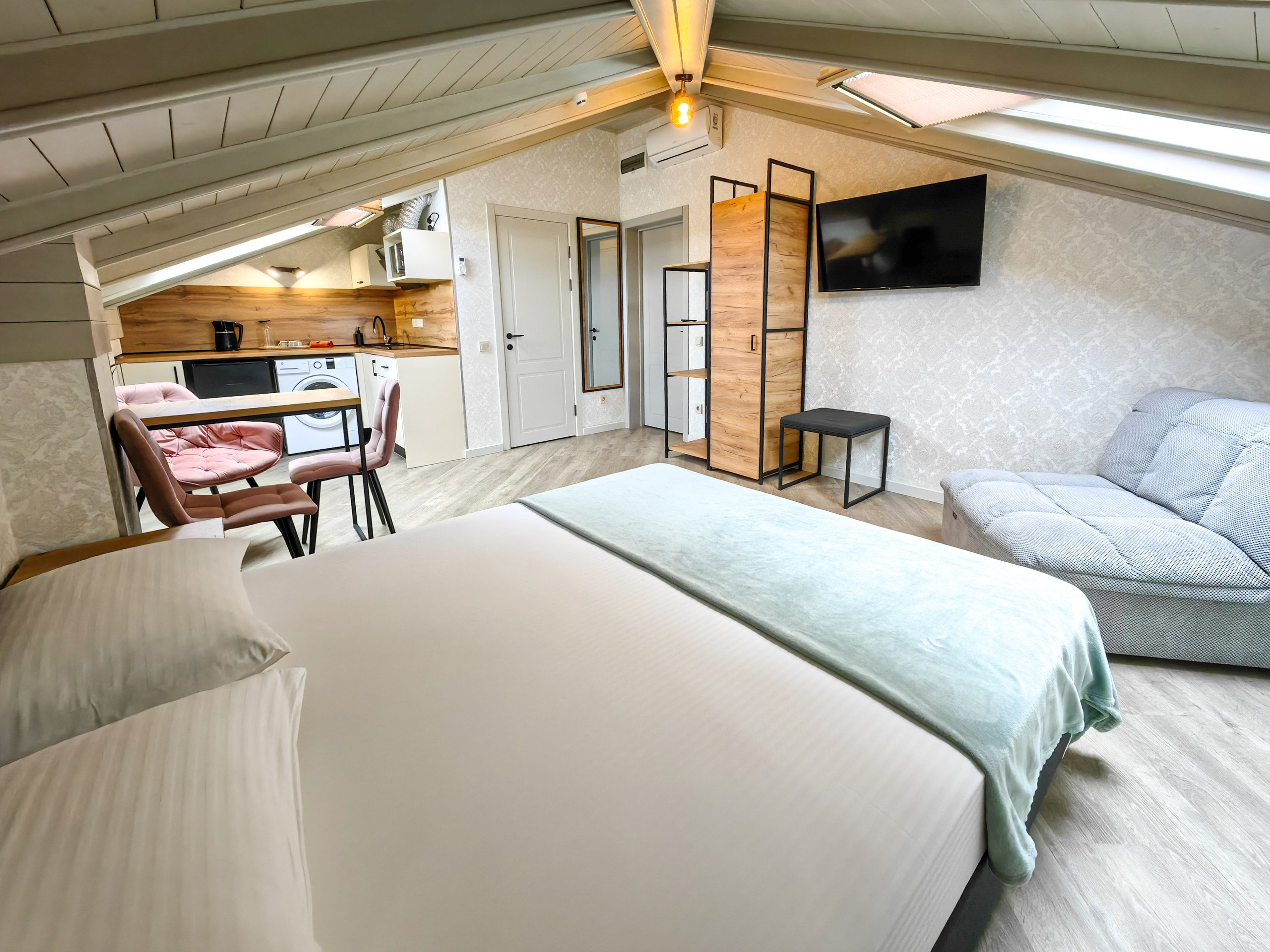 В номере: зеркало, кресло-кровать, кровать двуспальная, прикроватные тумбочки, стеллаж, стол, стулья, шкаф, кондиционер, микроволновая печь, мини-холодильник, набор посуды, плита электрическая, стиральная машина, телевизор ЖК, электрочайник