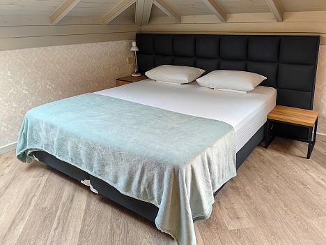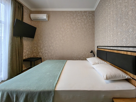 В номере: зеркало, кровать двуспальная, прикроватные тумбочки, стеллаж, стол, стулья, шкаф, кондиционер, микроволновая печь, мини-холодильник, набор посуды, телевизор ЖК, электрочайник