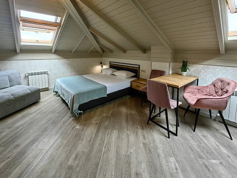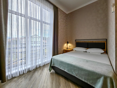 В категории Апартаменты дополнительно оборудована мини-кухня с электрической плитой. Каждый номер с собственным санузлом, душем, феном, тапочками и туалетно-косметическим набором. Около гостевого дома расположена зона отдыха со столиками и садовой мебелью. До пляжа Мандарин и пляжа Чайка 7 минут пешком. Пляжи полностью оснащены: лежаками, зонтиками, кабинками для переодевания и душем.