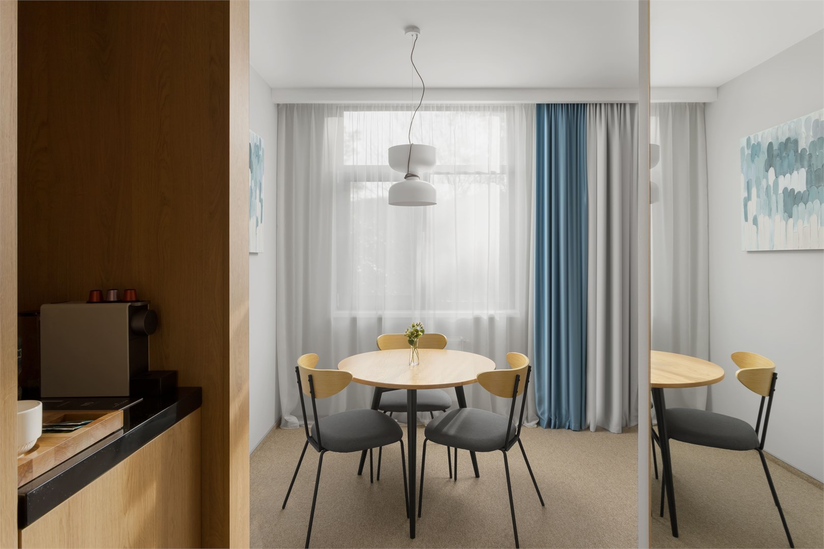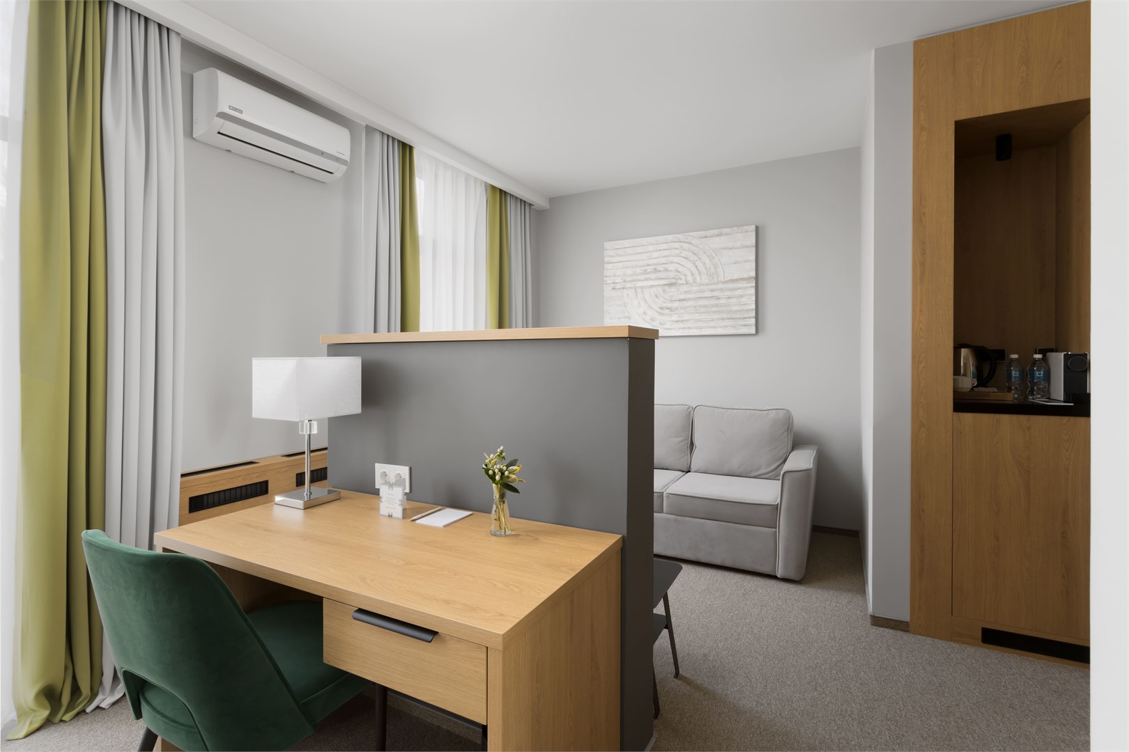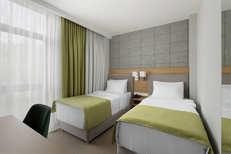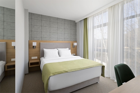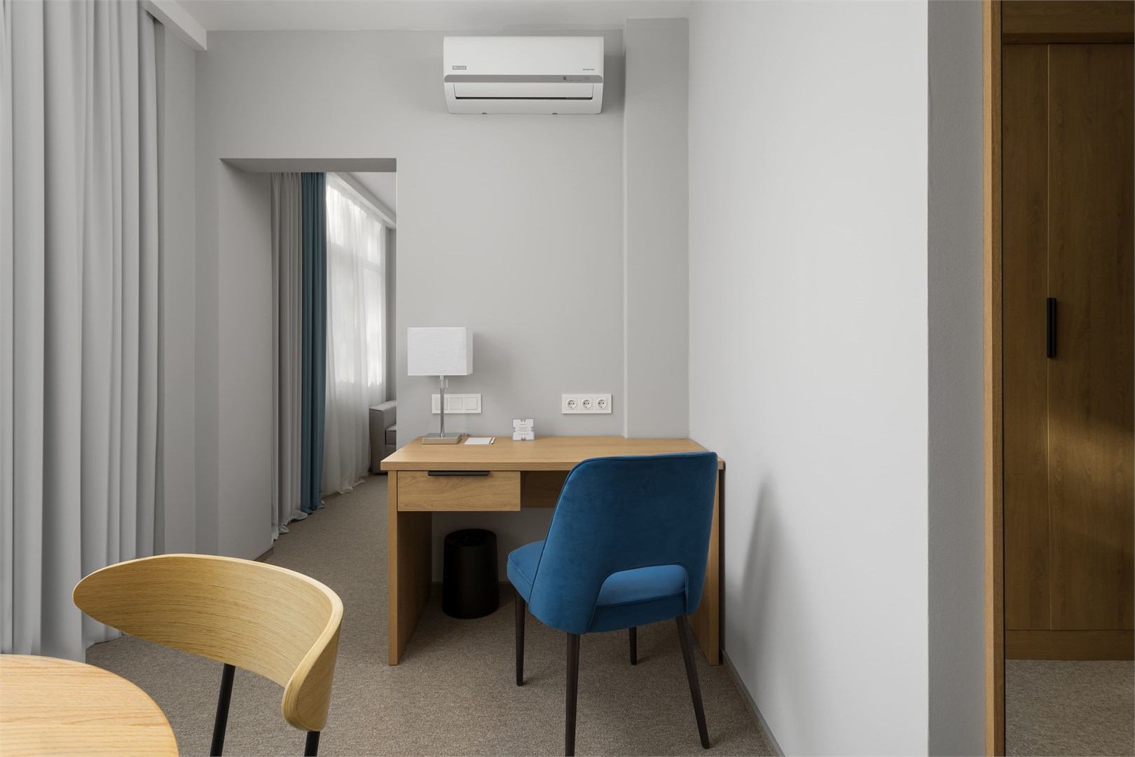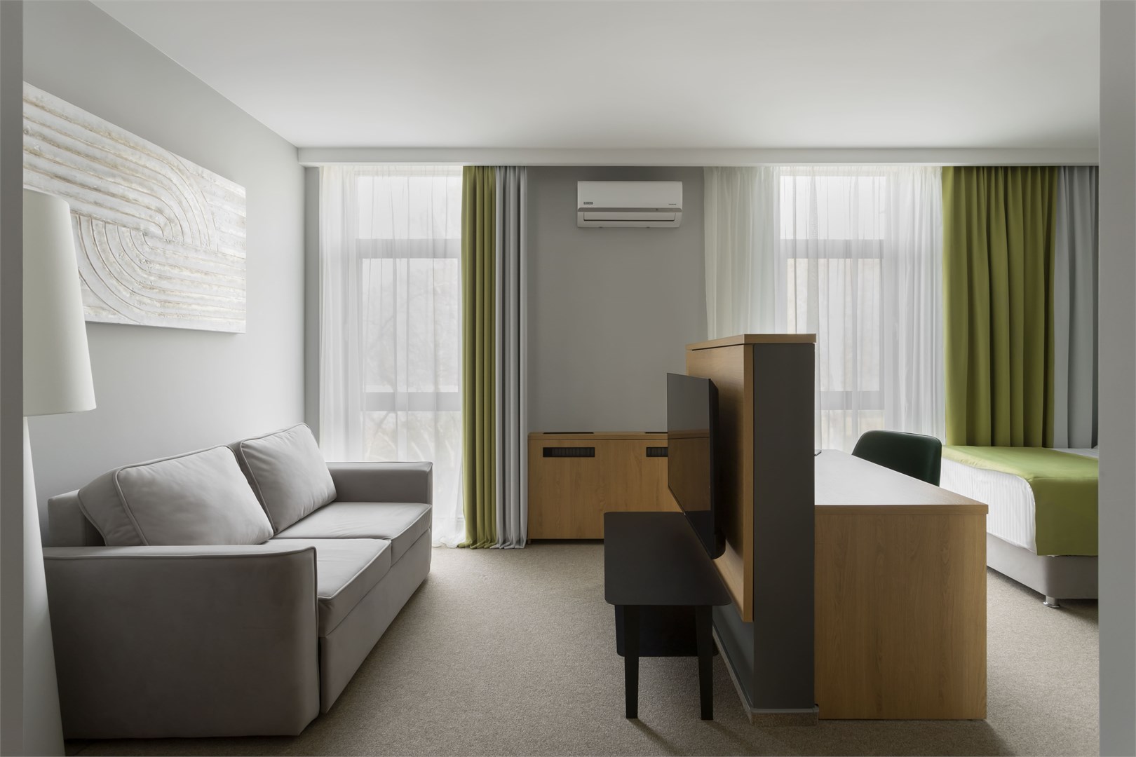 В номере: вешалка, диван раскладной, кровати полутороспальные, прикроватные тумбочки, стол, стулья, шкаф, гладильная доска, мини-холодильник, сейф, сплит-система, телевизор, телефон, утюг, чайная станция, чайник, чайный набор посуды
