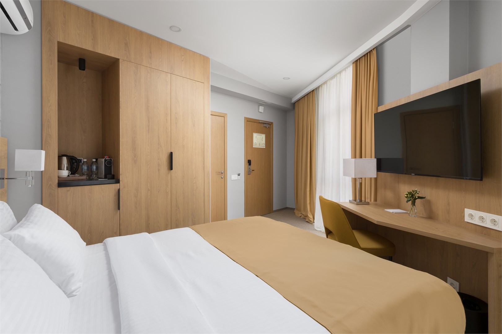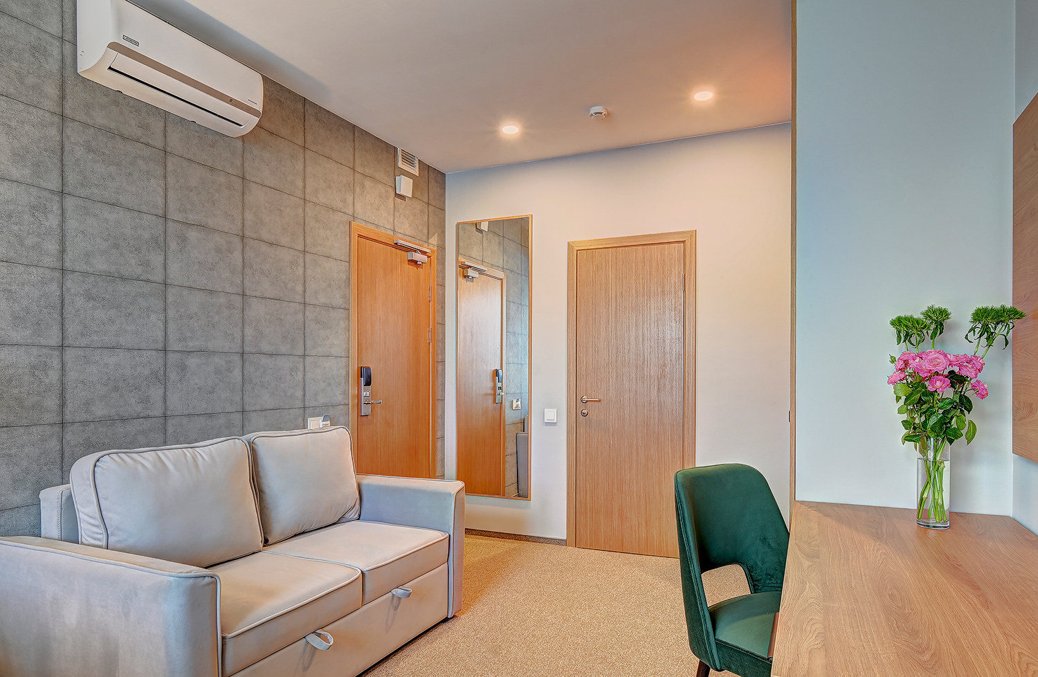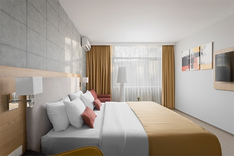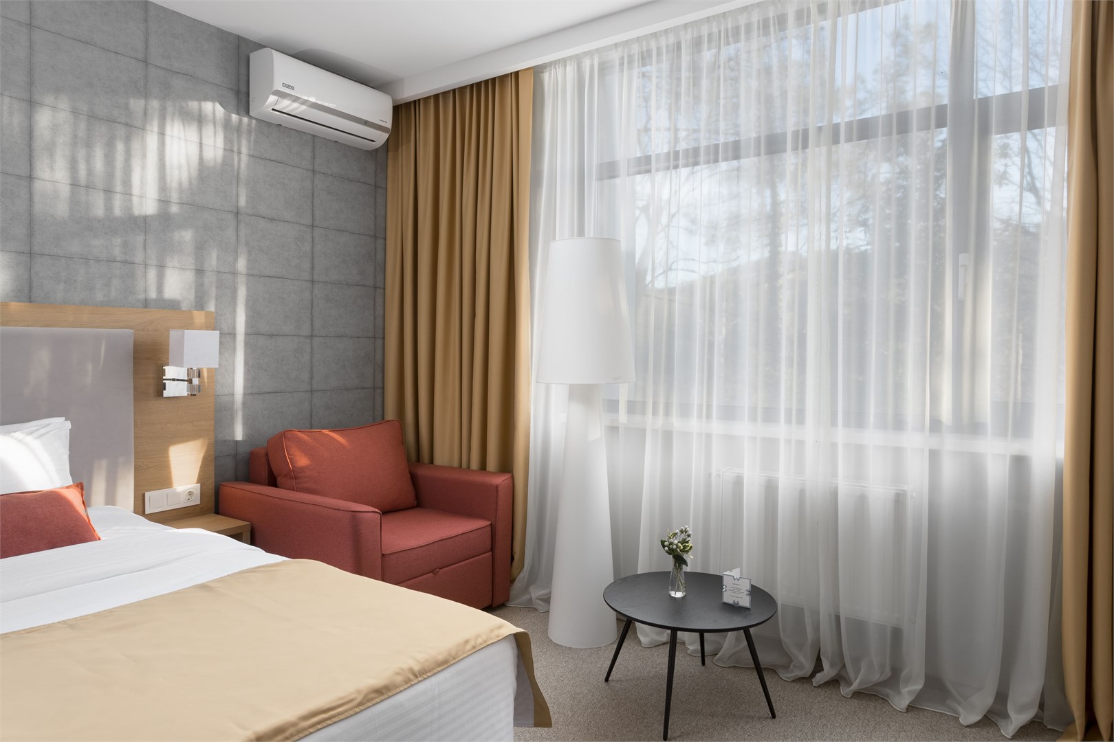 В номере: зеркало, кресло-кровать, кровать двуспальная, стол, стул, шкаф, кофемашина, мини-холодильник, пляжные полотенца, сейф, сплит-система, телевизор, телефон, утюг, электрочайник
