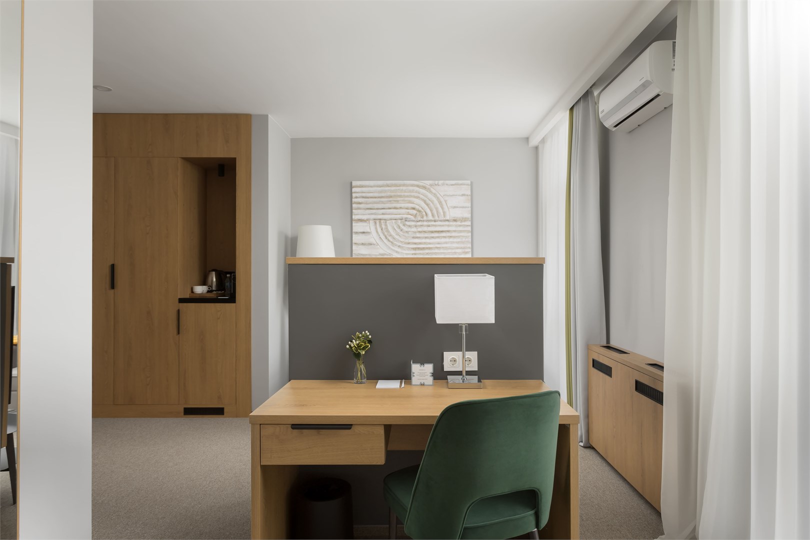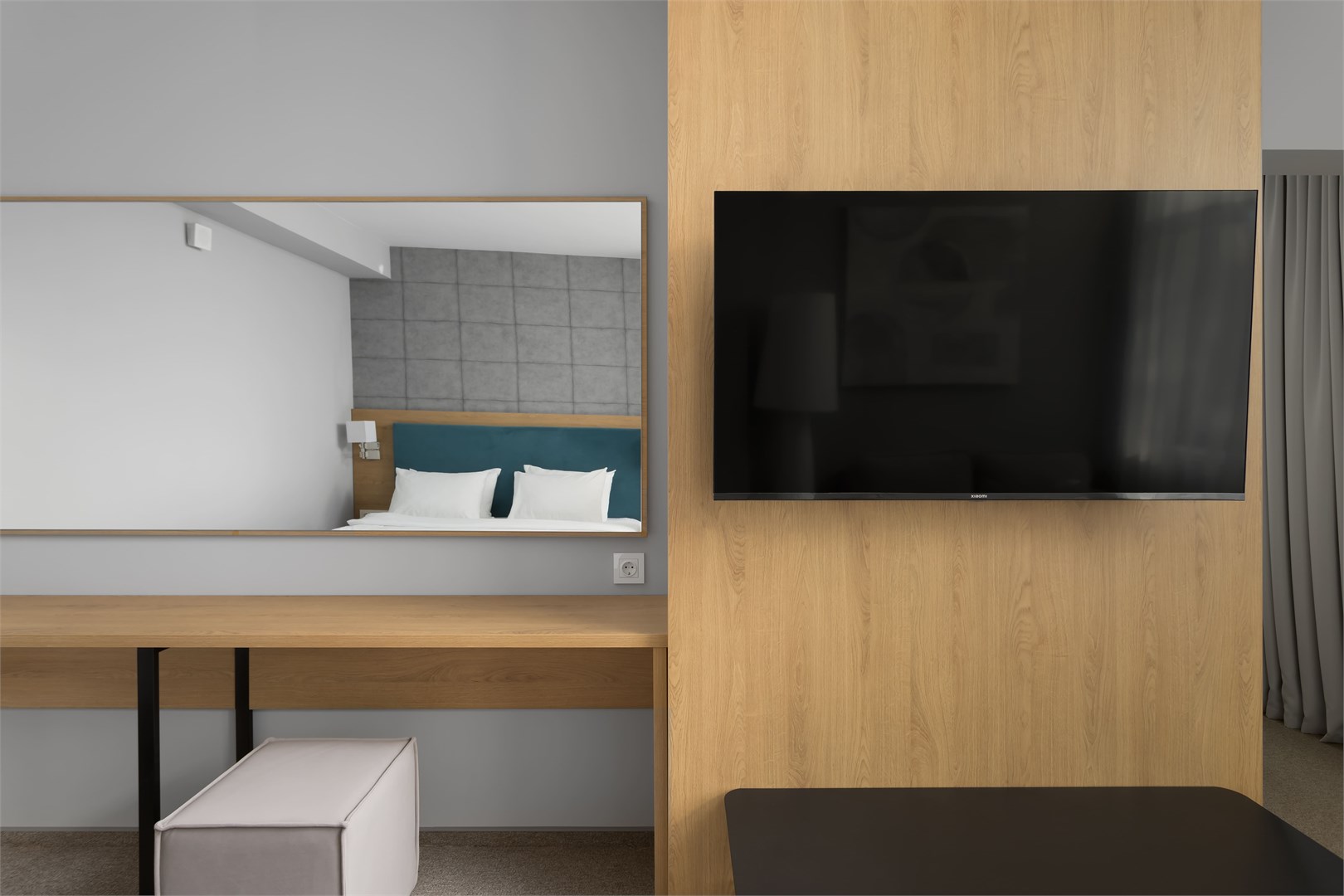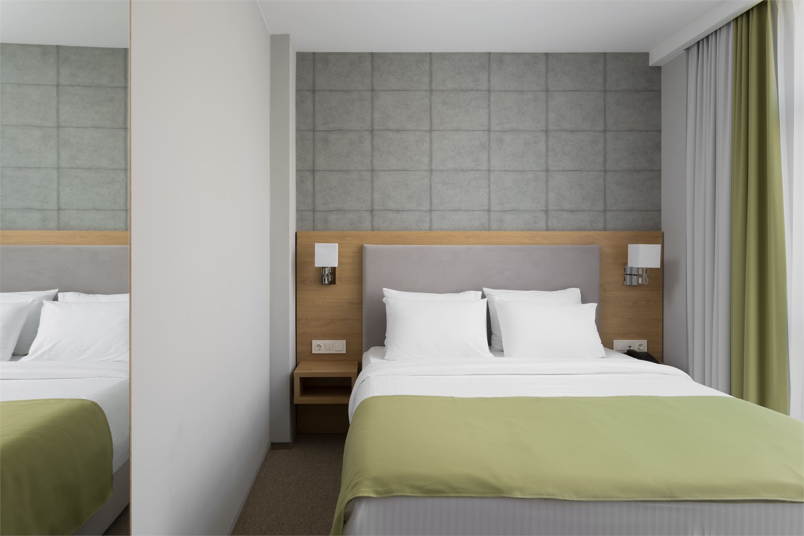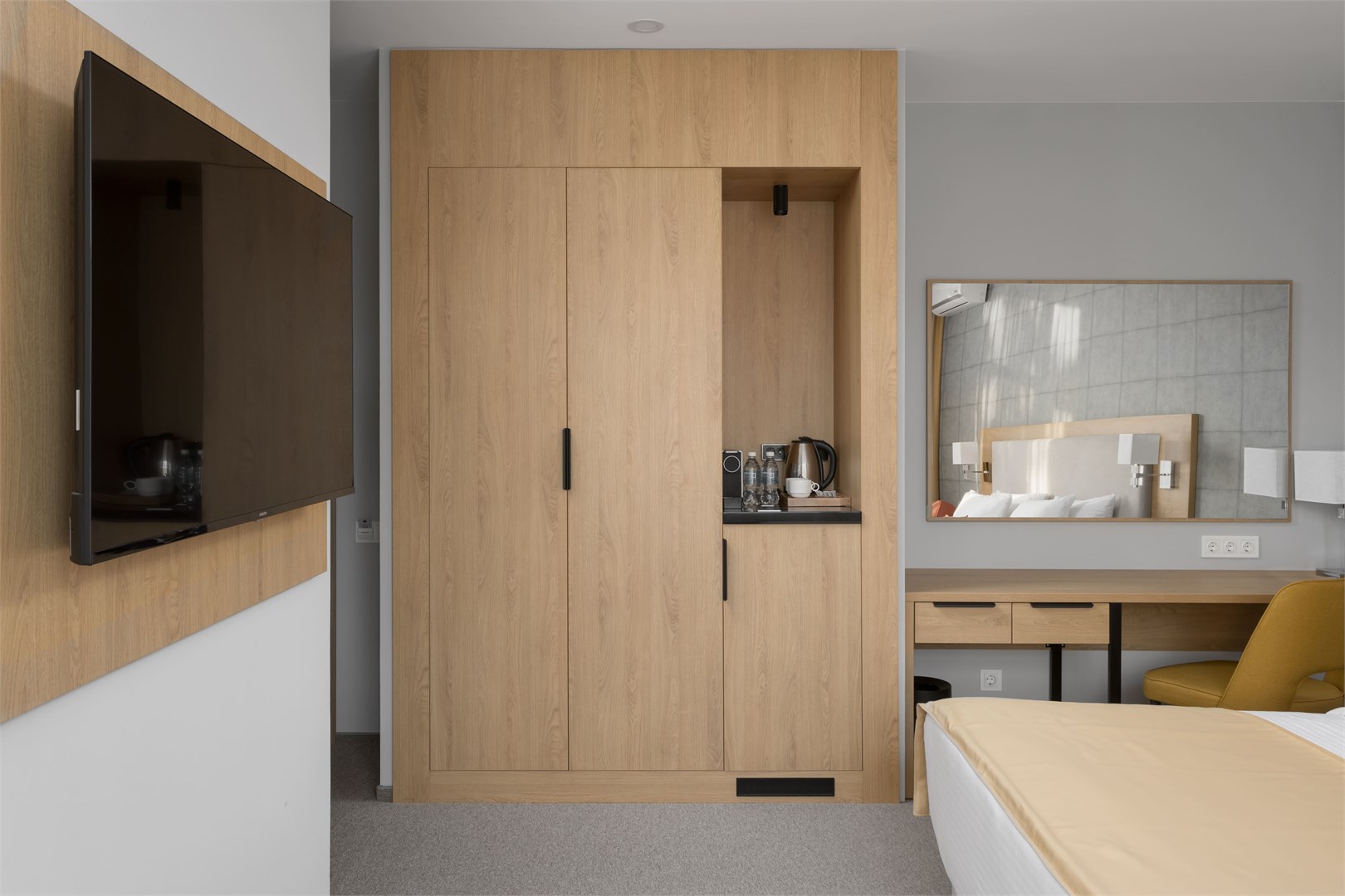 В номере: зеркало, кресло-кровать, кровать двуспальная, стол, стул, шкаф, кофемашина, мини-холодильник, пляжные полотенца, сейф, сплит-система, телевизор, телефон, утюг, электрочайник