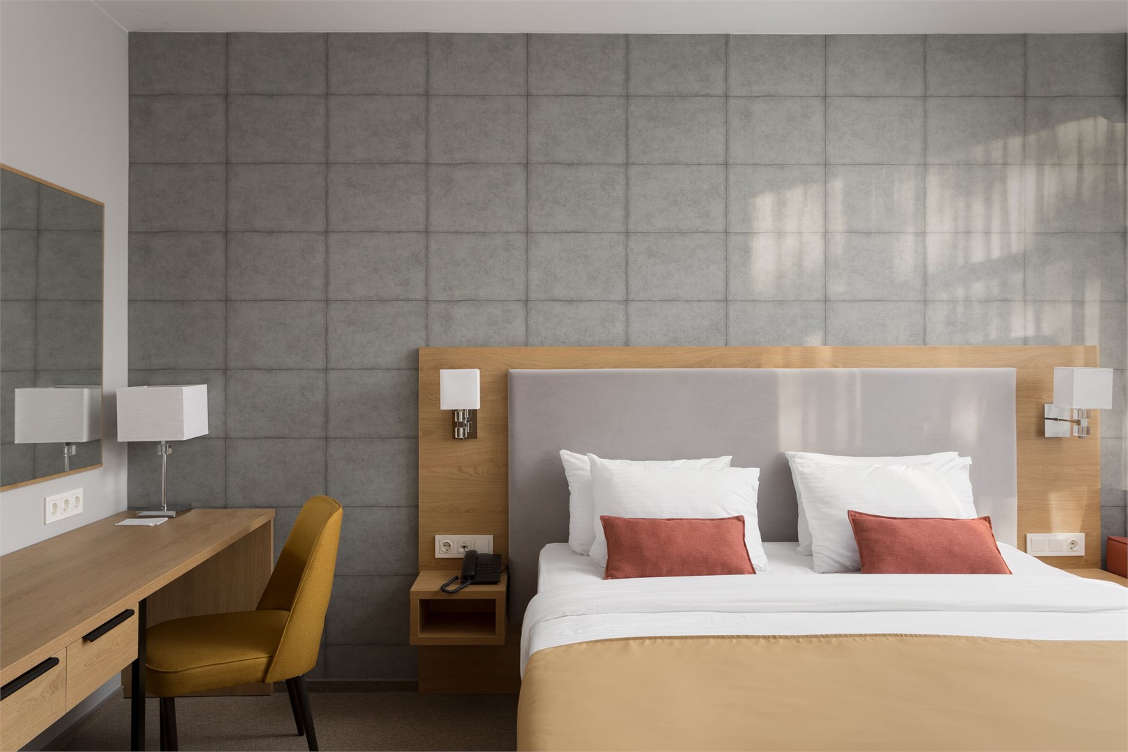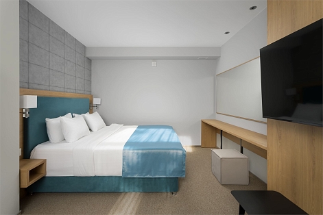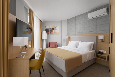 В номере: зеркало, кресло, кровать двуспальная, прикроватные тумбочки, стол, стул, шкаф встроенный, мини-холодильник, пляжные полотенца, сейф, сплит-система, телевизор, телефон, утюг, электрочайник