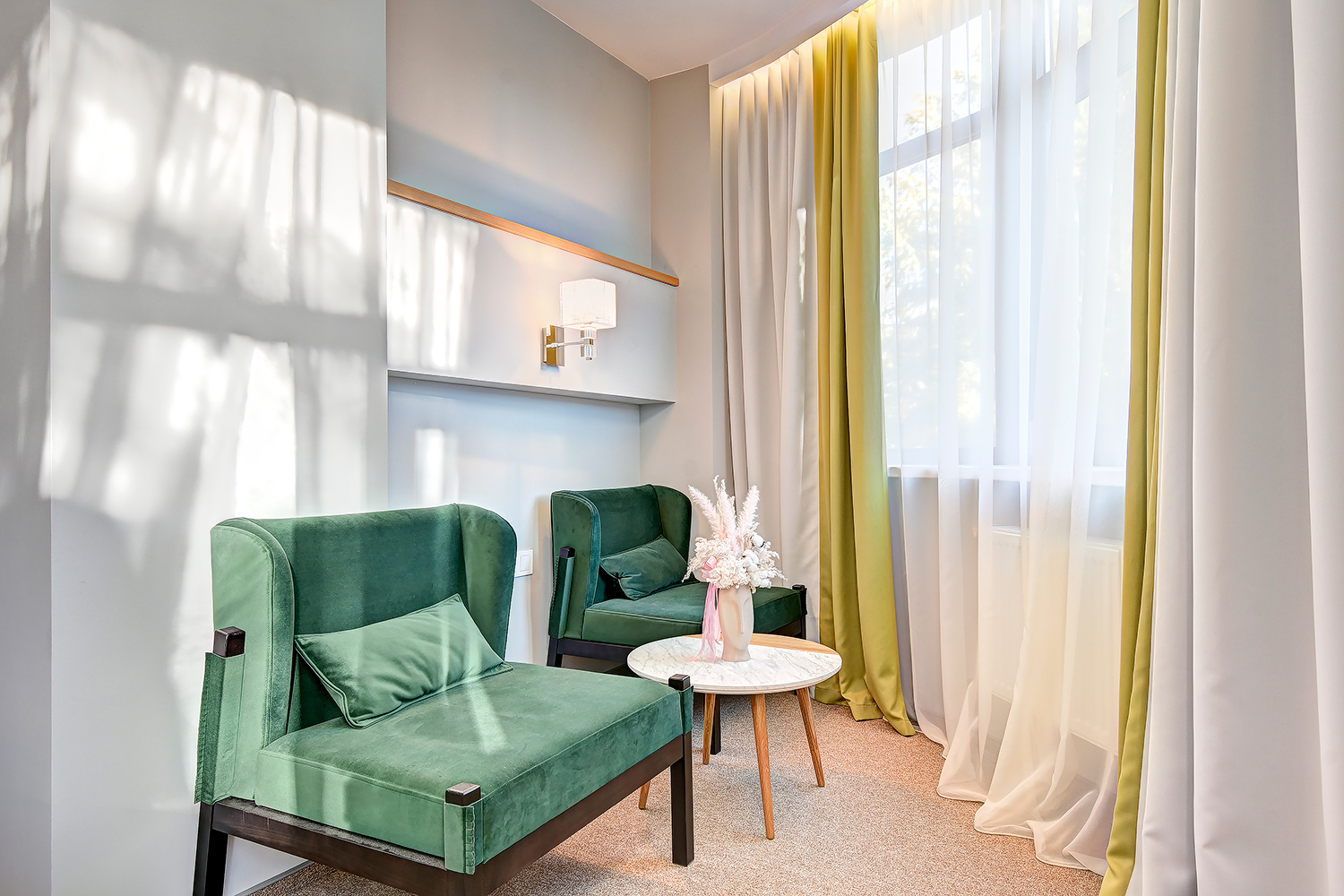 В номере: диван раскладной, зеркало, кресла, кровать двуспальная, прикроватные тумбочки, стол, стул, шкаф встроенный, кофемашина, микроволновая печь, пляжные полотенца, сейф, сплит-система, телевизор, телефон, утюг, электрочайник