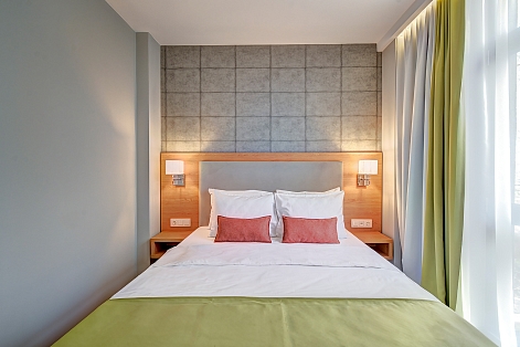 В номере: диван раскладной, зеркало, кровать двуспальная, прикроватные тумбочки, стол, стулья, шкаф встроенный, кофемашина, мини-холодильник, пляжные полотенца, сейф, сплит-система, телевизор, телефон, утюг, электрочайник