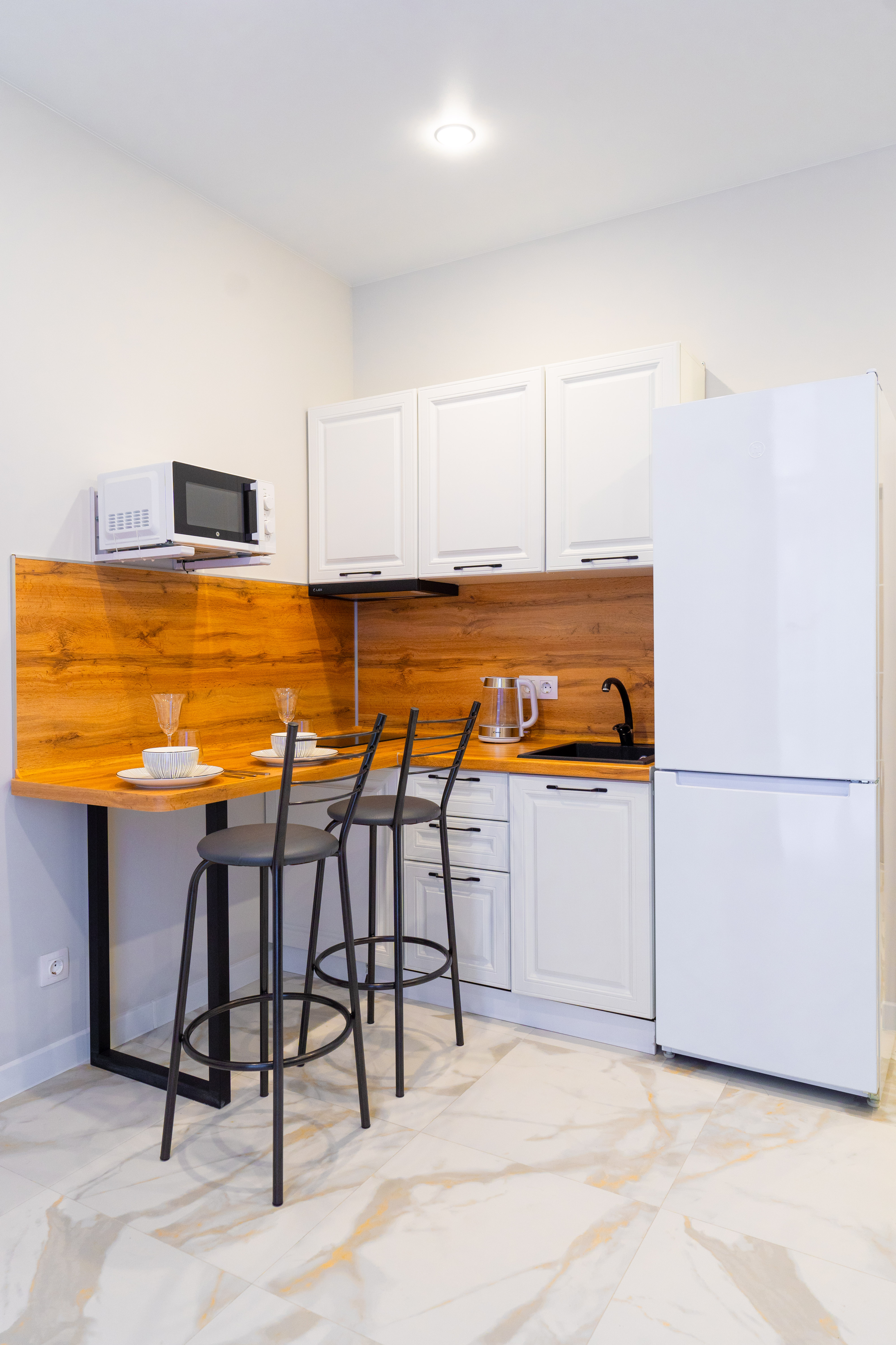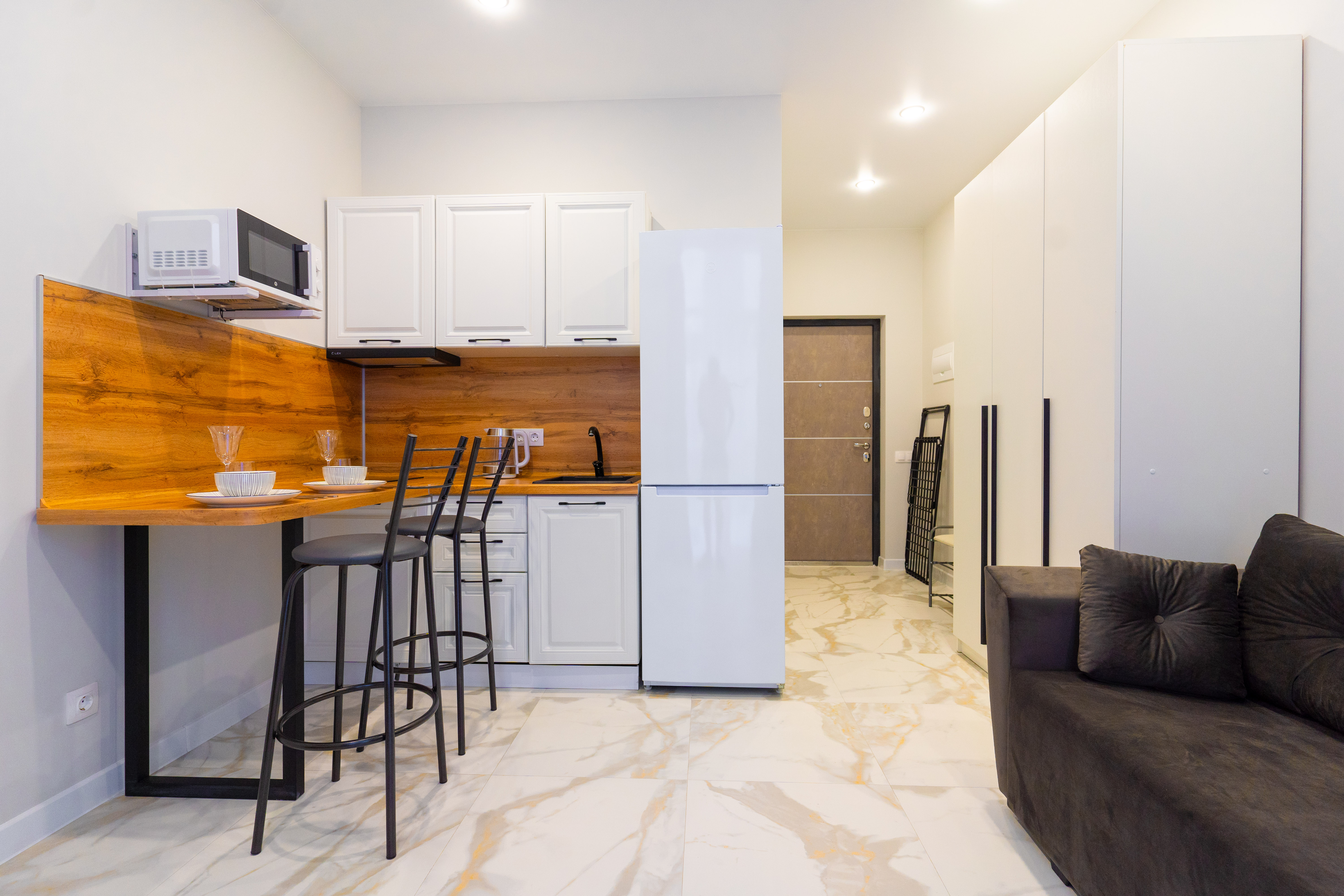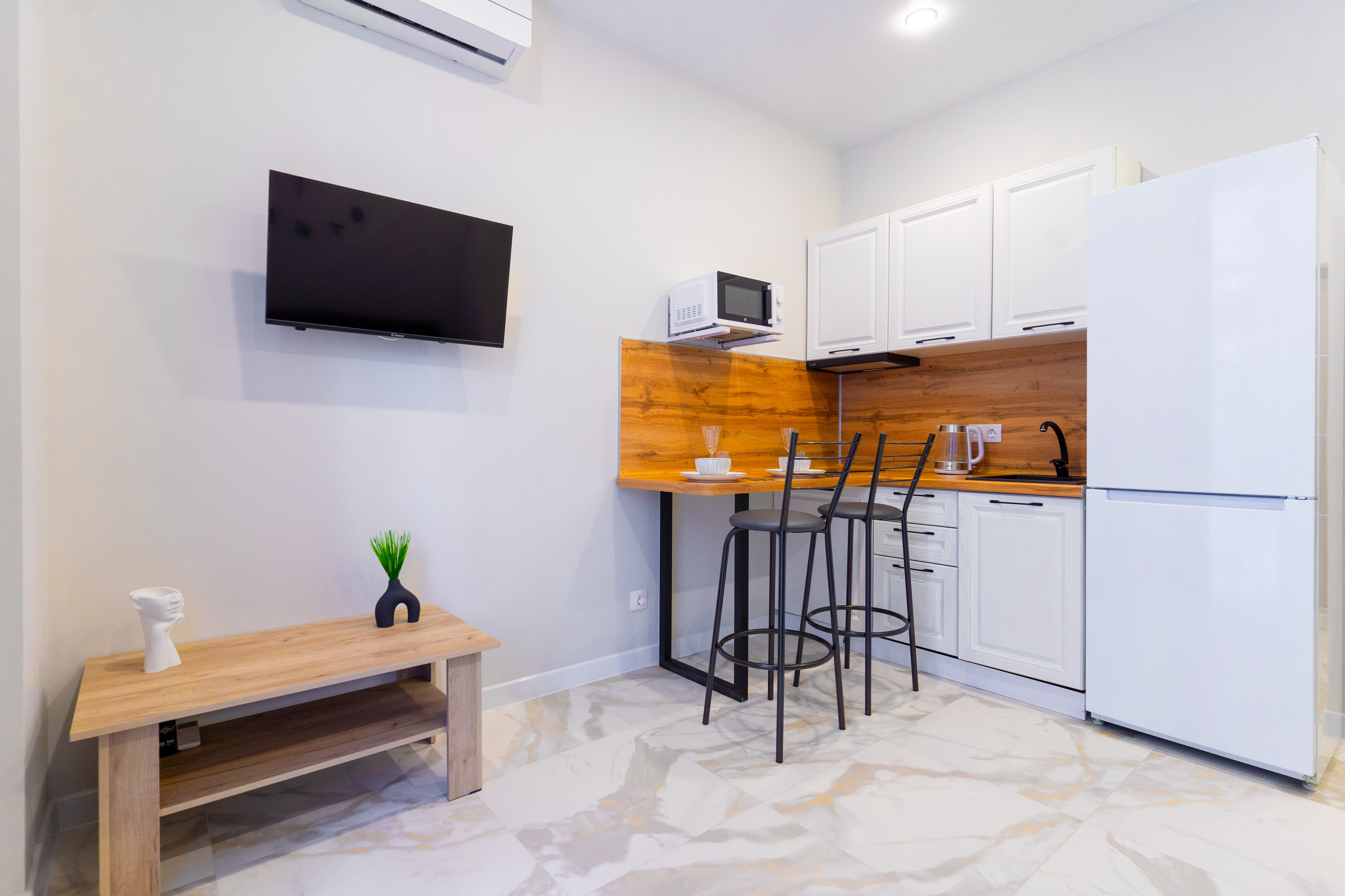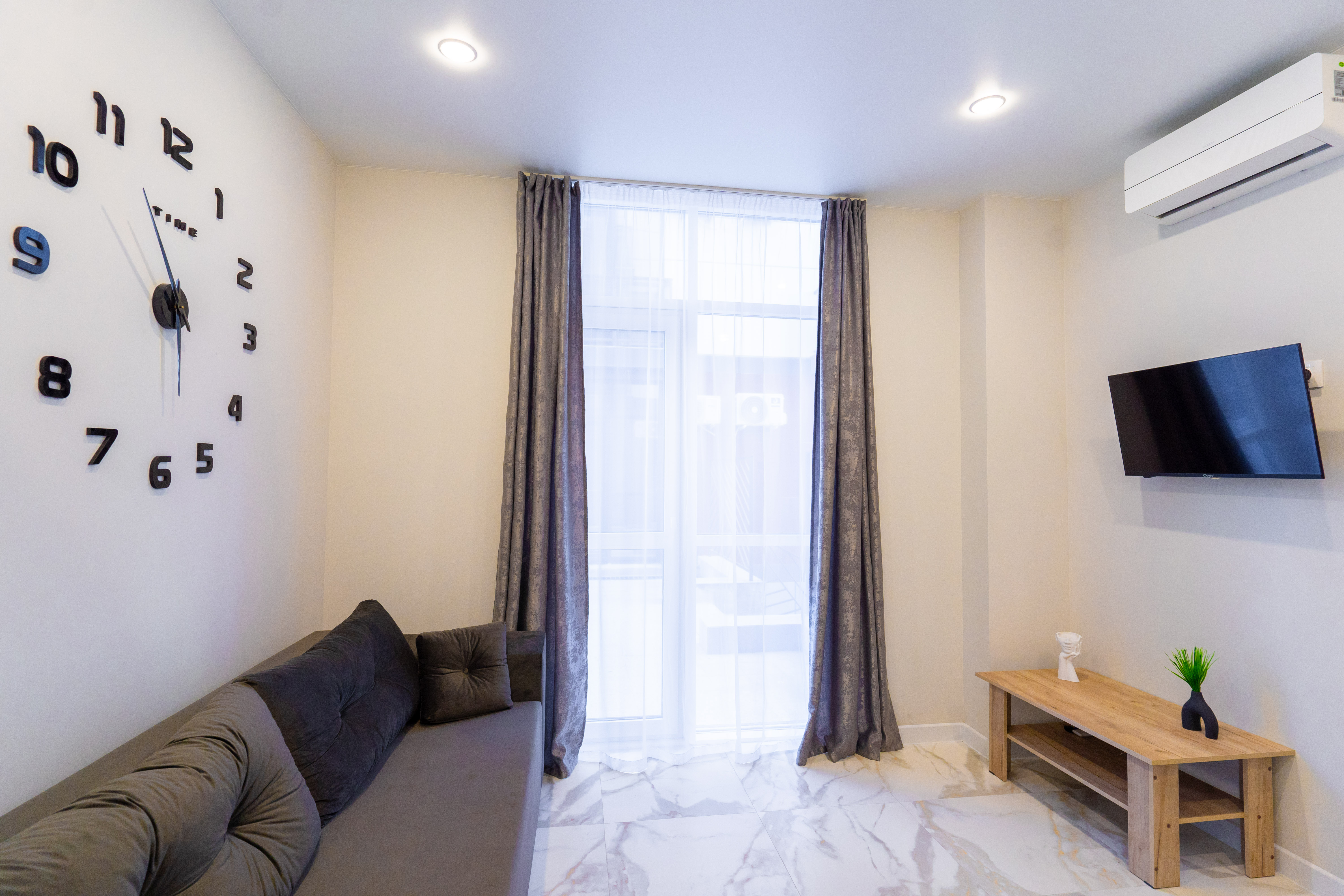 В номере: диван раскладной, стол, столик журнальный, стулья, шкаф, гладильная доска, микроволновая печь, набор посуды, плита электрическая, сплит-система, стиральная машина, телевизор, утюг, холодильник, чайник