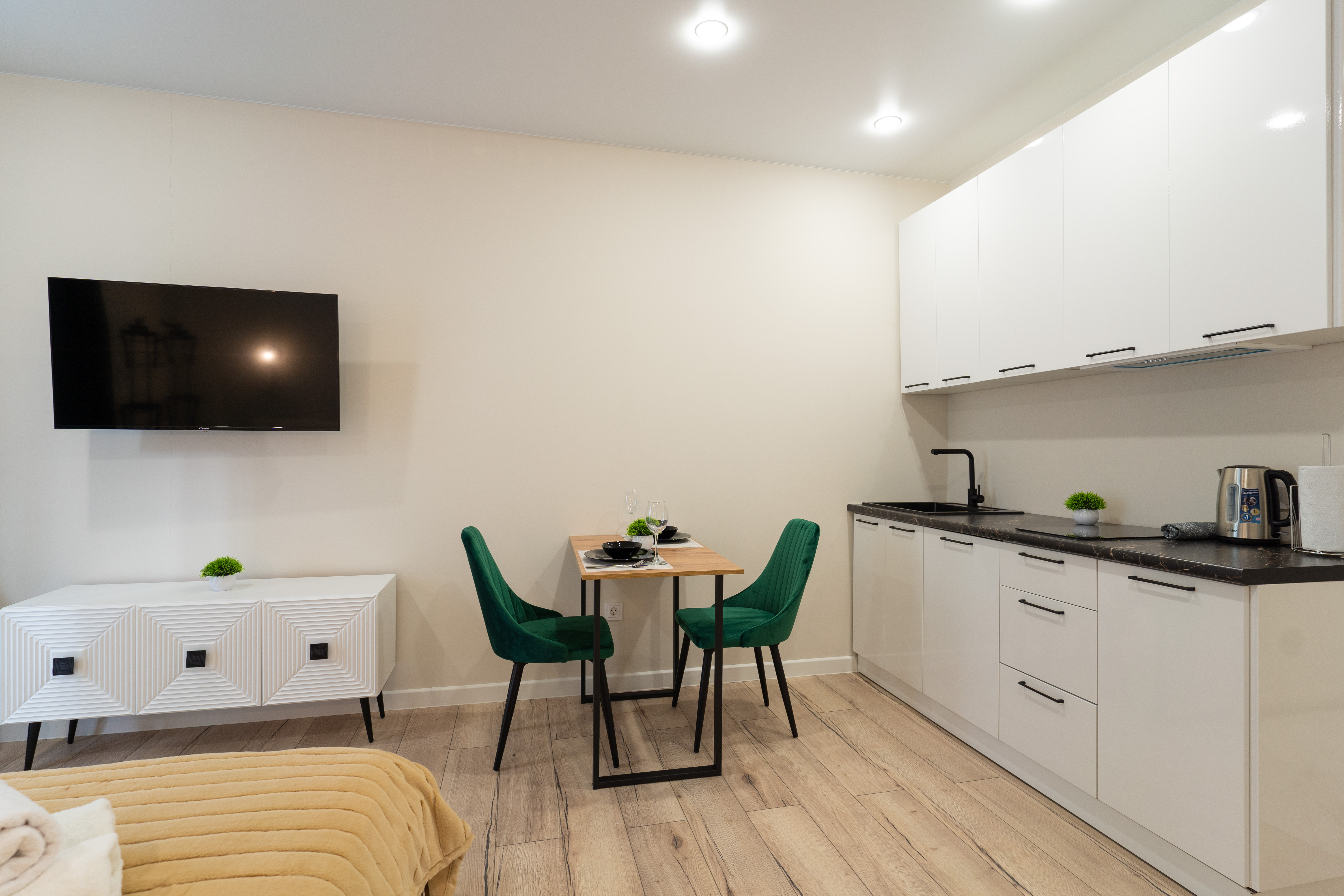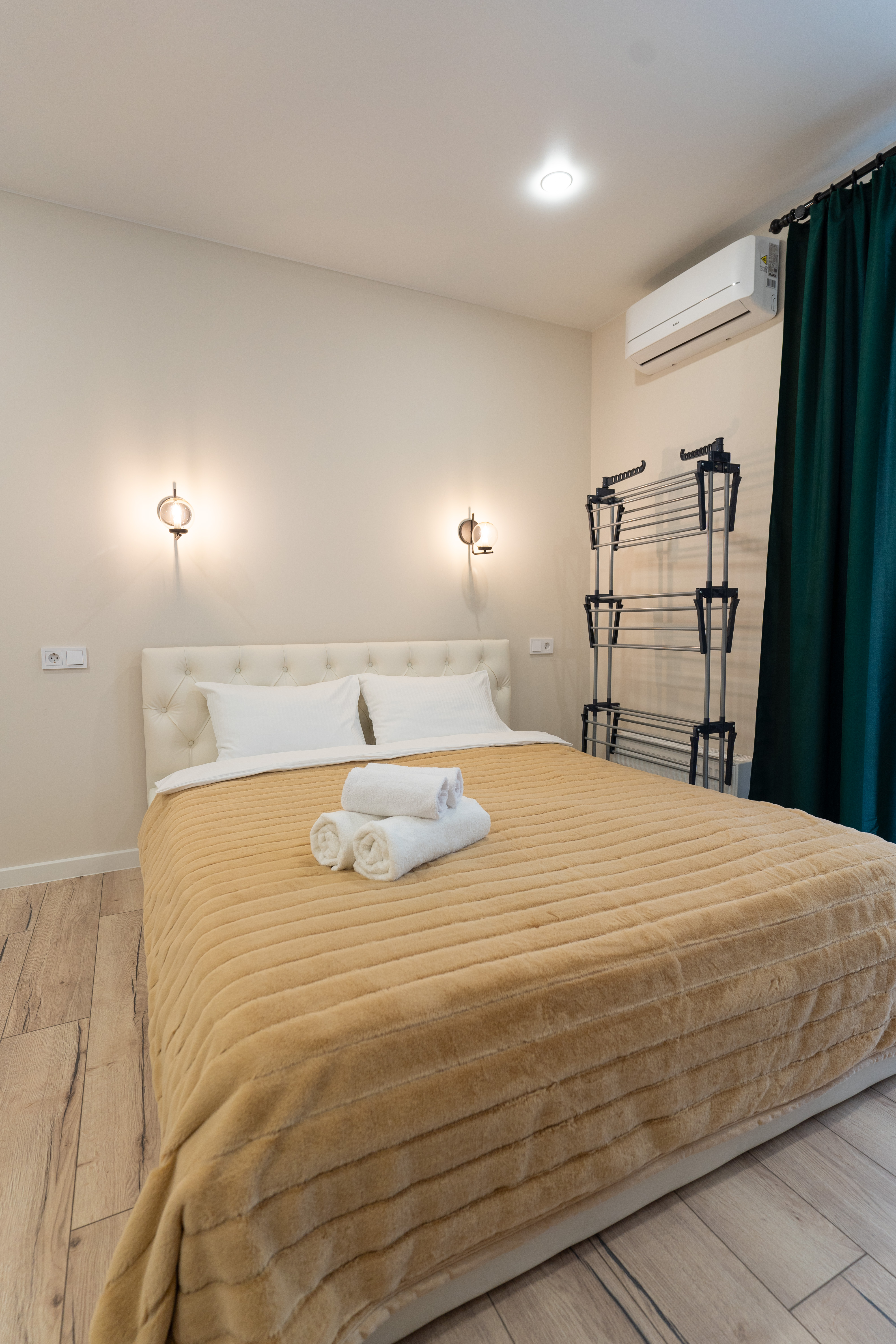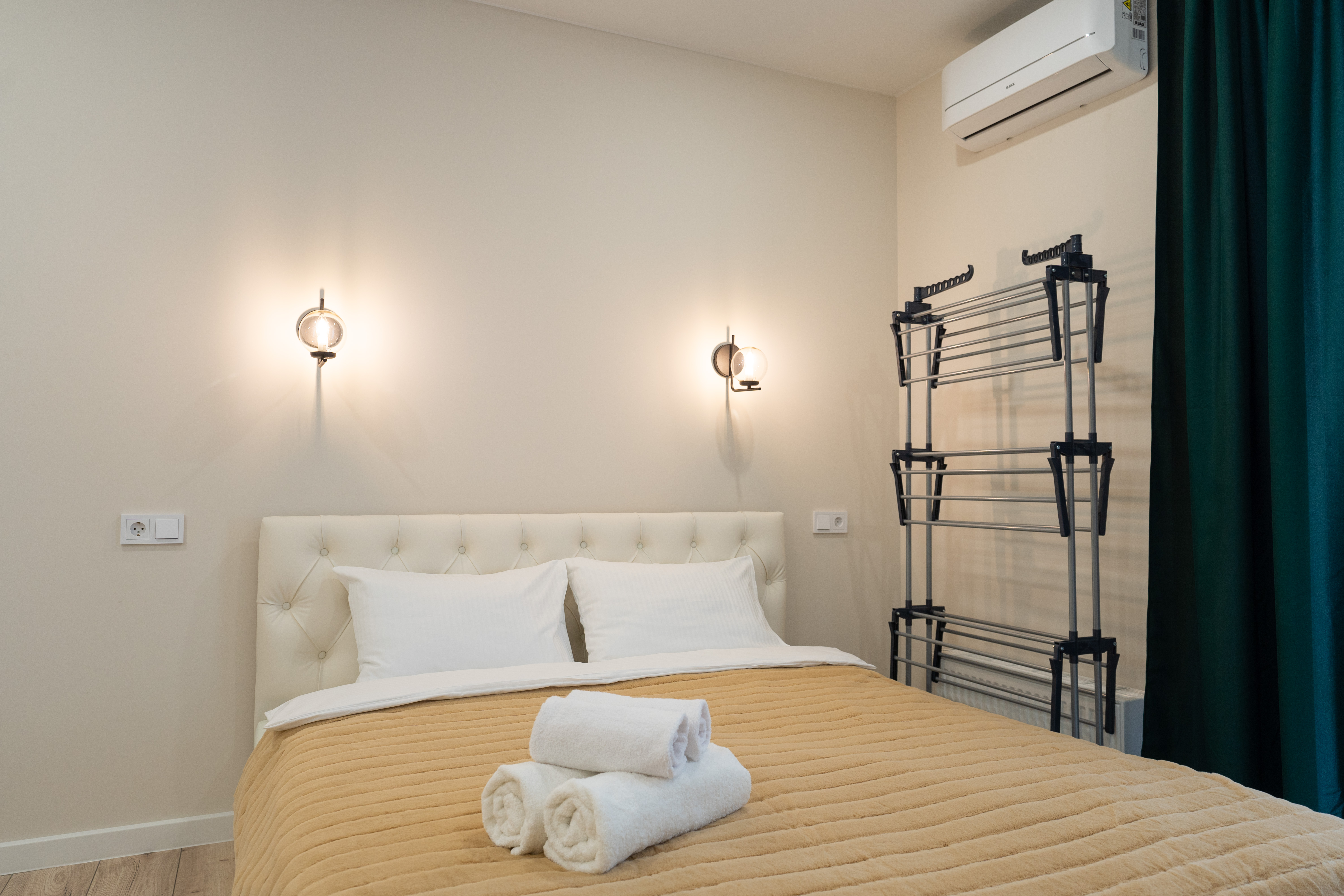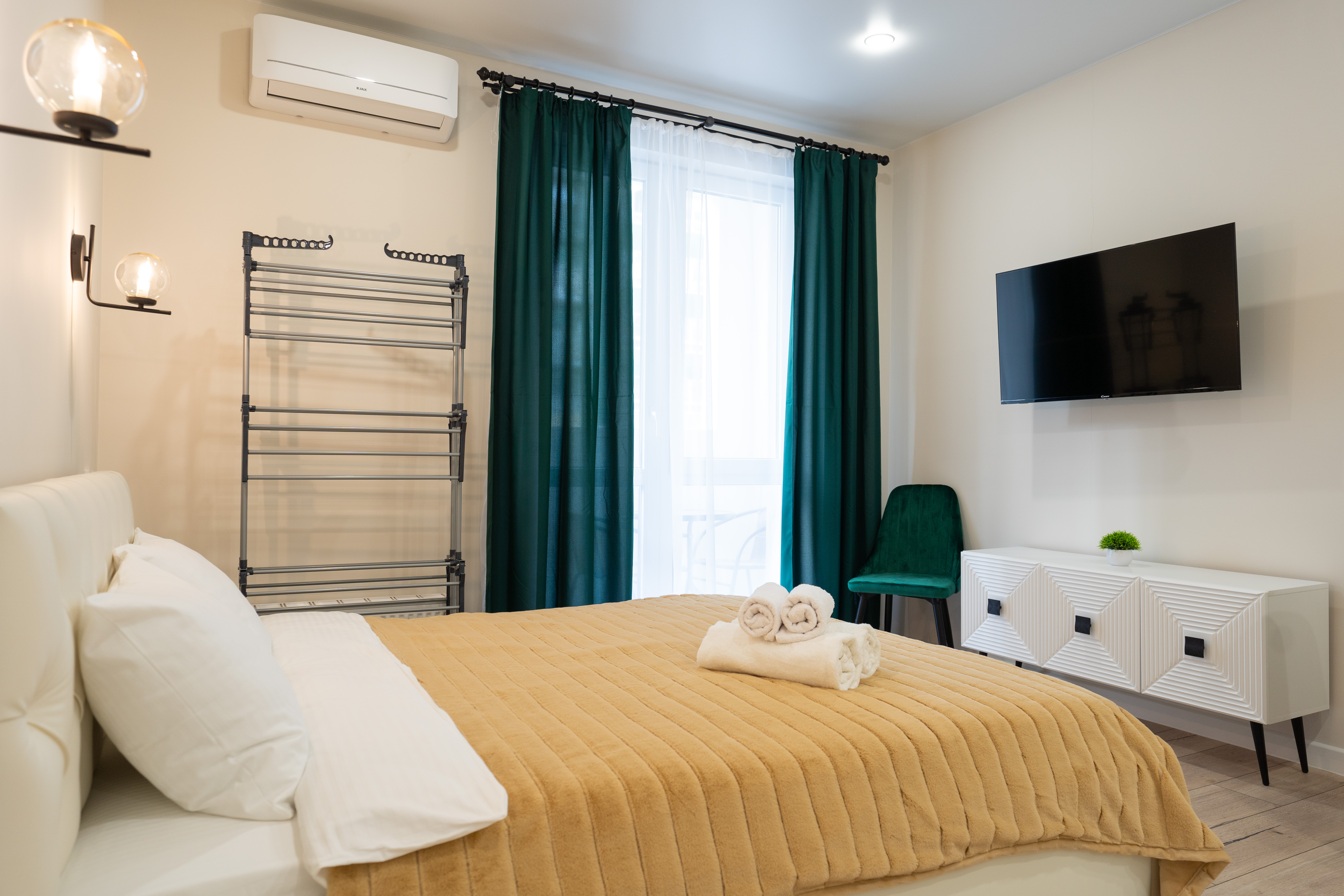 В номере: вешалка, зеркало, кровать двуспальная, стол, стулья, гладильная доска, микроволновая печь, набор посуды, посудомоечная машина, сейф, сплит-система, стиральная машина, телевизор, утюг, холодильник, чайник