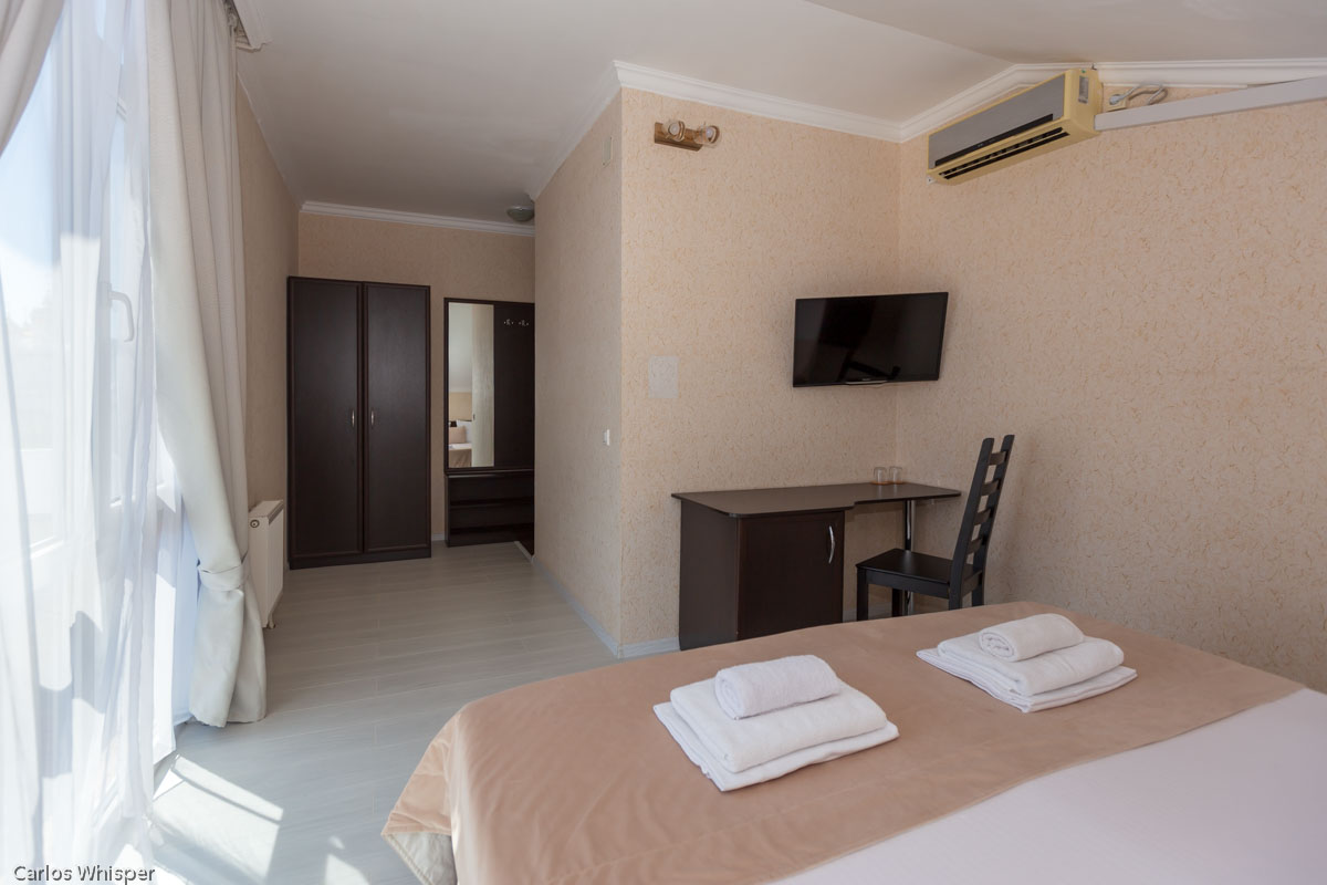 В номере: вешалка, кровать двуспальная, прикроватные тумбочки, стол, стул, шкаф, кондиционер, сейф, телевизор, холодильник
