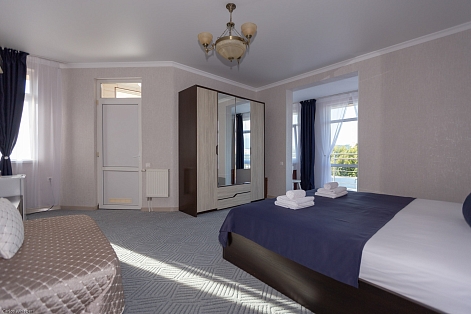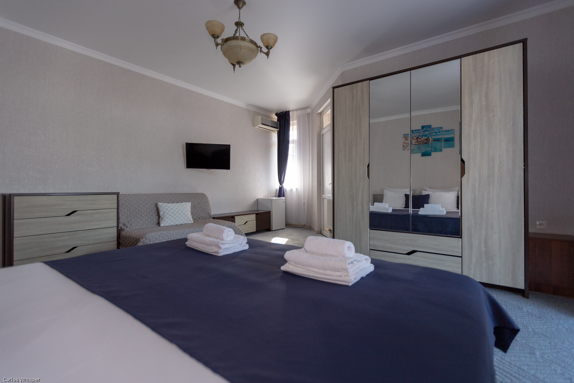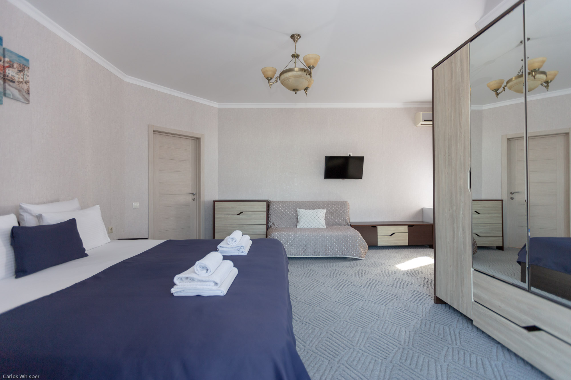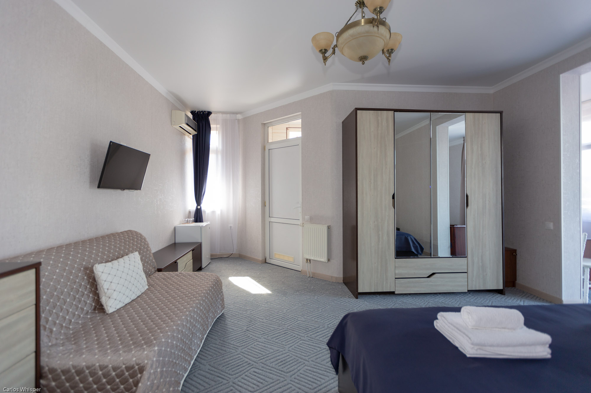 В номере: вешалка, диван, комод, кровати односпальные, кровать двуспальная, прикроватные тумбочки, стулья, шкаф, кондиционер, сейф, телевизор, холодильник