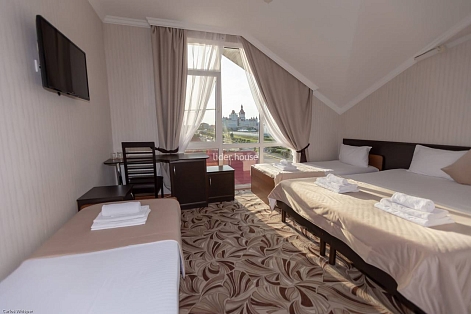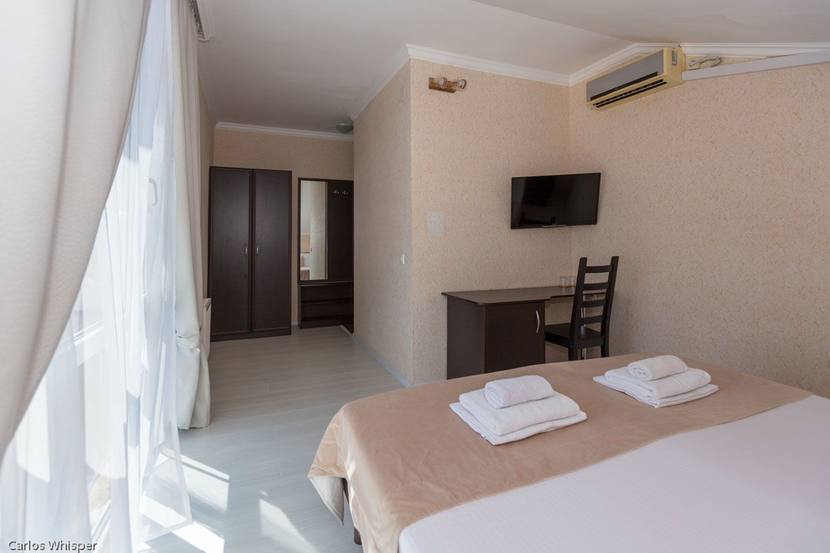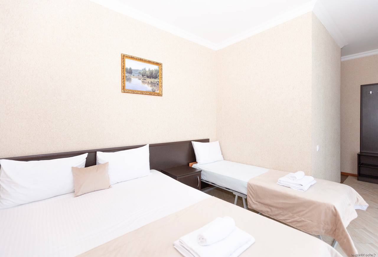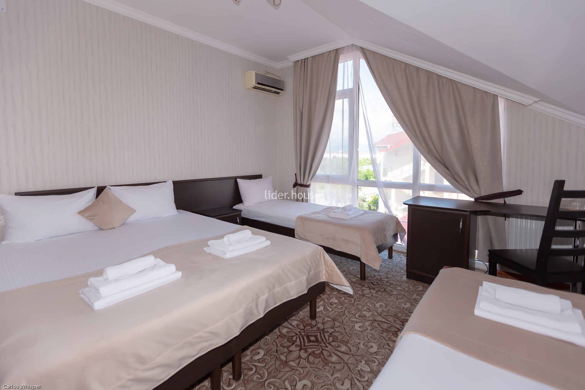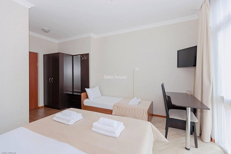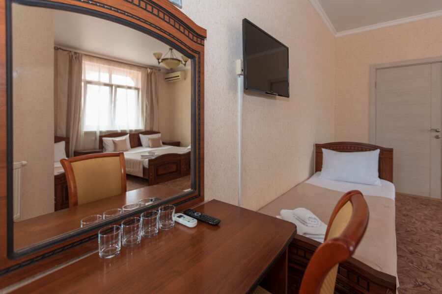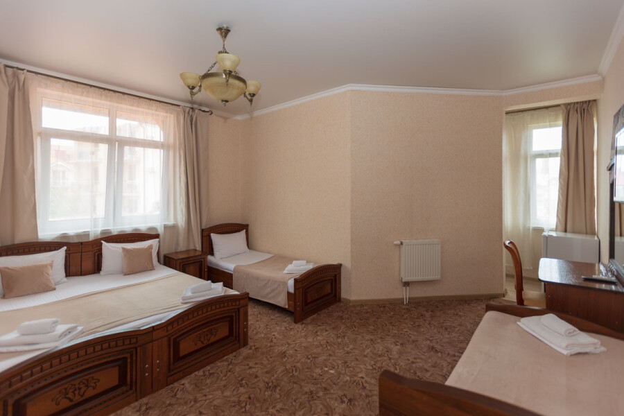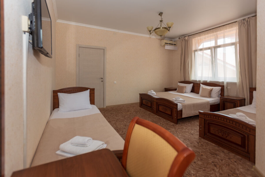 В номере: вешалка, кровать двуспальная, кровать односпальная, прикроватные тумбочки, стол, стул, шкаф, кондиционер, сейф, телевизор, холодильник