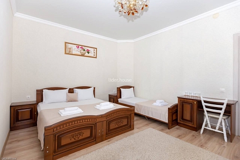 В номере: вешалка, кровать двуспальная, кровать односпальная, прикроватные тумбочки, стол, стул, шкаф, компьютер, сейф, телевизор, холодильник