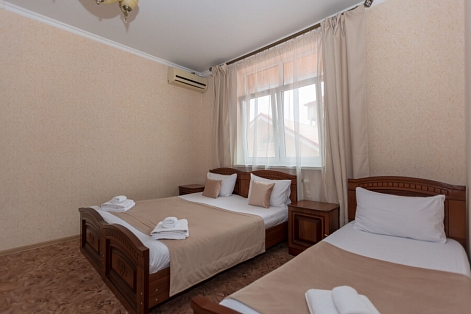 В номере: кровати полутороспальные, кровать двуспальная, прикроватные тумбочки, стол, стул, шкаф, кондиционер, сейф, телевизор, холодильник
