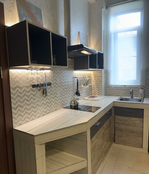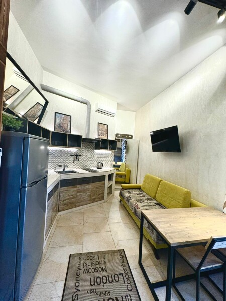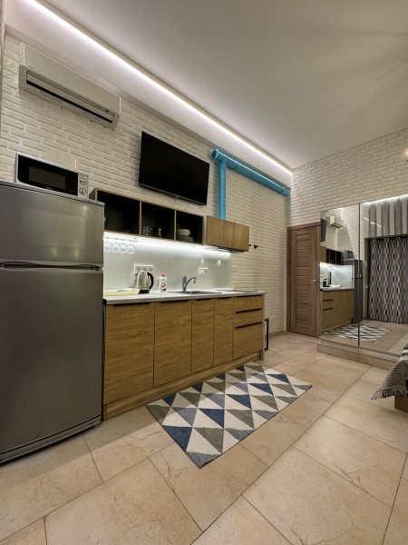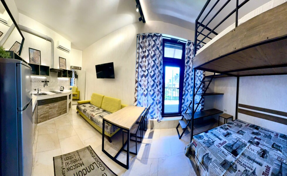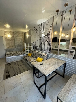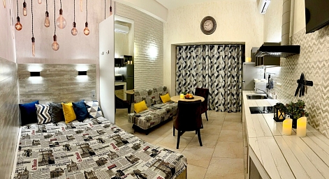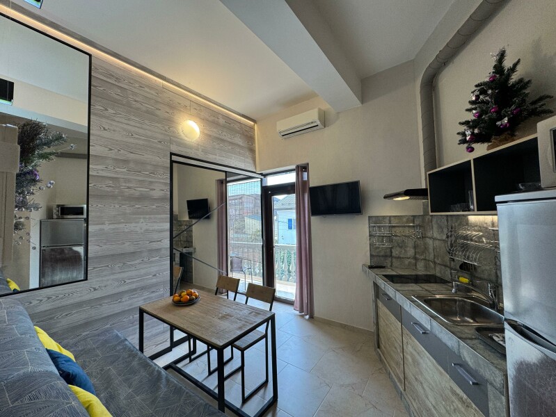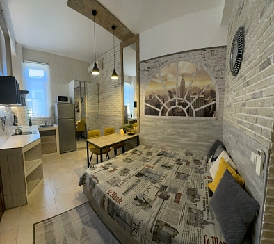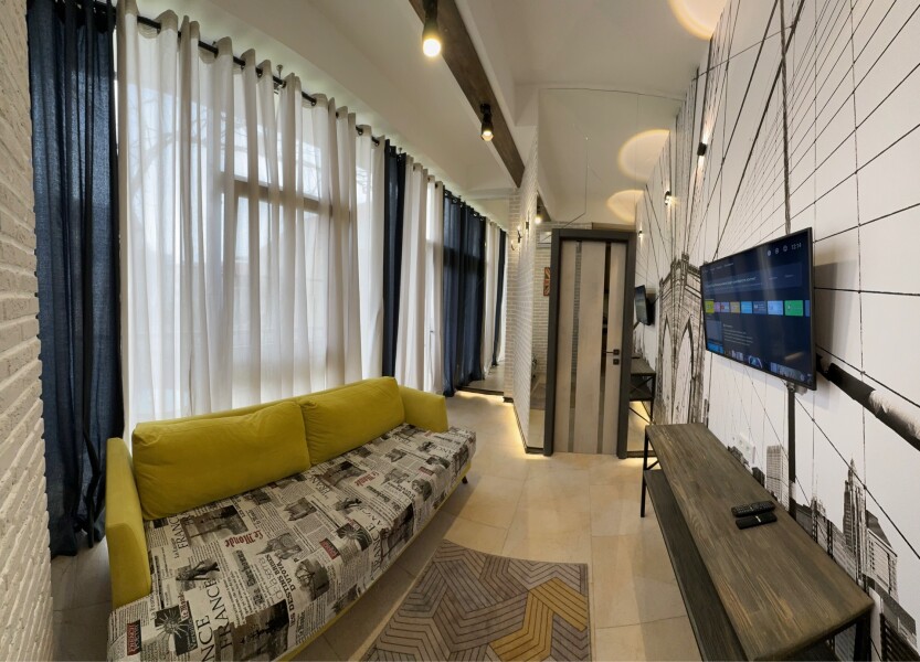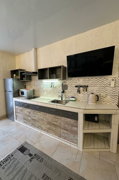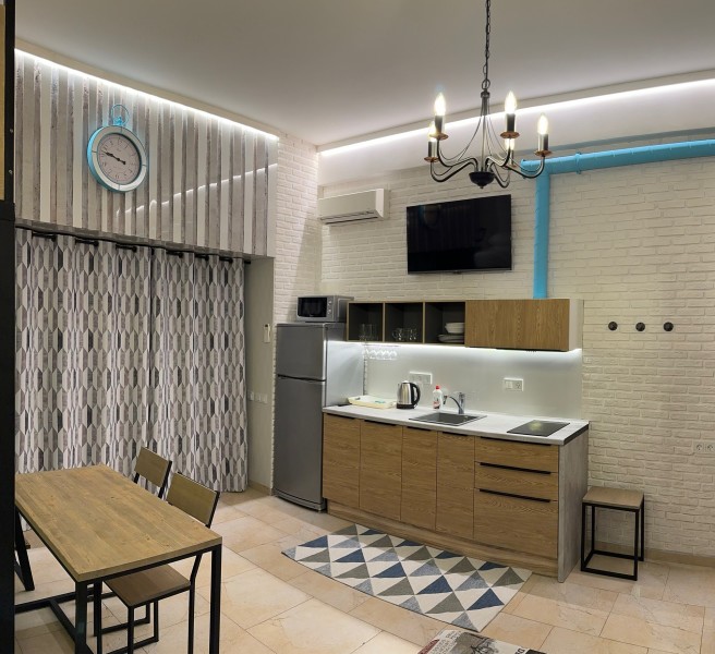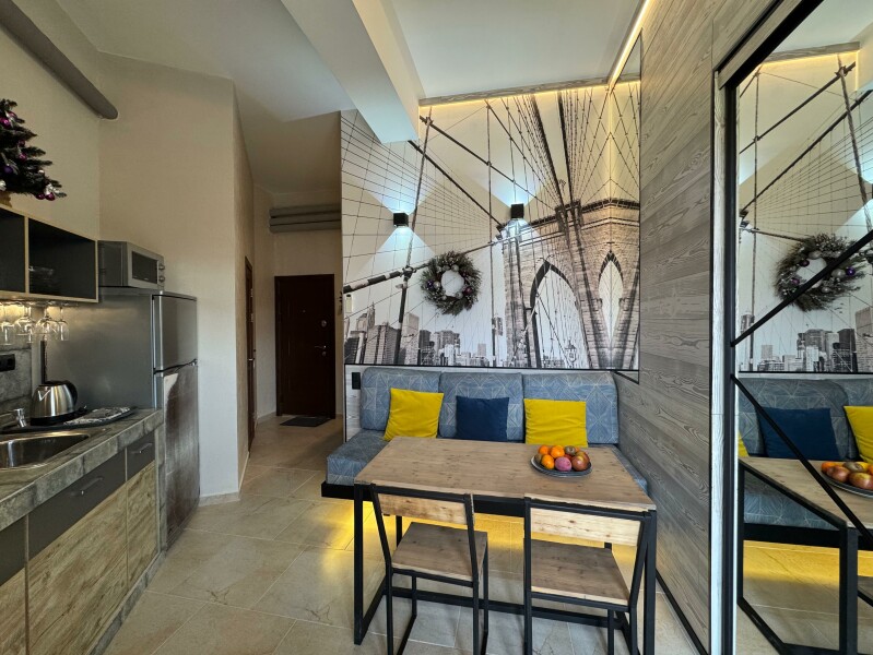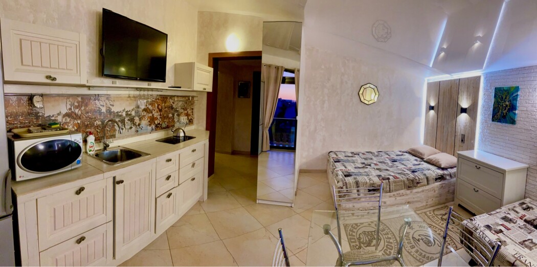 В номере: вешалка, диван, зеркало, кровать двуспальная, стол, стул, стулья, шкаф, микроволновая печь, набор посуды, плита электрическая, сплит-система, телевизор, холодильник, электрочайник