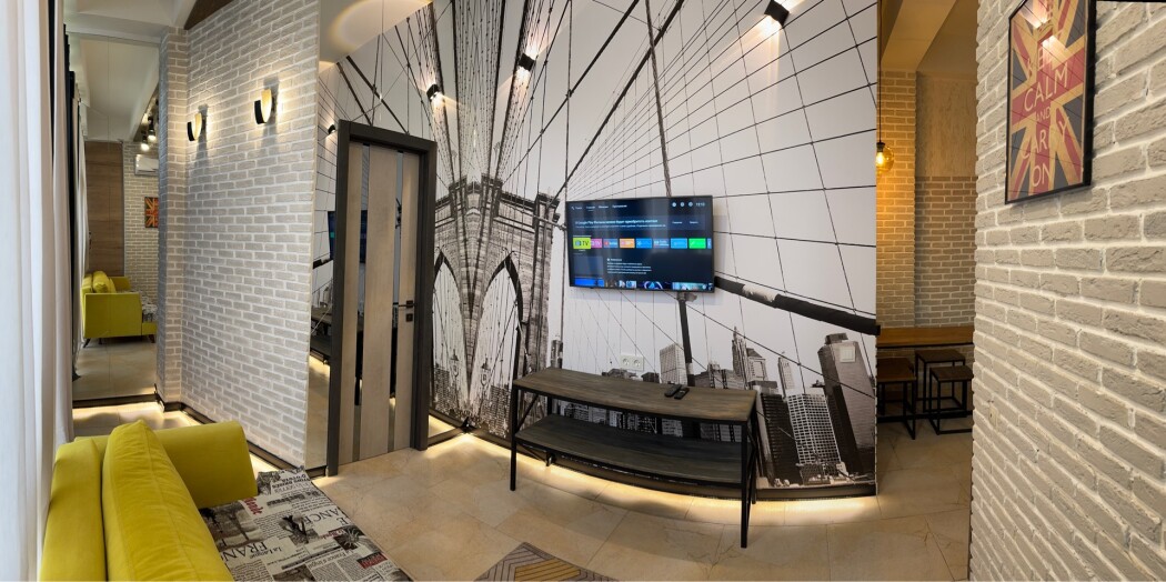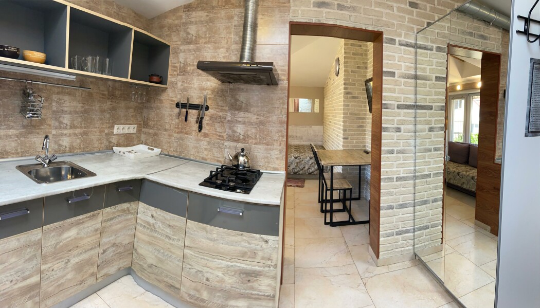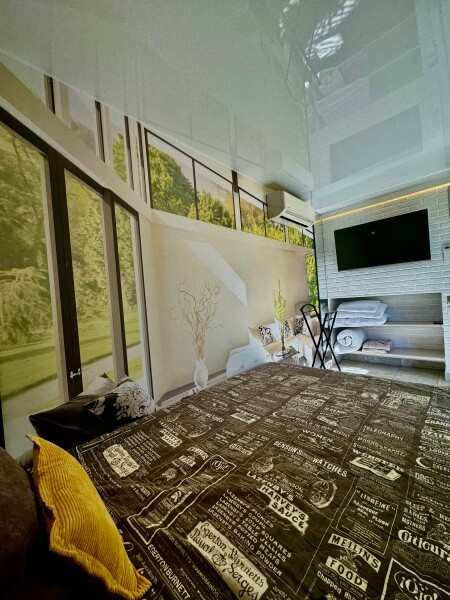 В номере: вешалка, диван, зеркало, кровать двуспальная, стол, стулья, шкаф, микроволновая печь, набор посуды, плита электрическая, сплит-система, телевизор, холодильник, электрочайник