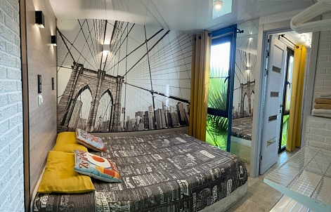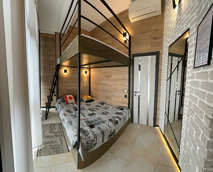 В номере: вешалка, диван, зеркало, кровать двуспальная, кровать односпальная, стол, стулья, шкаф, микроволновая печь, набор посуды, плита электрическая, сплит-система, телевизор, холодильник, электрочайник