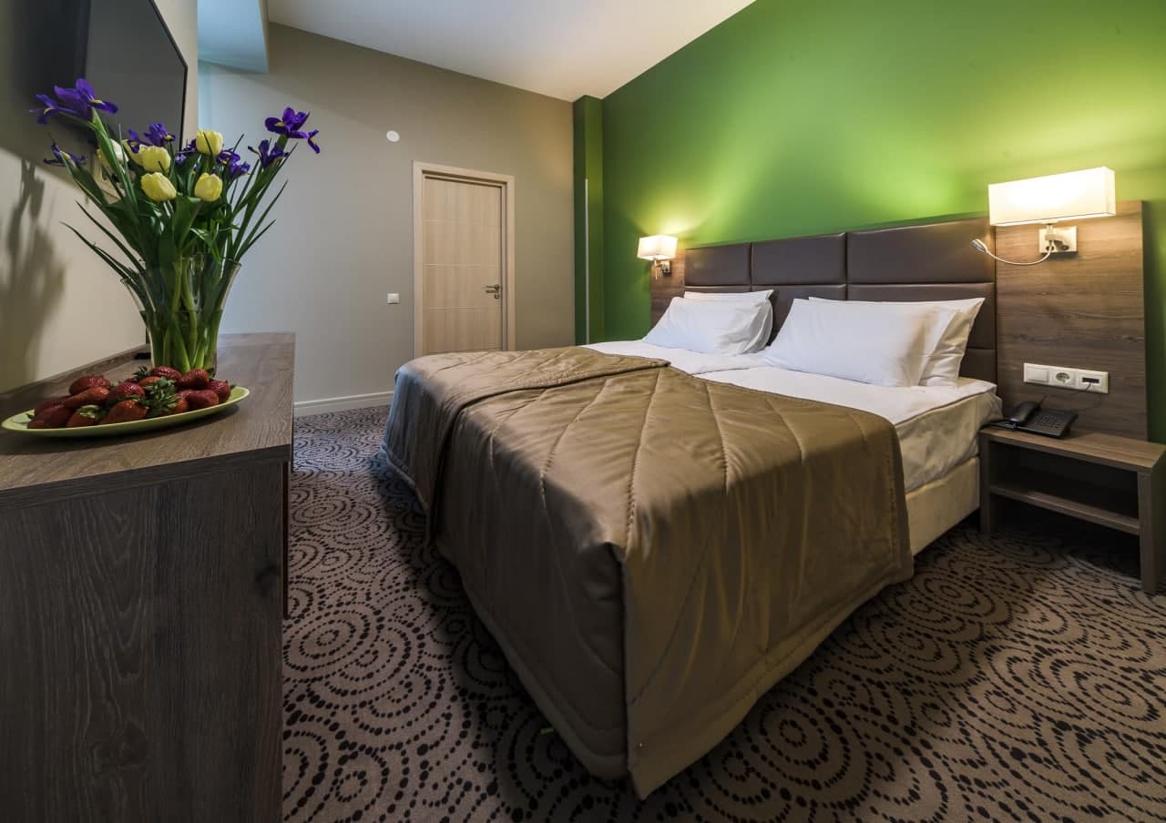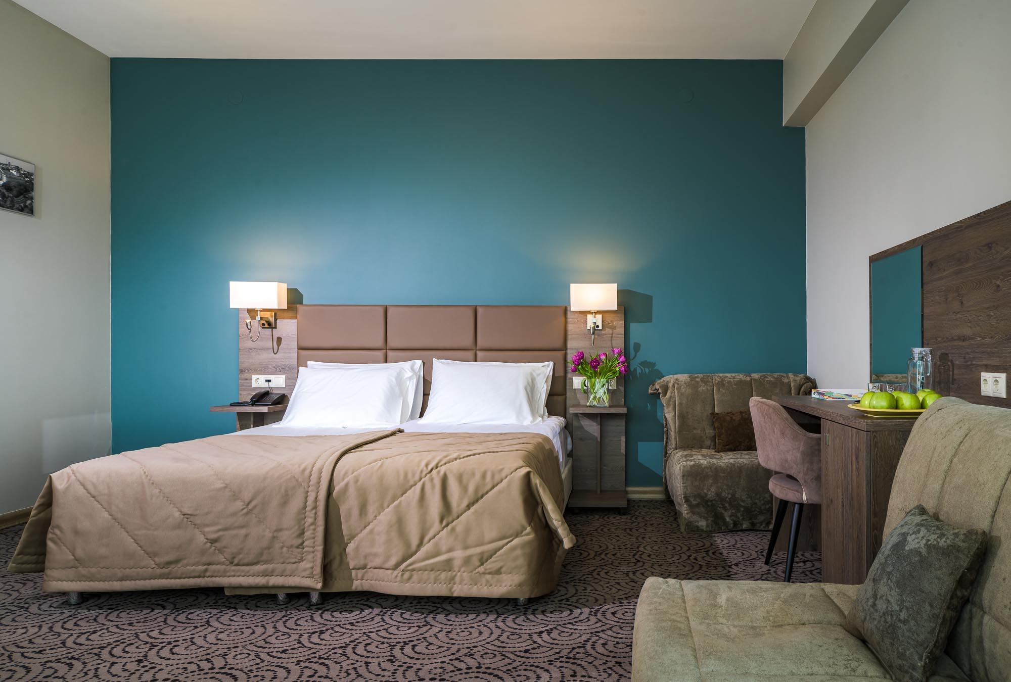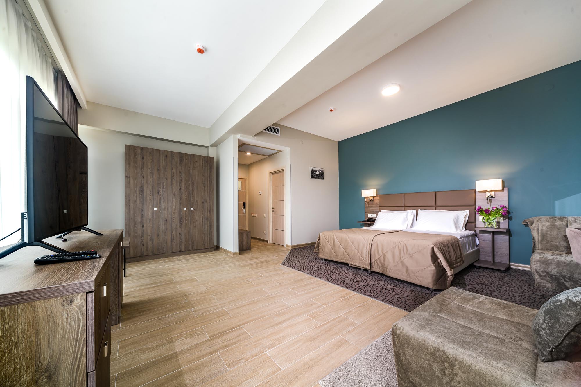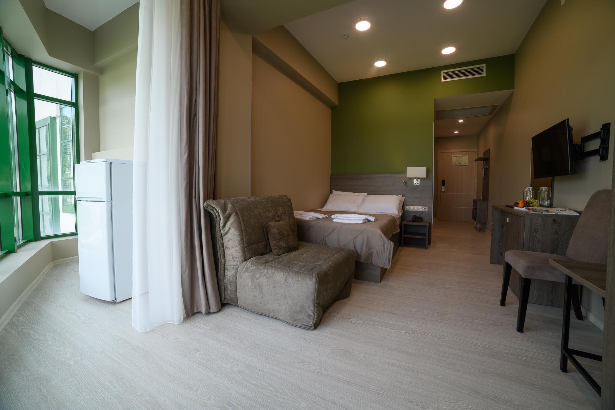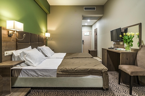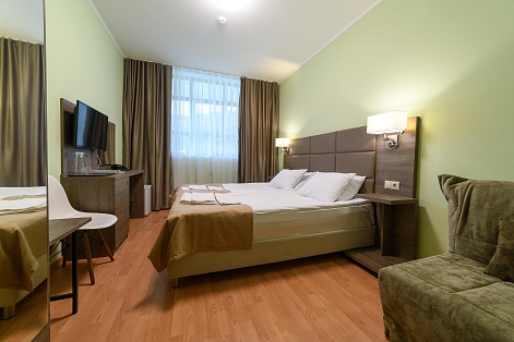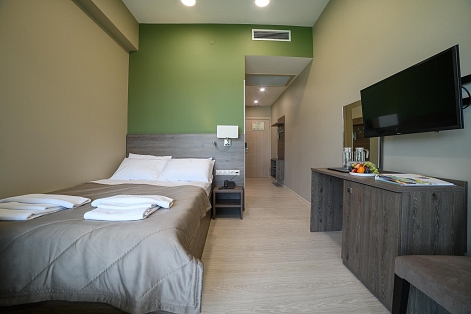 В номере: зеркало, кровать полутороспальная, прикроватные тумбочки, стол, стул, шкаф, набор посуды, сейф, система общего кондиционирования, телевизор ЖК, телефон, холодильник