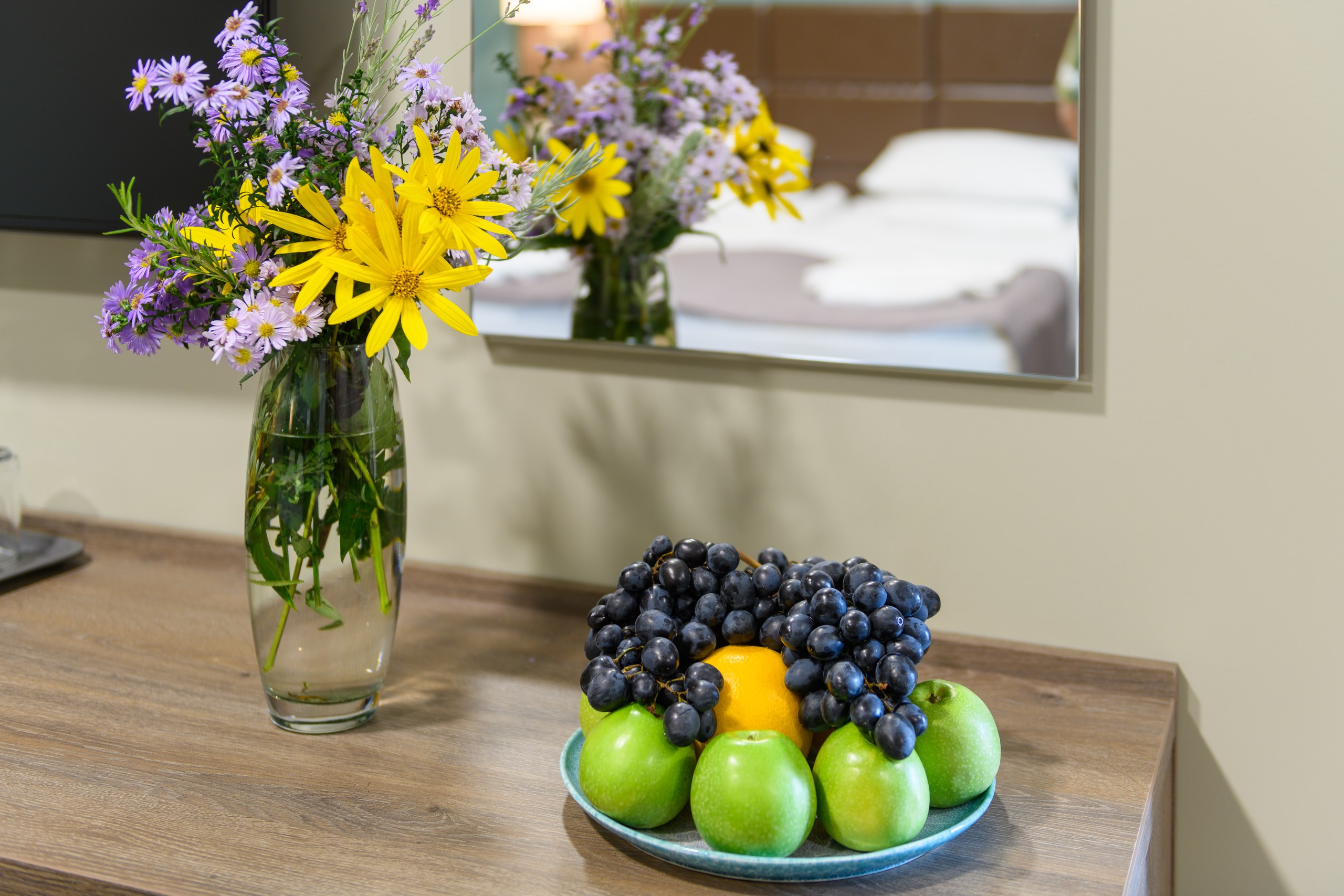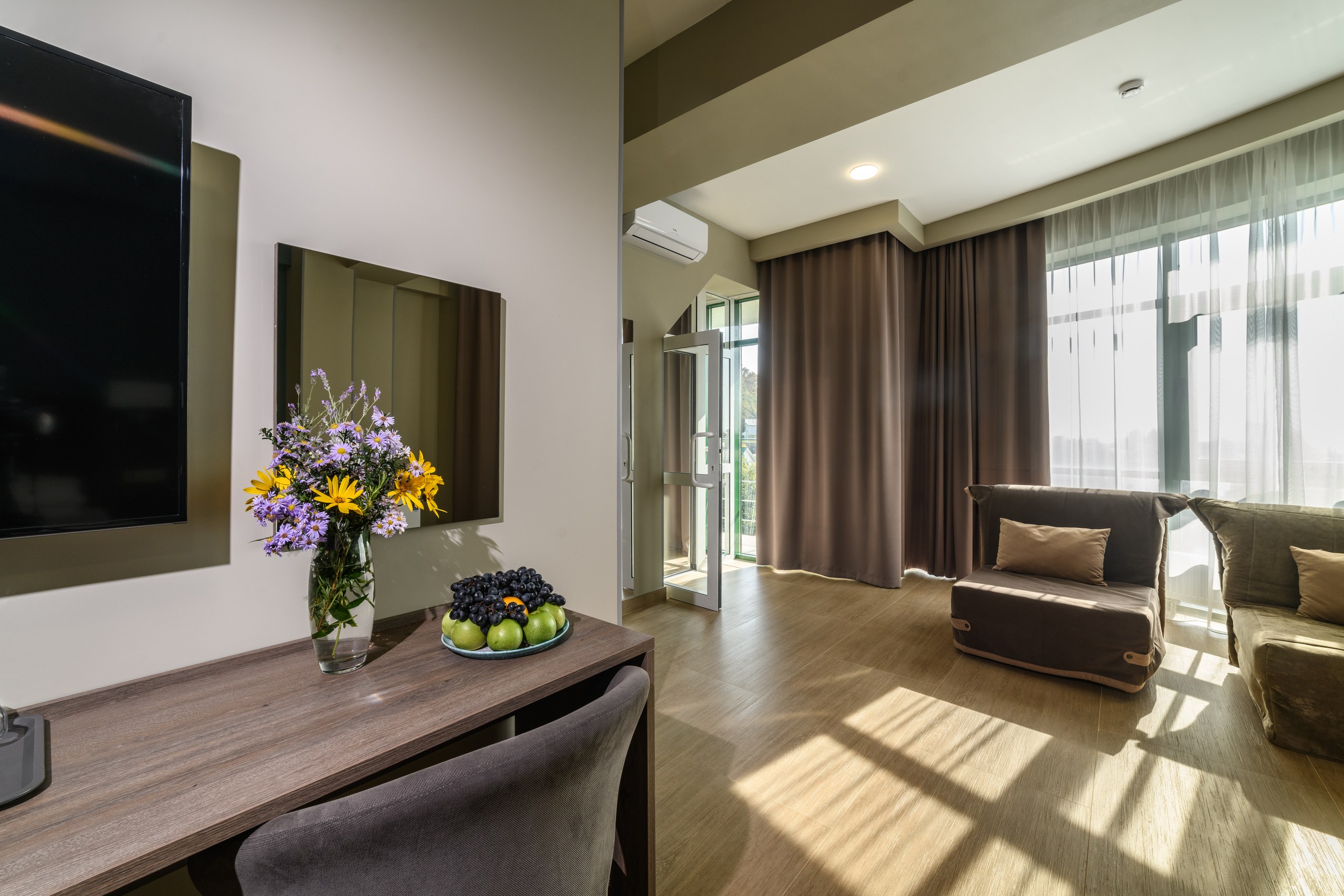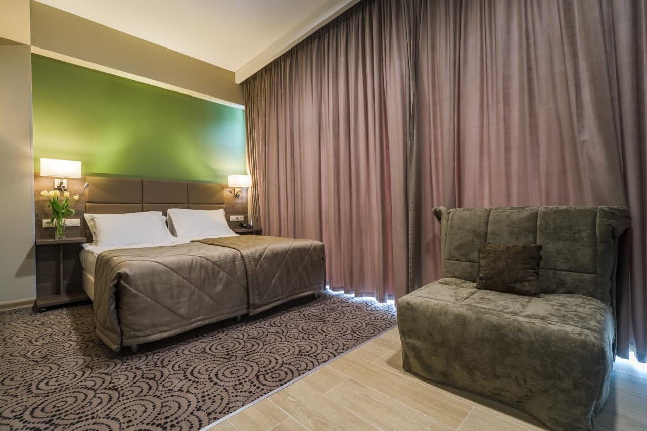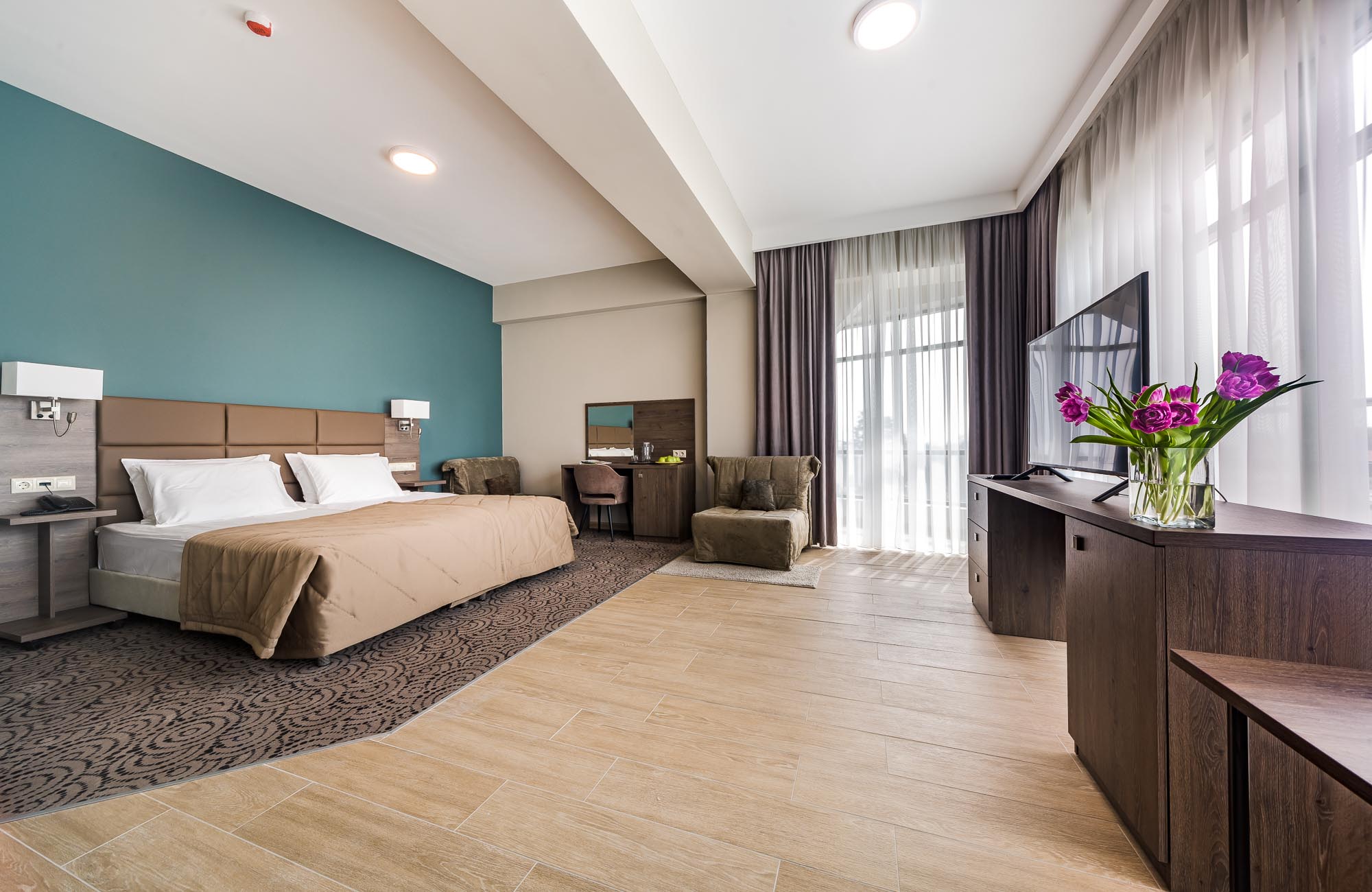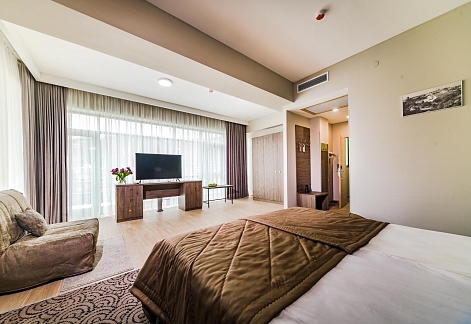 В номере: зеркало, кровать полутороспальная, прикроватные тумбочки, стол, стул, шкаф, набор посуды, сейф, система общего кондиционирования, телевизор ЖК, телефон, холодильник