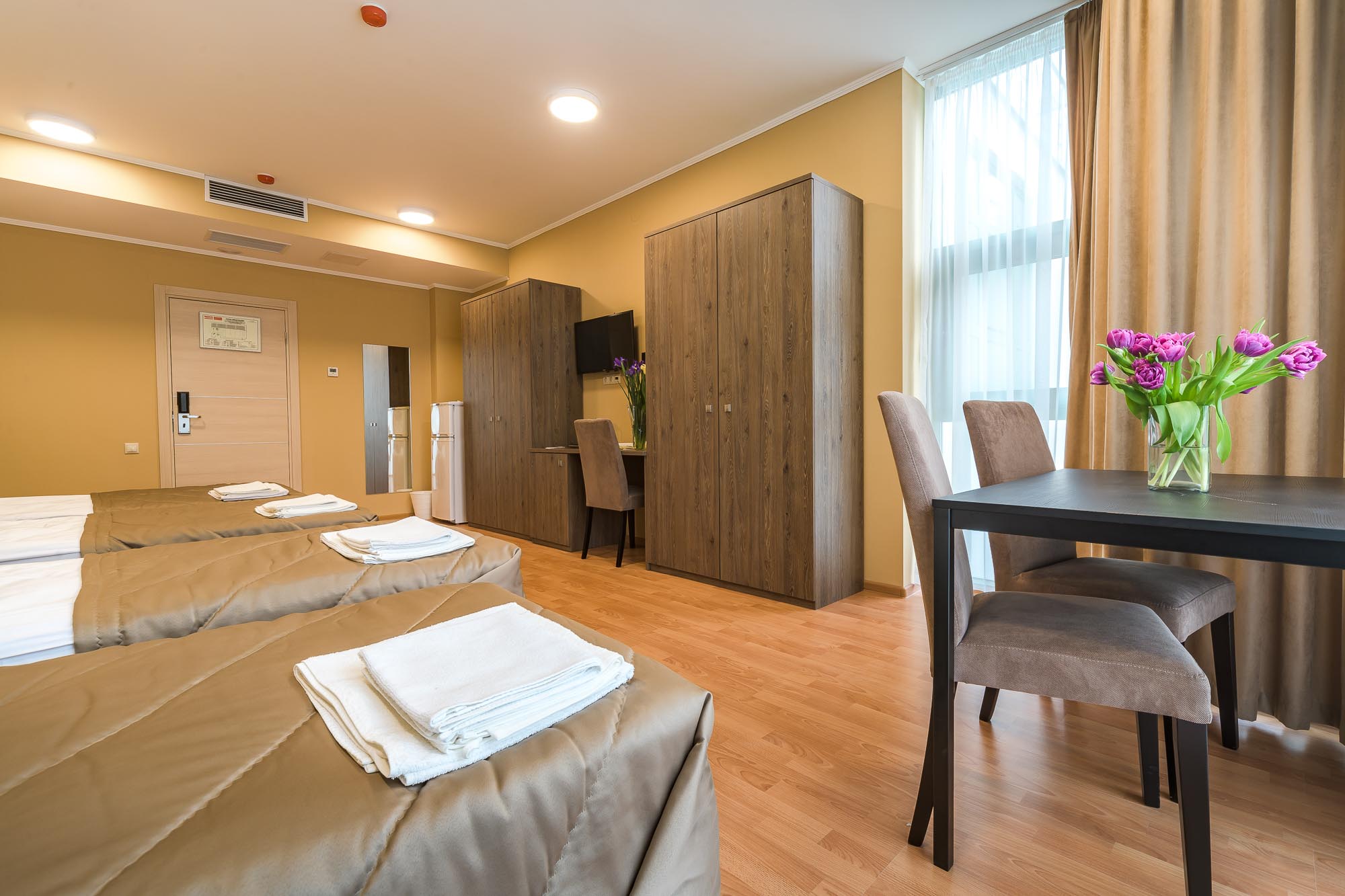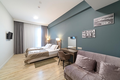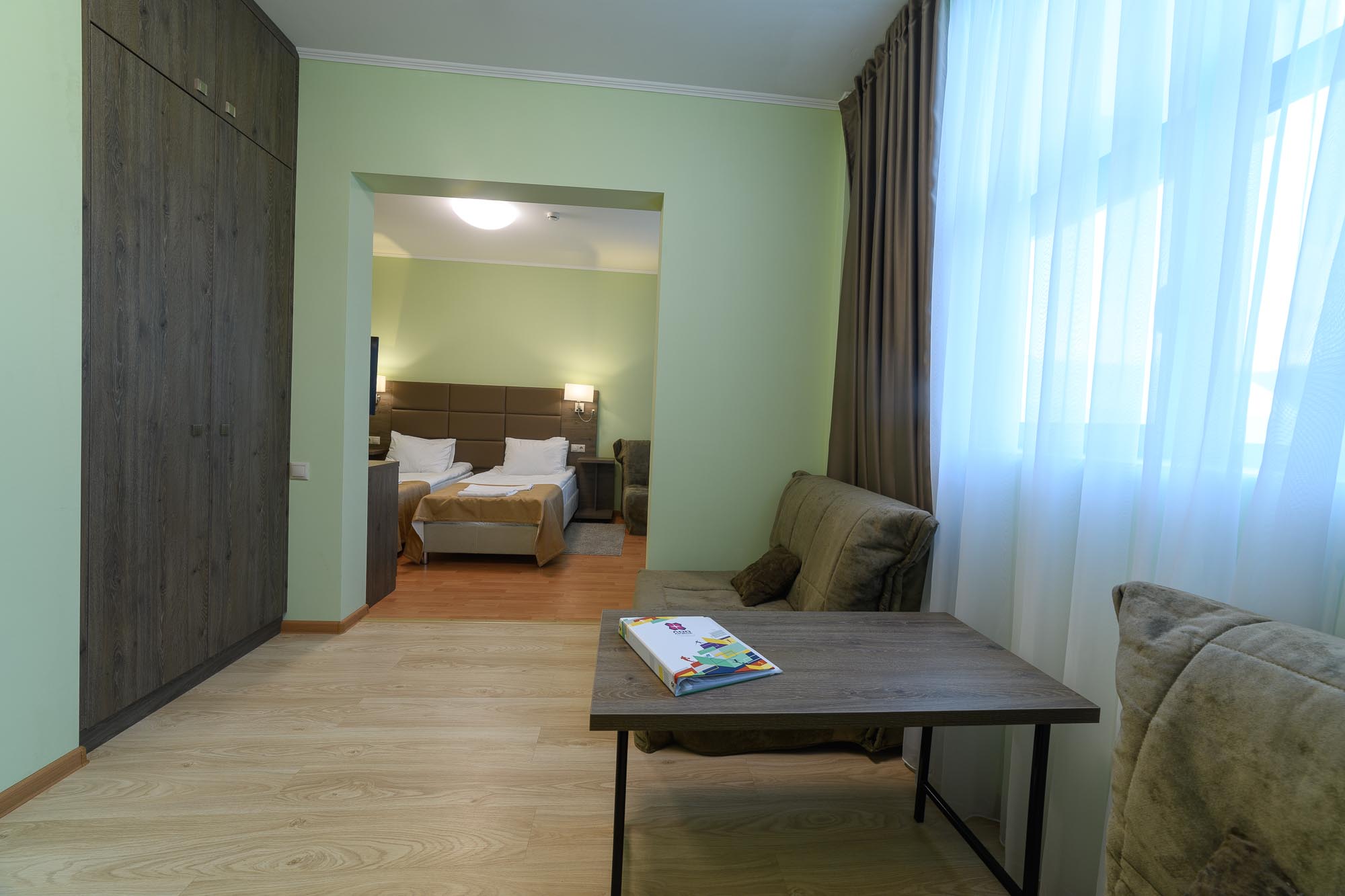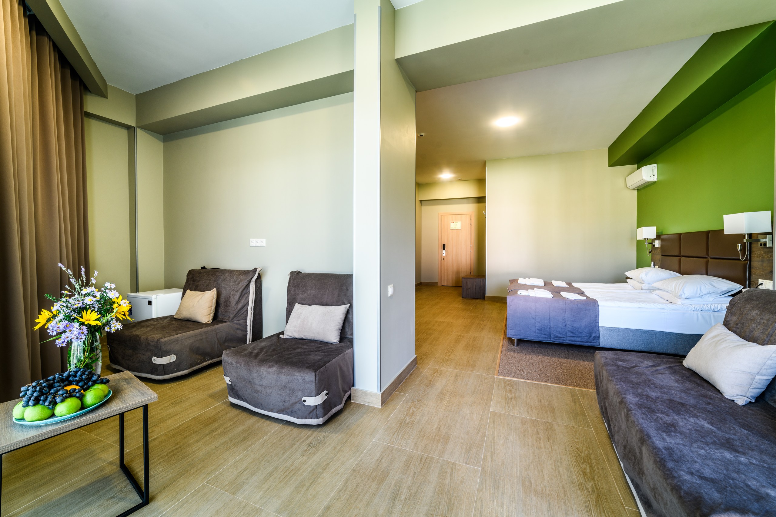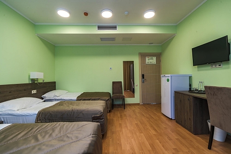 В номере: диван, зеркало, кровати односпальные /одна двуспальная кровать, прикроватные тумбочки, стол, стул, шкаф, набор посуды, сейф, система общего кондиционирования, телевизор ЖК, телефон, холодильник