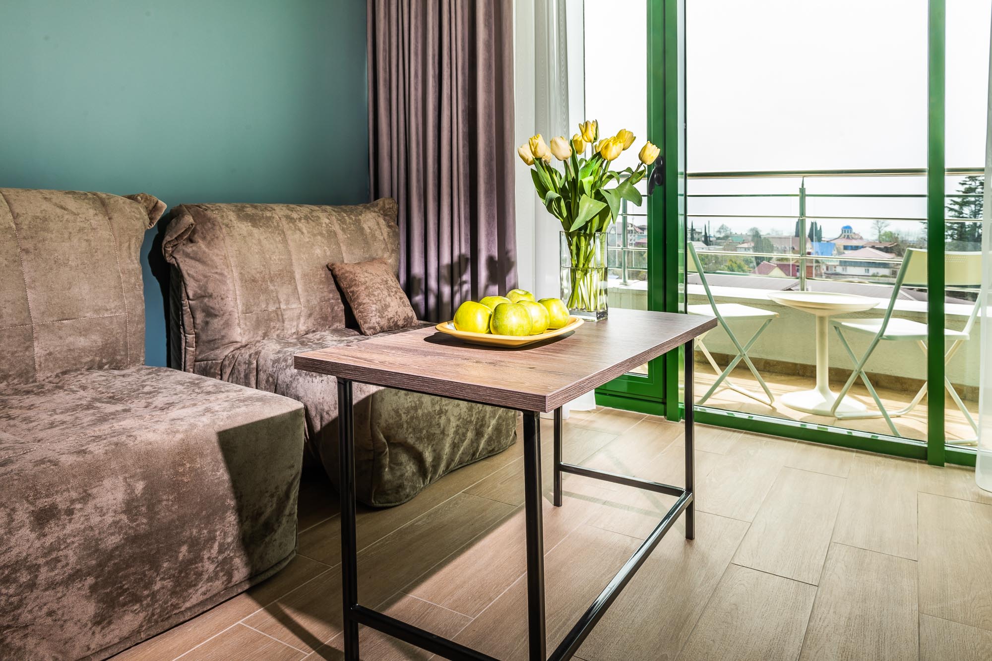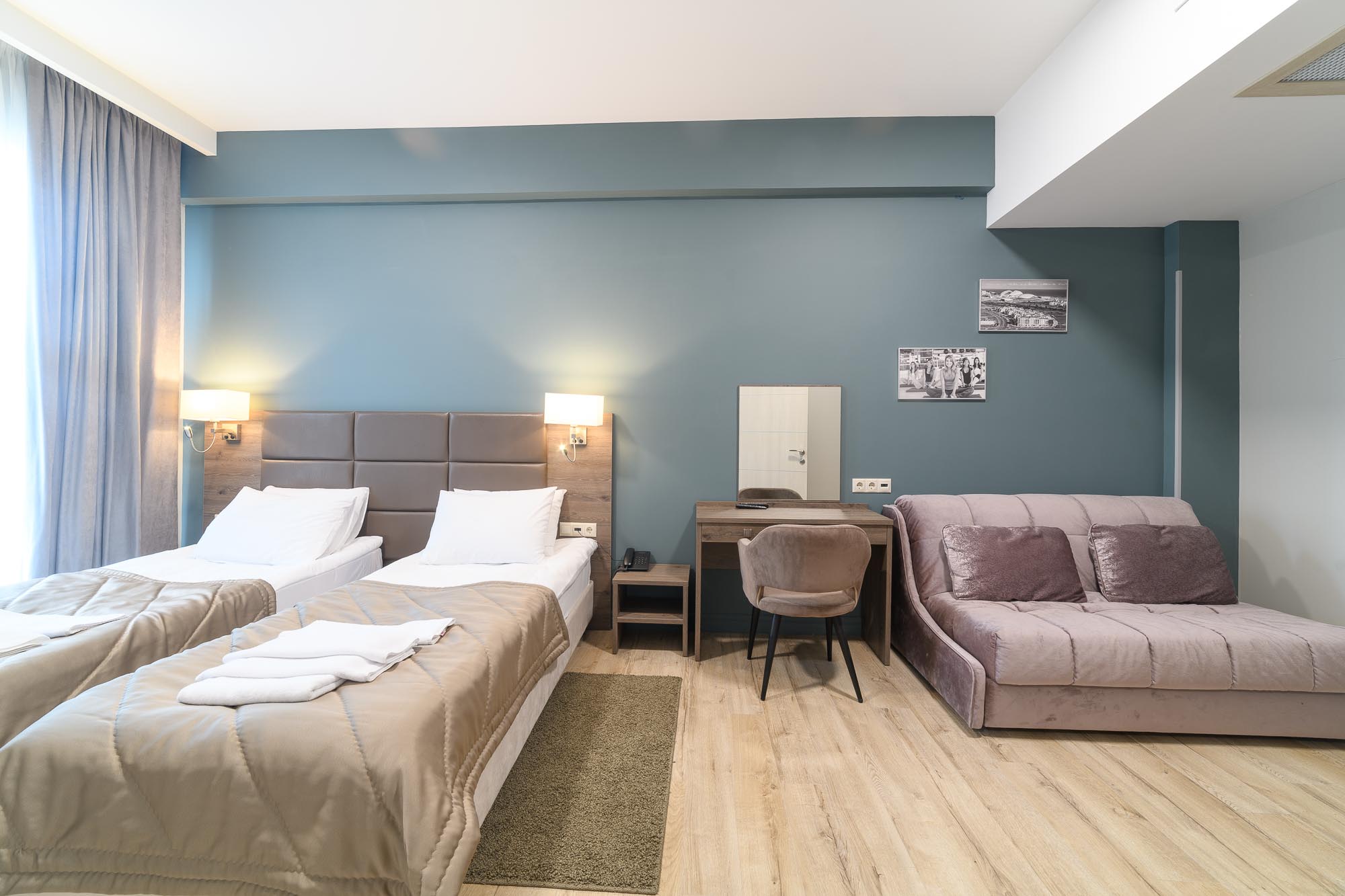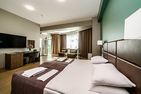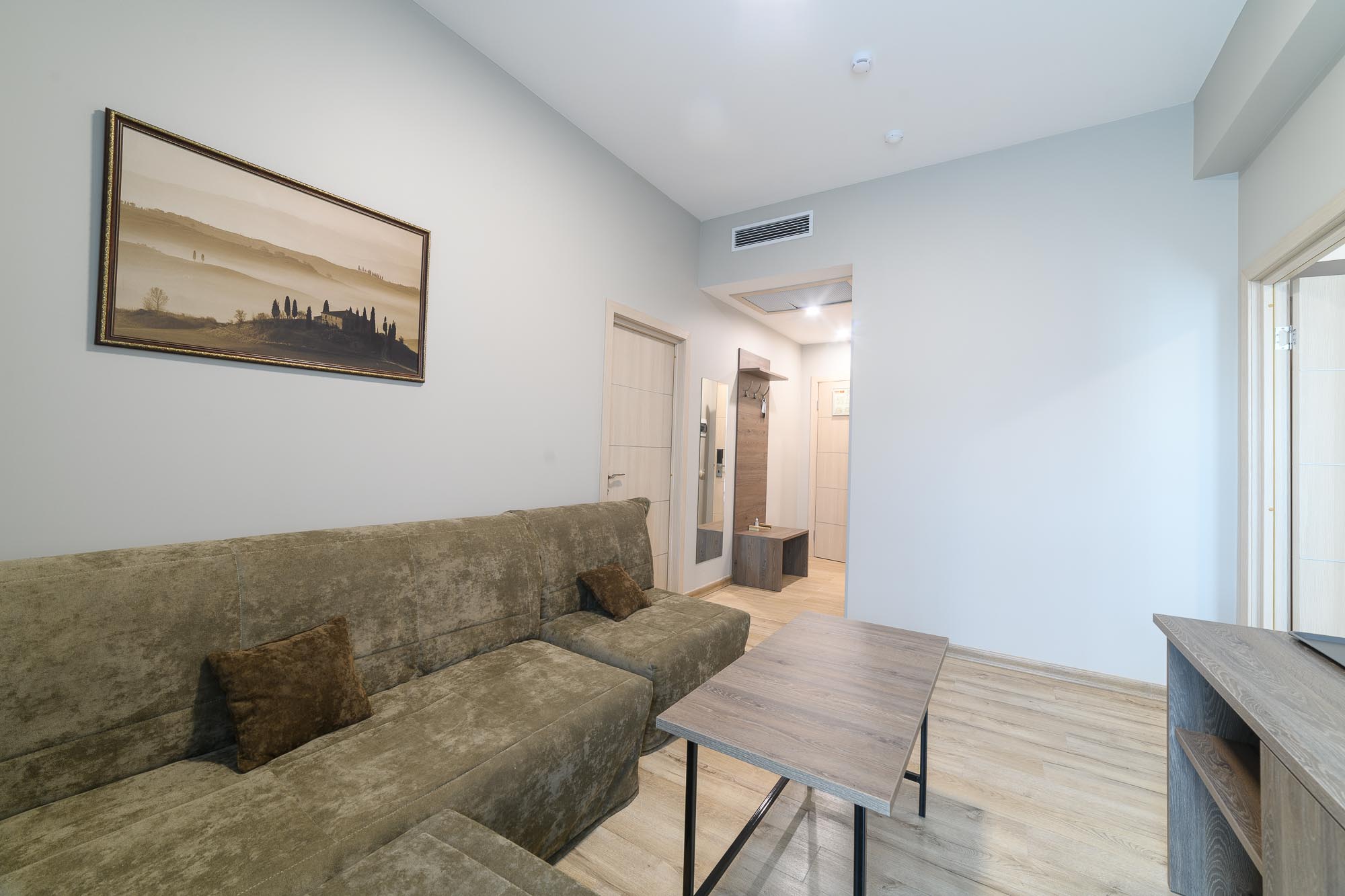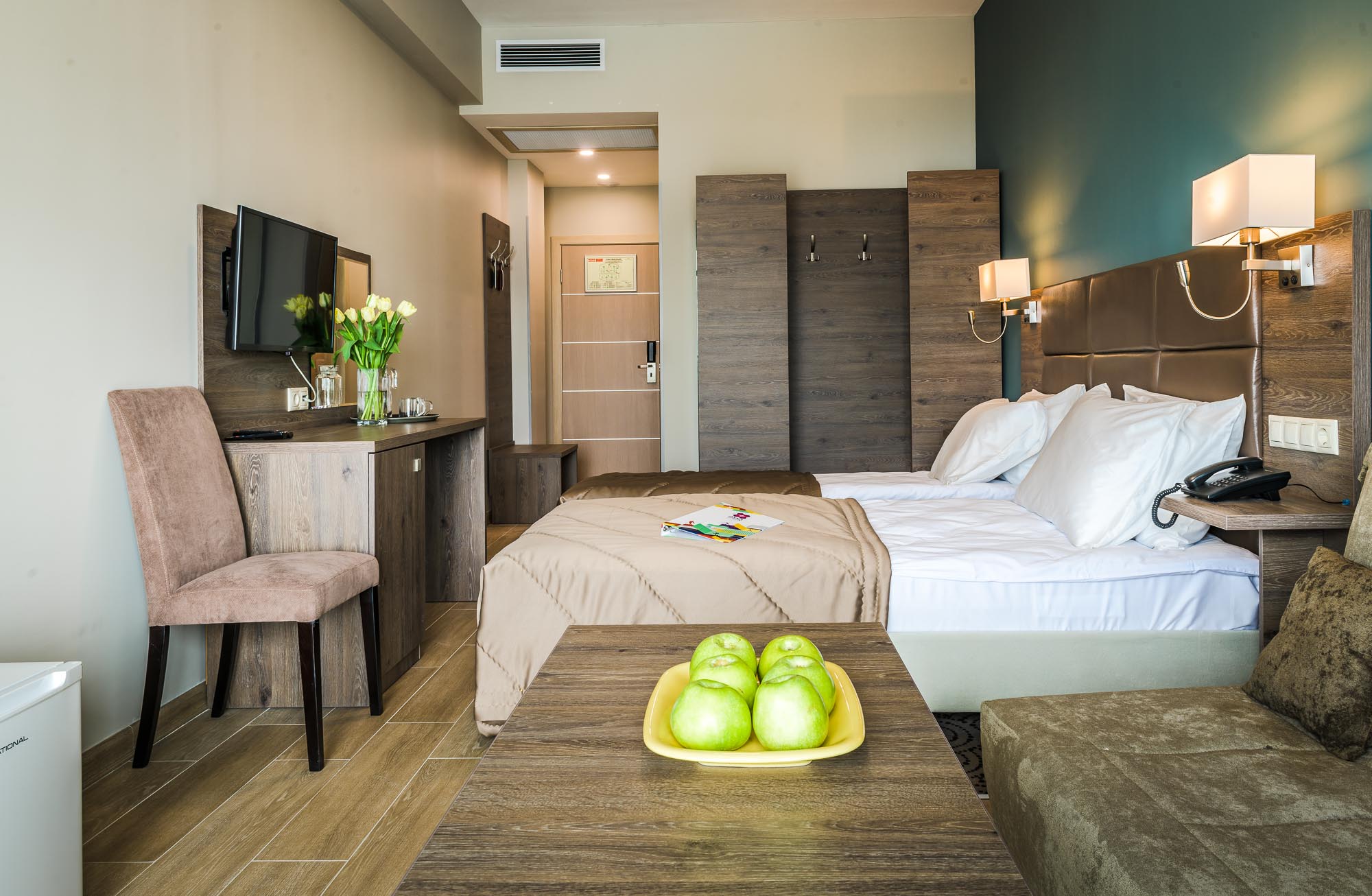 В номере: диван, зеркало, кровати односпальные /одна двуспальная кровать, прикроватные тумбочки, стол, стул, шкаф, набор посуды, сейф, система общего кондиционирования, телевизор ЖК, телефон, холодильник