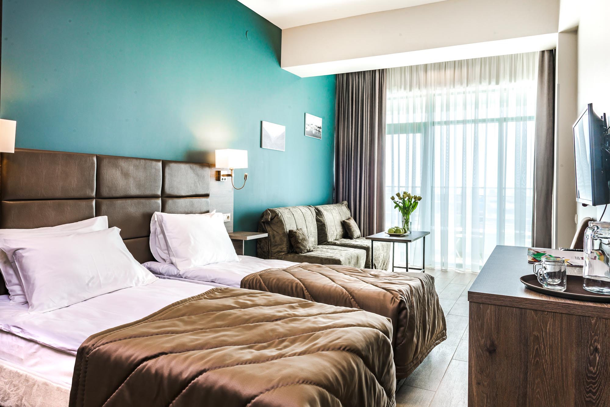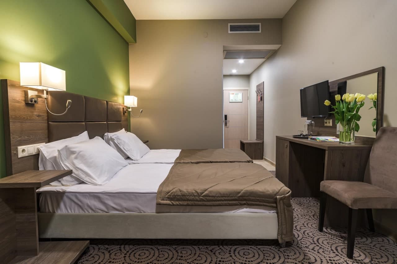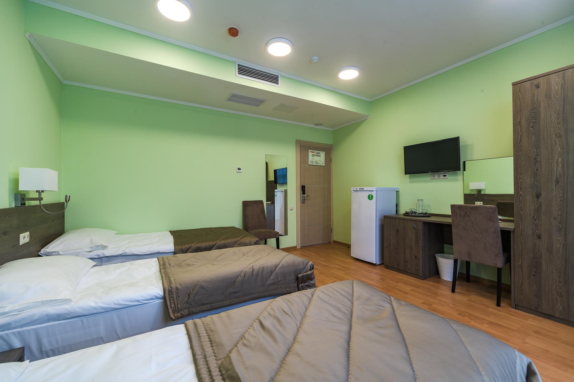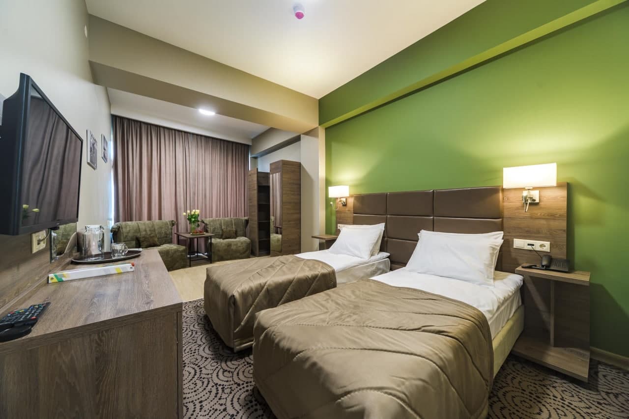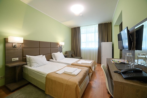 В номере: вешалка, зеркало, кровати односпальные, прикроватные тумбочки, шкаф, набор посуды, сейф, система общего кондиционирования, телевизор, телевизор ЖК, холодильник