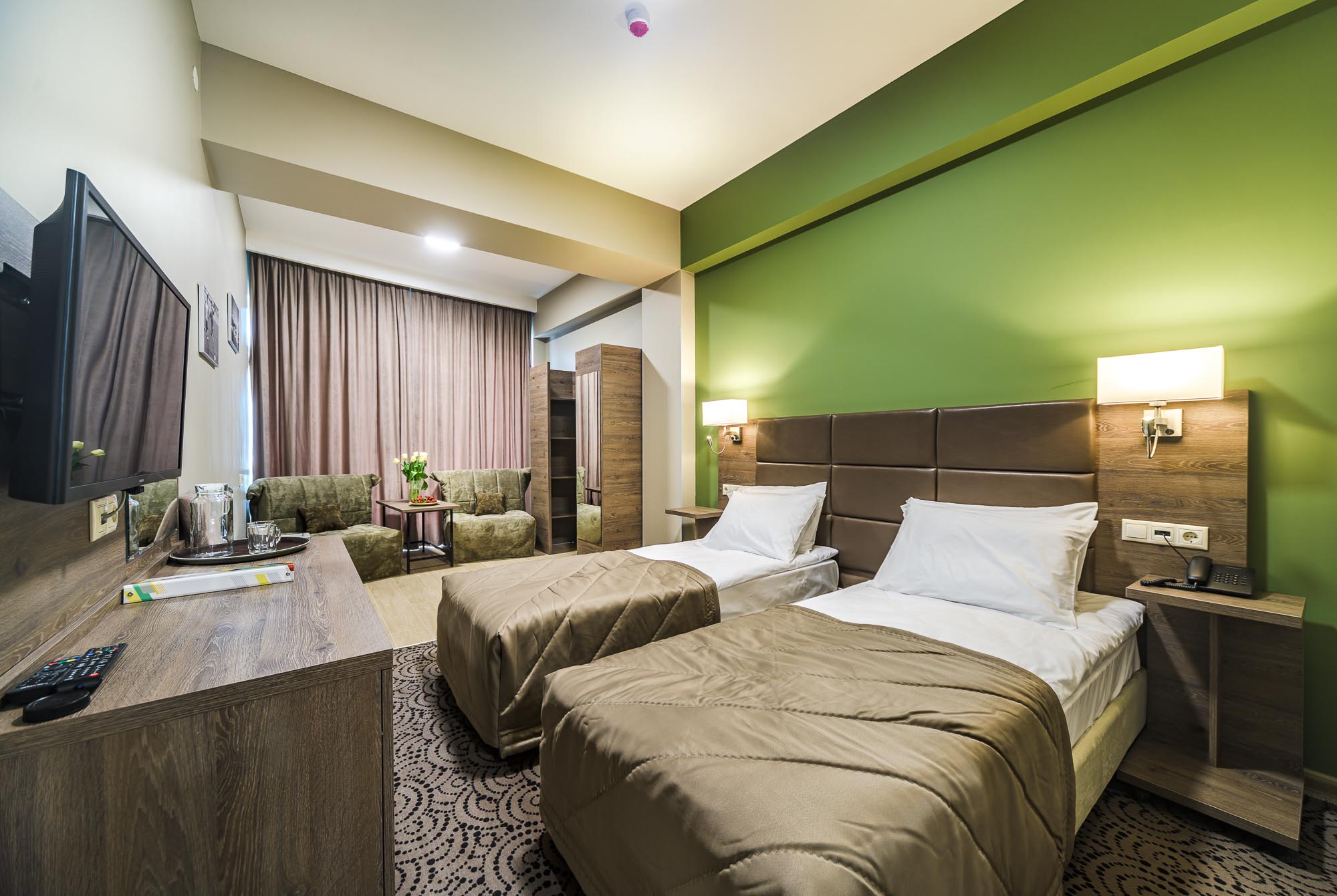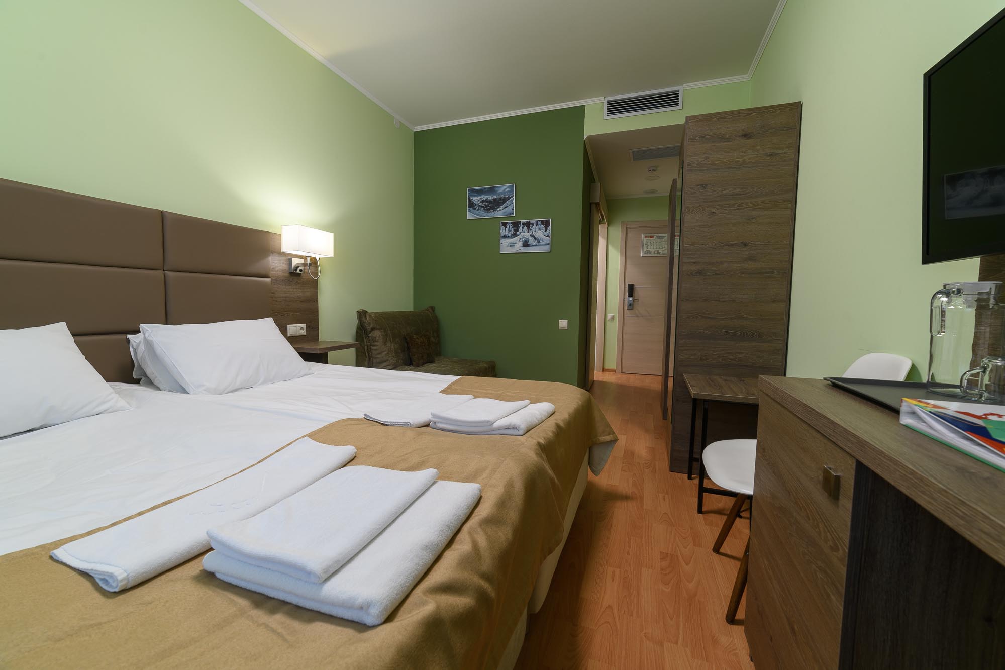 В номере: вешалка, зеркало, кровати односпальные, прикроватные тумбочки, шкаф, набор посуды, сейф, система общего кондиционирования, телевизор ЖК, телефон, холодильник