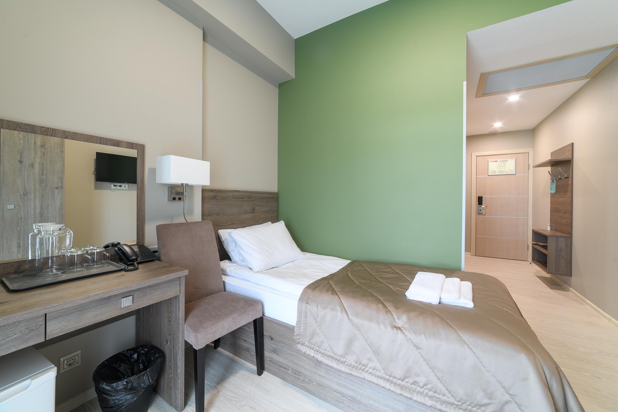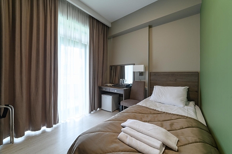 В номере: зеркало, кровать односпальная, прикроватные тумбочки, стол, стул, шкаф, набор посуды, сейф, система общего кондиционирования, телевизор ЖК, телефон, холодильник