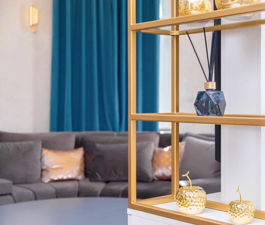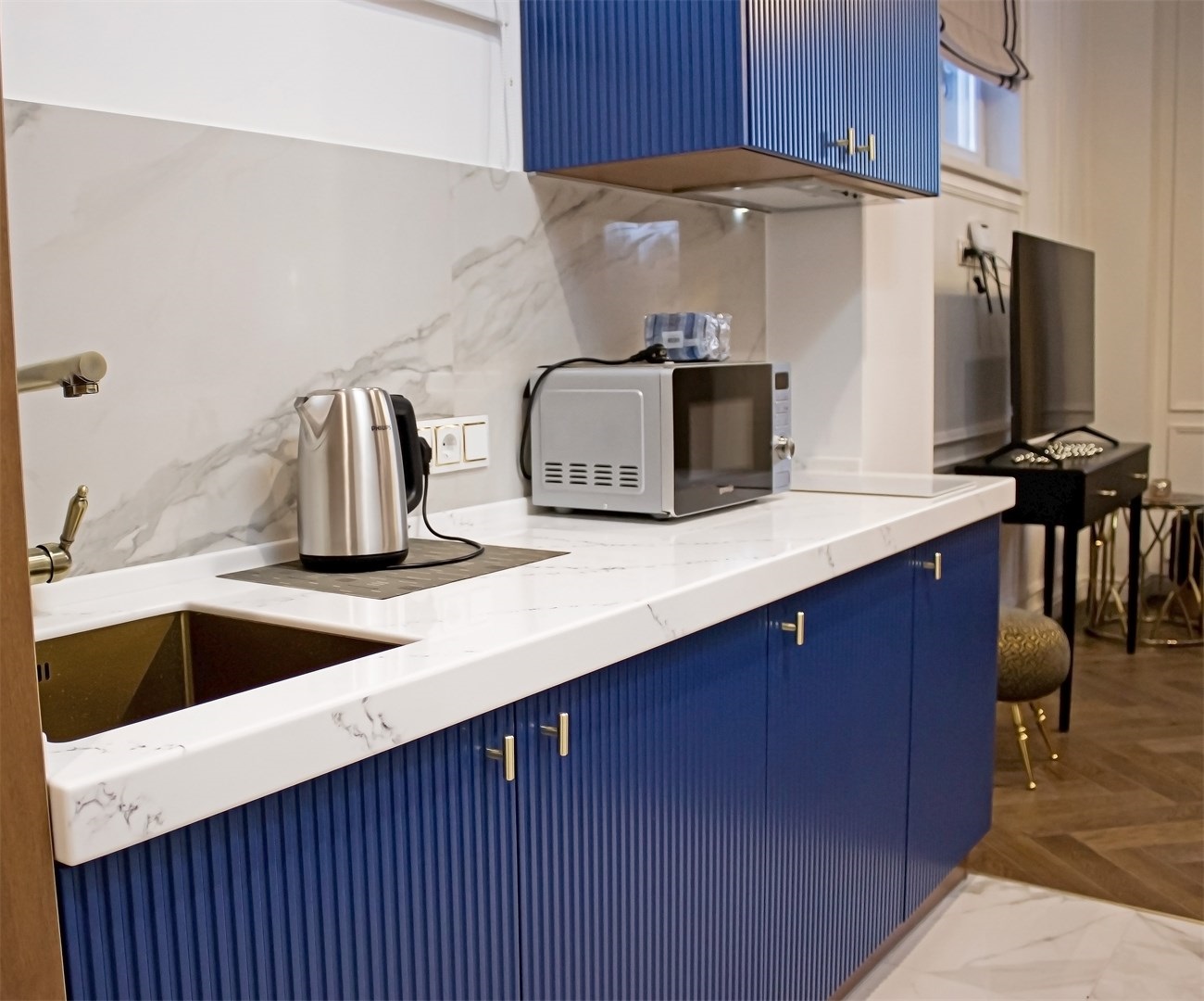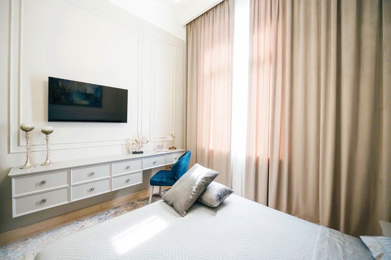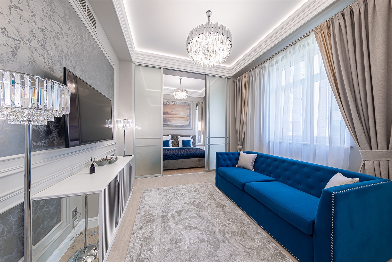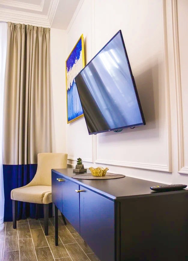 В номере: вешалка, диван, зеркало, кровать двуспальная, стол, стул, тумба, шкаф, микроволновая печь, набор посуды, сплит-система, стиральная машина, телевизор, утюг, холодильник, электрочайник