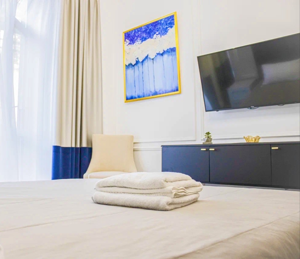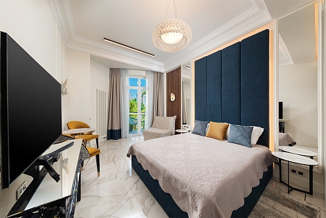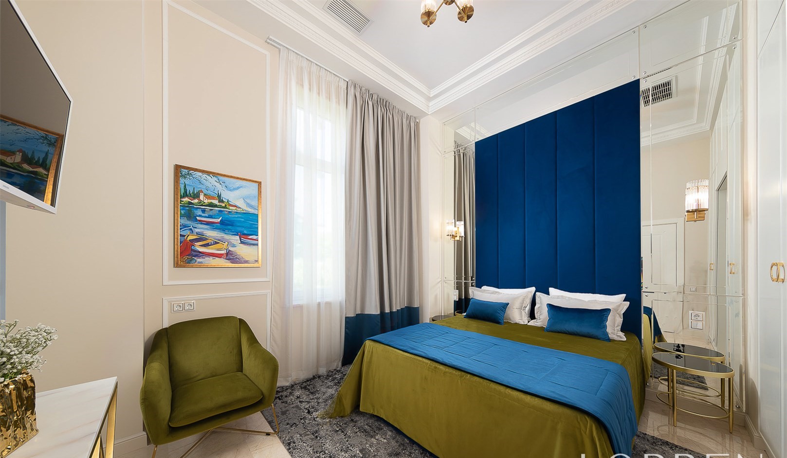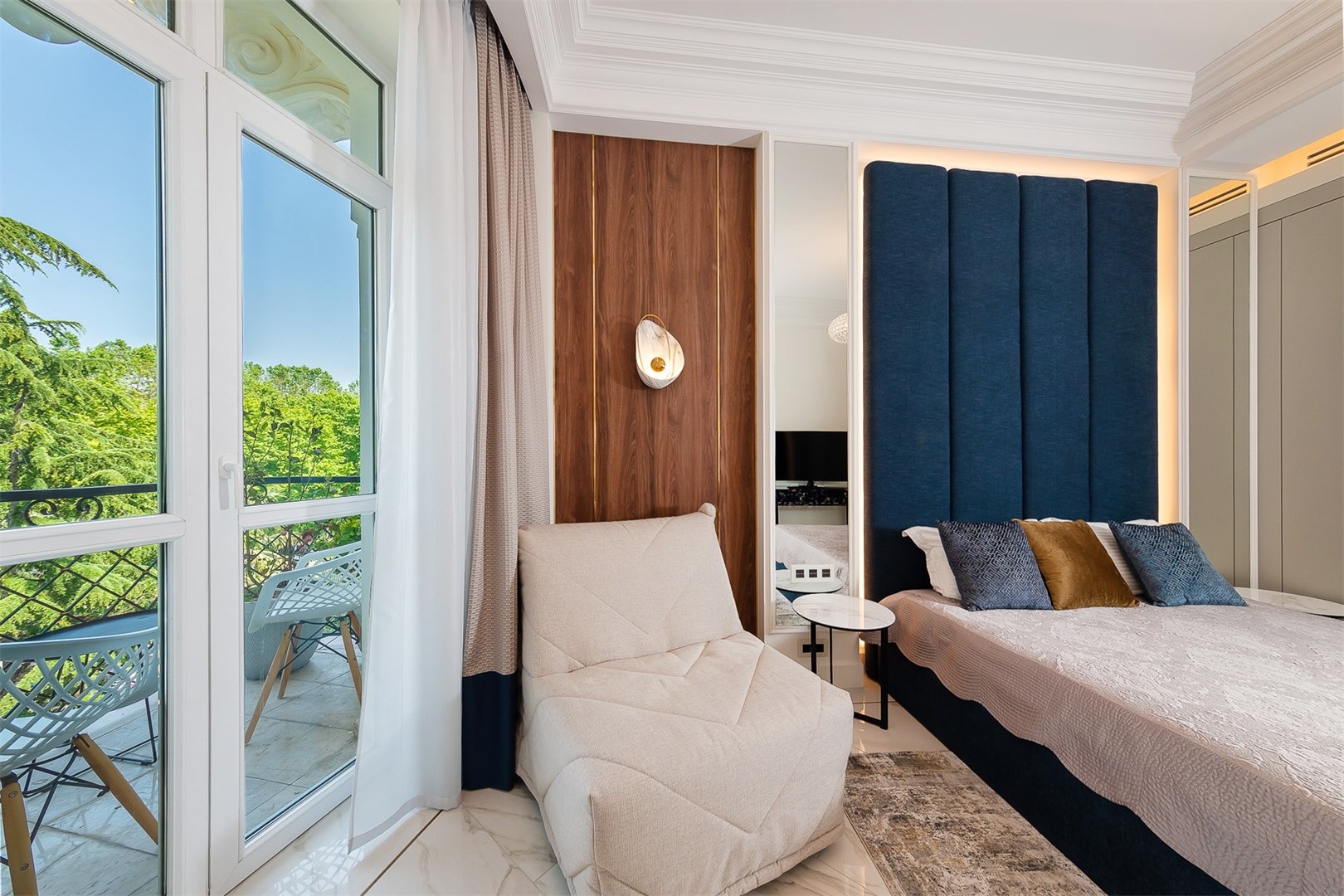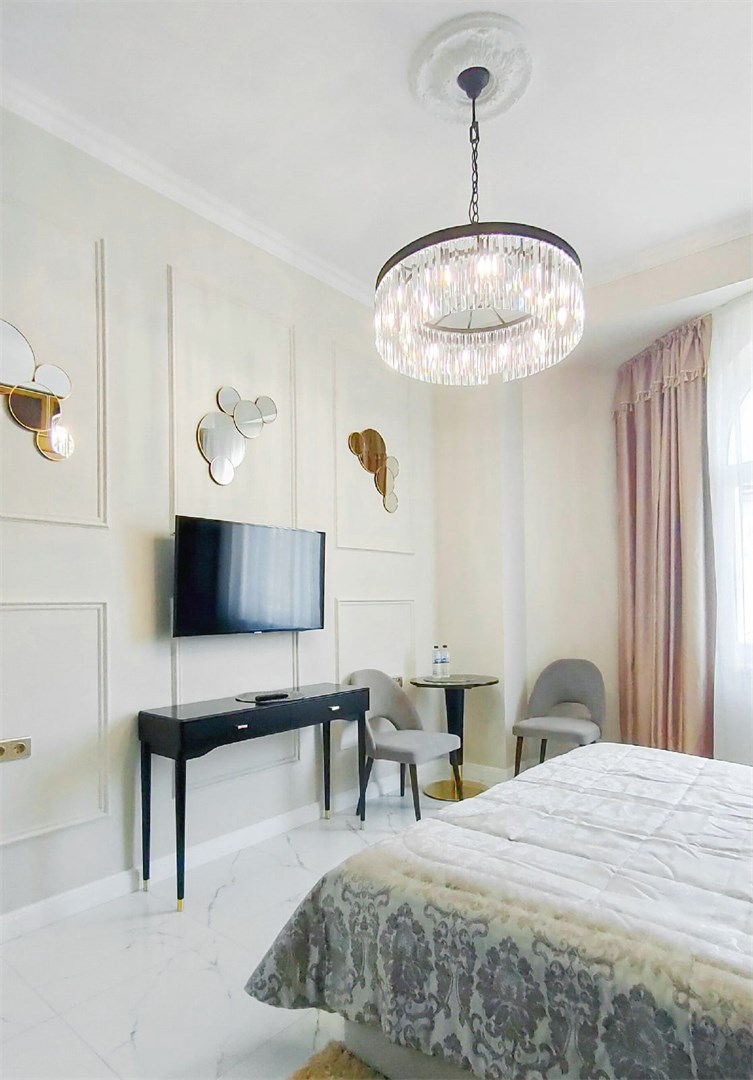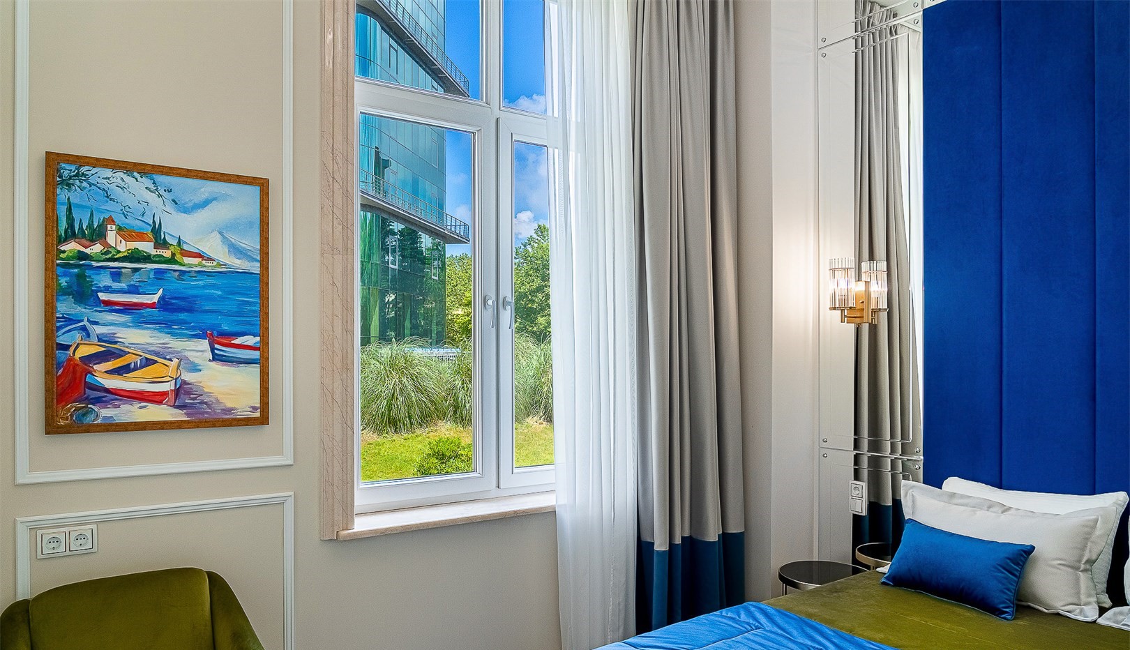 В дизайнерских интерьерах апарт-отеля прослеживаются барочные и классицистические мотивы, а в отделке используются только высококачественные материалы, например, полы в холлах выложены из натурального мрамора. Гостей ожидают 15 просторных комфортабельных номеров-апартаментов площадью от 22 до 50 квадратных метров с продуманным индивидуальным дизайном и авторской мебелью. Каждый номер оснащен мини-кухней с варочной панелью, системой кондиционирования, необходимой бытовой техникой, в ванных комнатах подготовлены наборы косметики класс люкс, установлена стиральная машина.Во внутреннем дворе для отдыхающих оборудована лаундж-зона, на территории доступен беспроводной интернет, организована парковка. Всего в 5 минутах ходьбы разместился городской галечный пляж. На побережье работают бары, есть кабинки для переодевания, лежаки и навесы.
