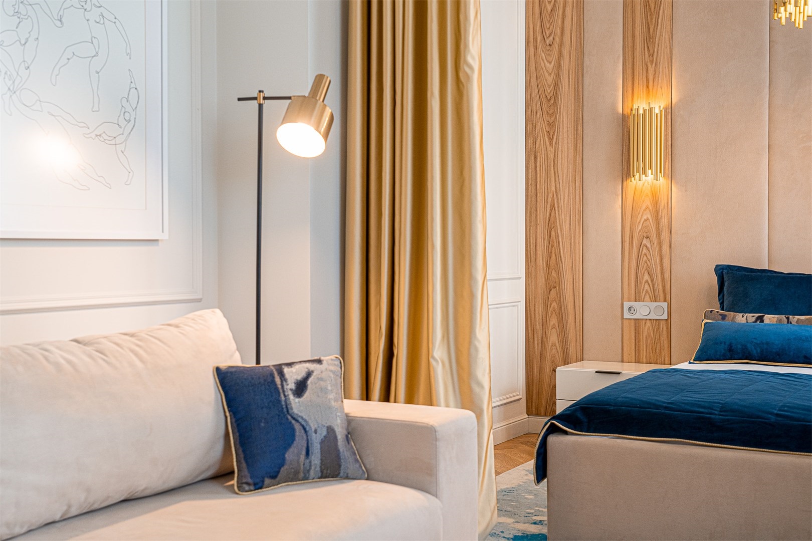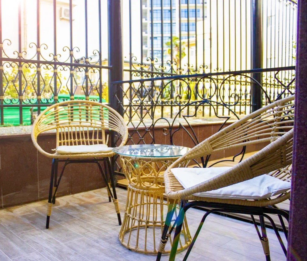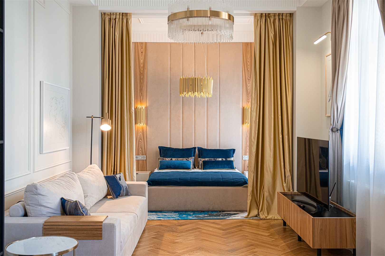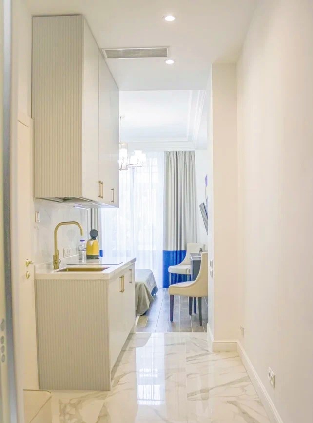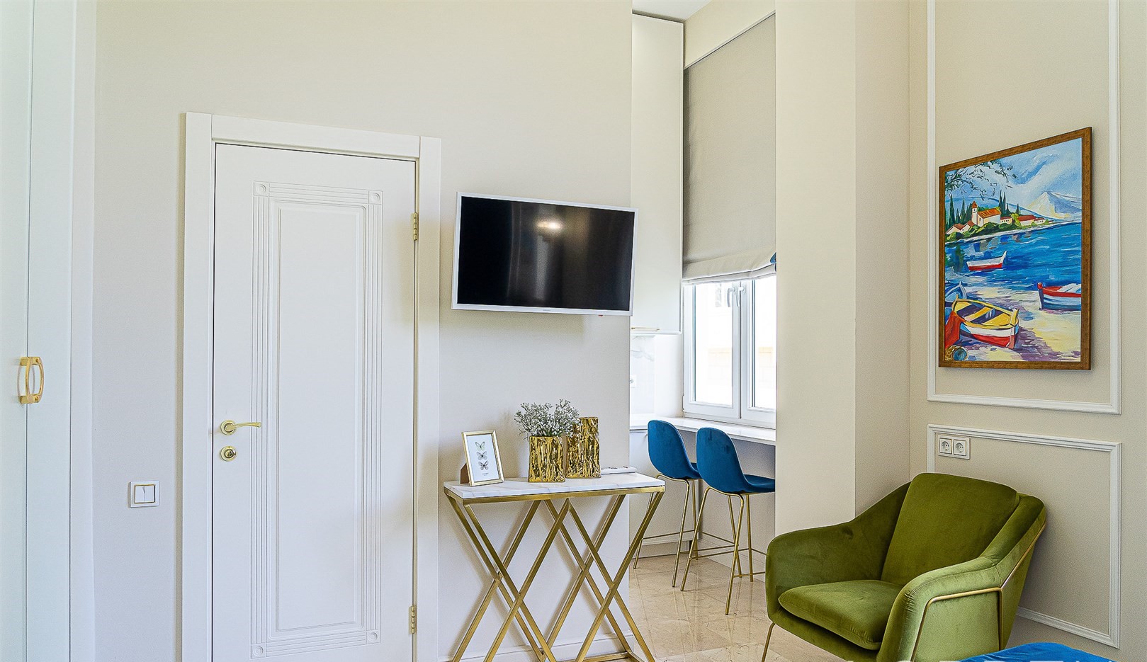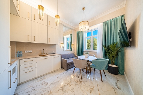 В дизайнерских интерьерах апарт-отеля прослеживаются барочные и классицистические мотивы, а в отделке используются только высококачественные материалы, например, полы в холлах выложены из натурального мрамора. Гостей ожидают 15 просторных комфортабельных номеров-апартаментов площадью от 22 до 50 квадратных метров с продуманным индивидуальным дизайном и авторской мебелью. Каждый номер оснащен мини-кухней с варочной панелью, системой кондиционирования, необходимой бытовой техникой, в ванных комнатах подготовлены наборы косметики класс люкс, установлена стиральная машина.Во внутреннем дворе для отдыхающих оборудована лаундж-зона, на территории доступен беспроводной интернет, организована парковка. Всего в 5 минутах ходьбы разместился городской галечный пляж. На побережье работают бары, есть кабинки для переодевания, лежаки и навесы.