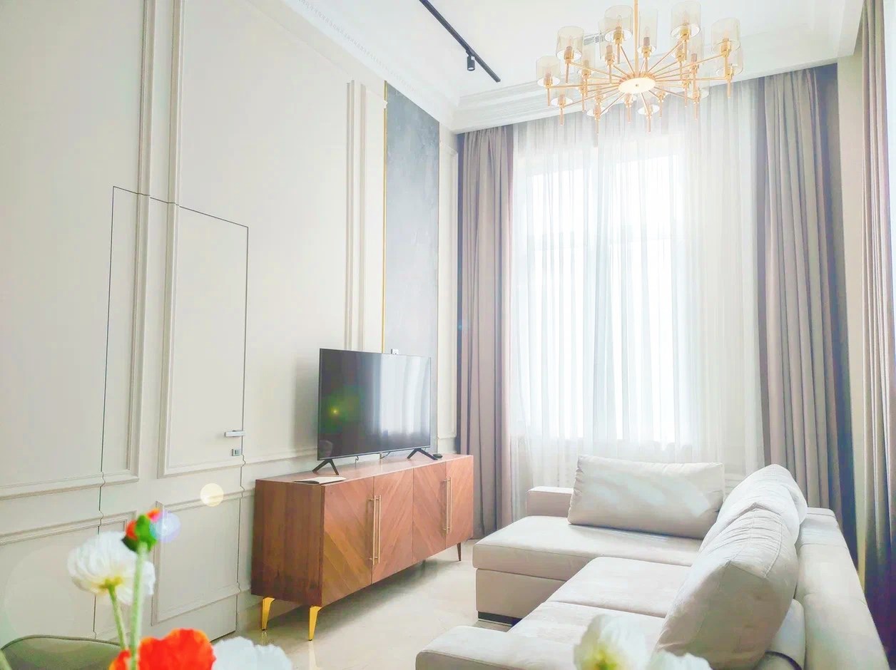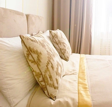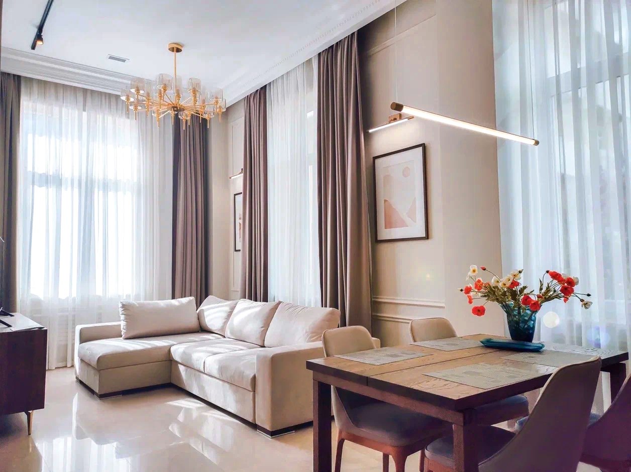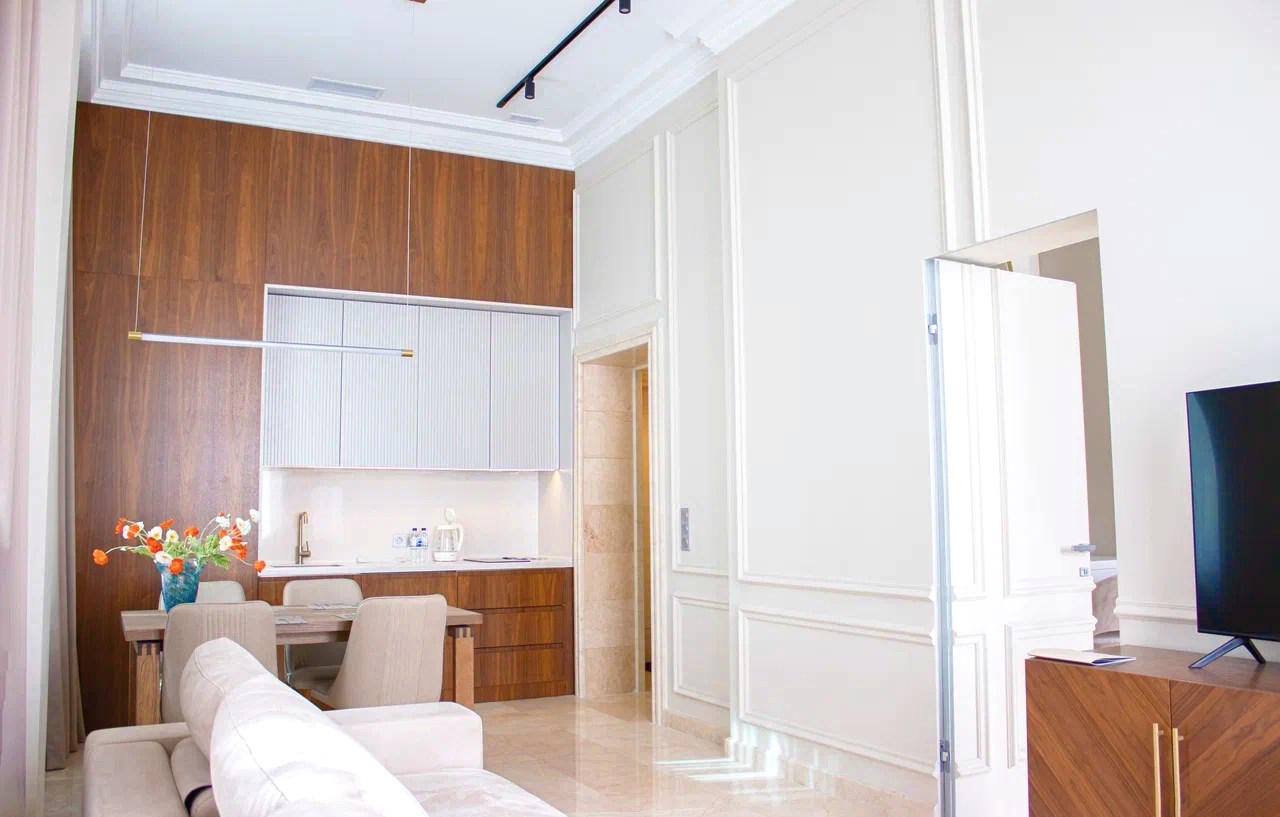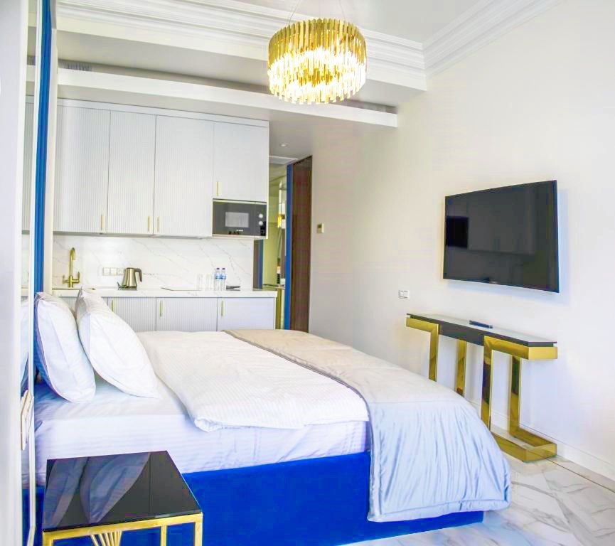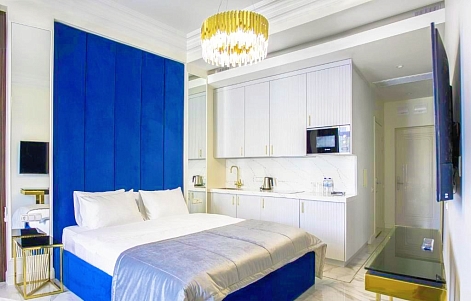 В номере: вешалка, диван, кровать двуспальная, стол, столик туалетный, стул, шкаф, кондиционер, микроволновая печь, мини-холодильник, набор посуды, стиральная машина, телевизор, утюг