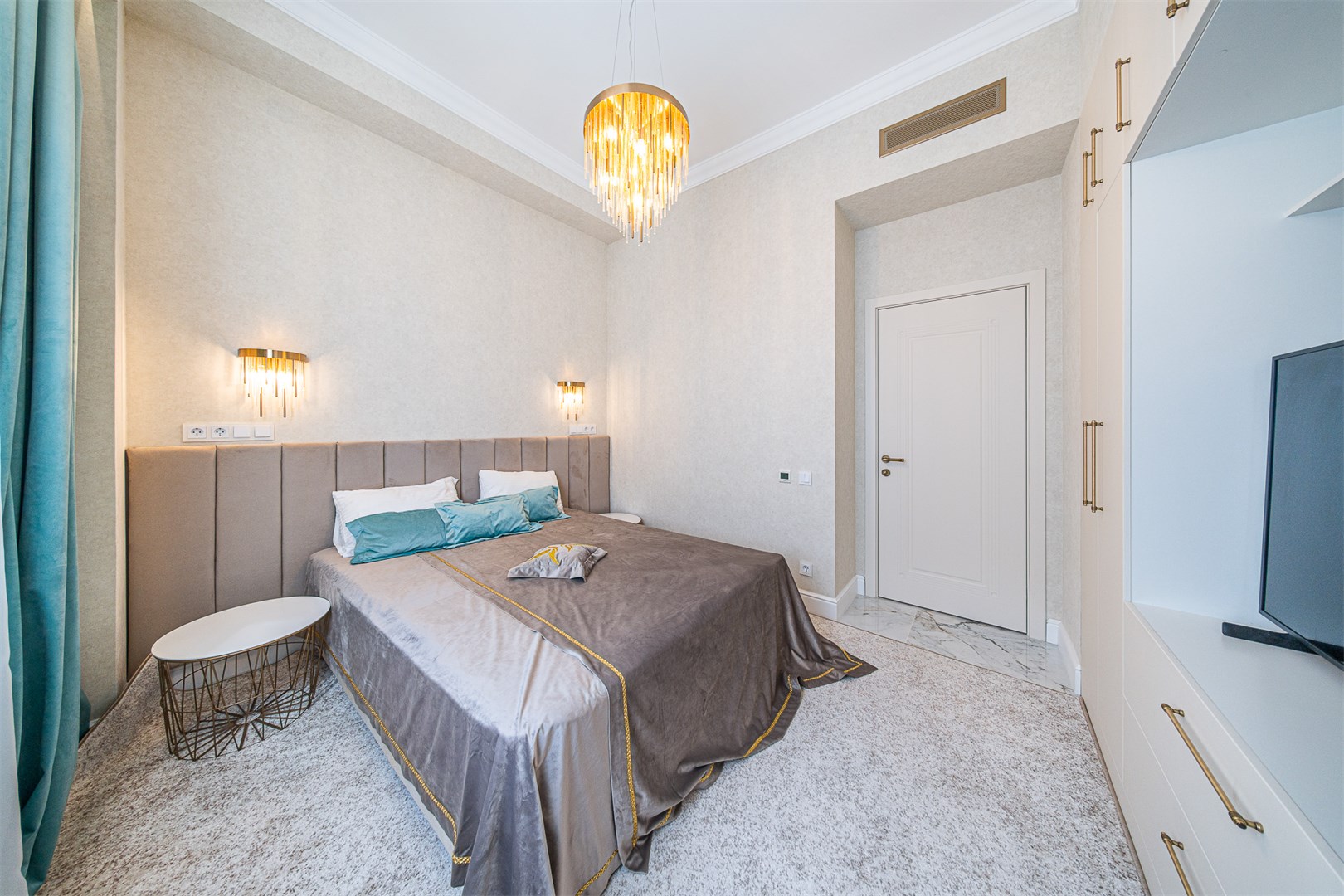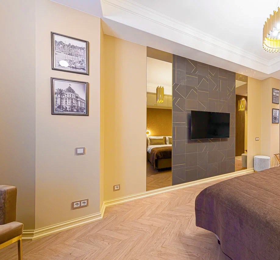 В номере: вешалка, диван, зеркало, кровать двуспальная, прикроватные тумбочки, стол, столик туалетный, стул, шкаф, гладильная доска, мини-холодильник, набор посуды, плита электрическая, стиральная машина, телевизор, утюг, чайник