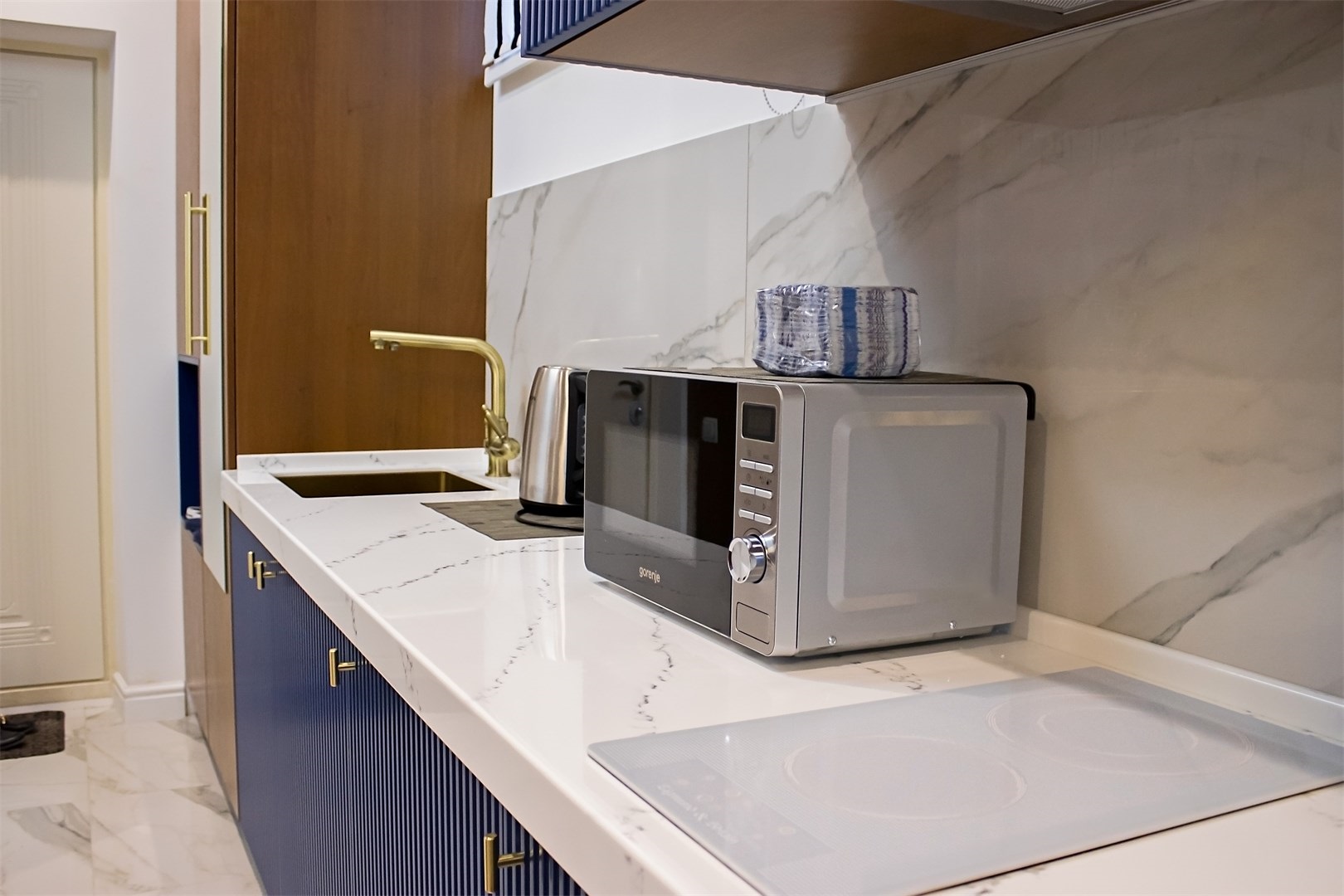 В номере: вешалка, кресло, кровать двуспальная, шкаф, кондиционер, микроволновая печь, мини-холодильник, набор посуды, плита электрическая, стиральная машина, телевизор, электрочайник