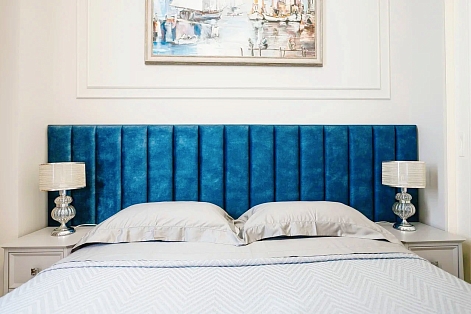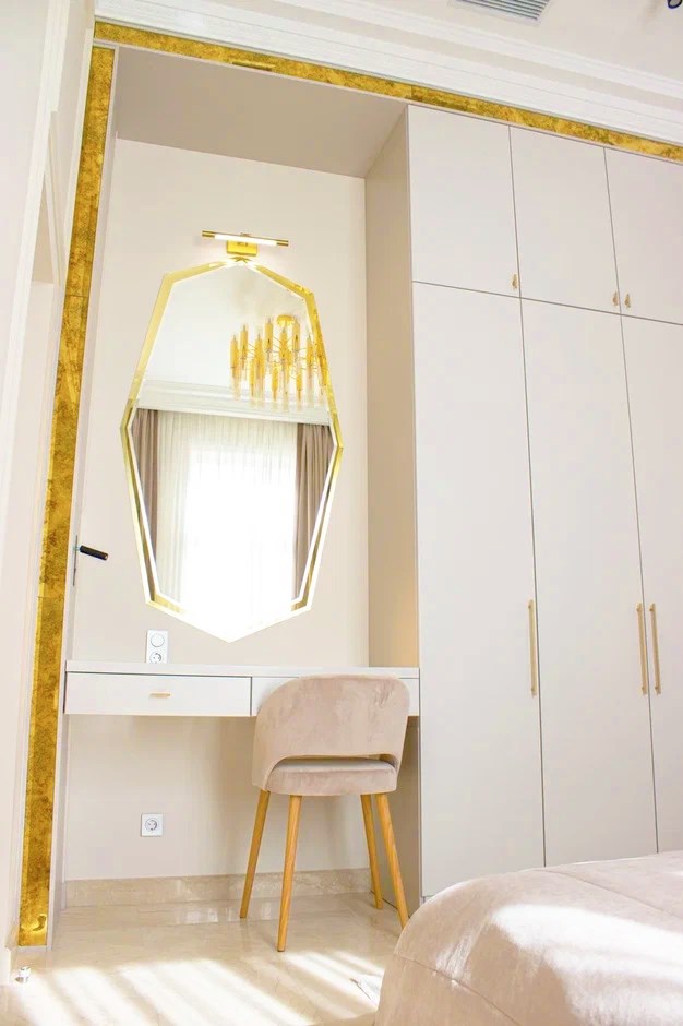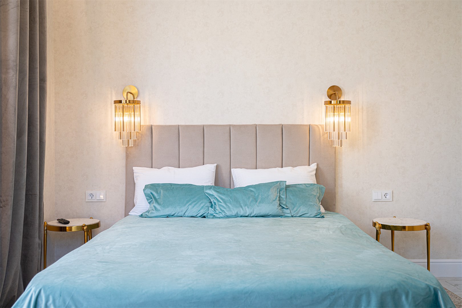 В номере: диван, зеркало, кровать двуспальная, прикроватные тумбочки, стол, столик туалетный, стулья, шкаф-купе, гладильная доска, кондиционер, мини-холодильник, набор посуды, плита электрическая, стиральная машина, телевизор ЖК, утюг, чайный набор посуды, электрочайник