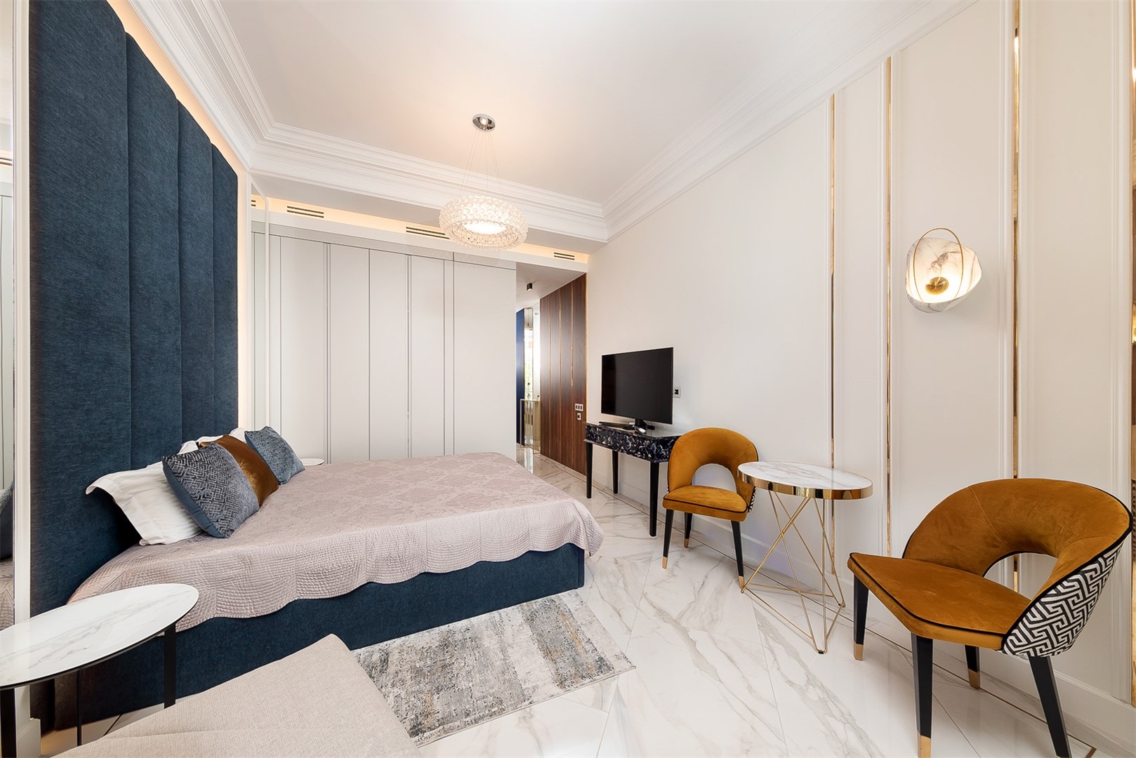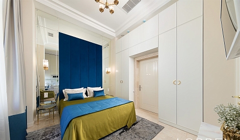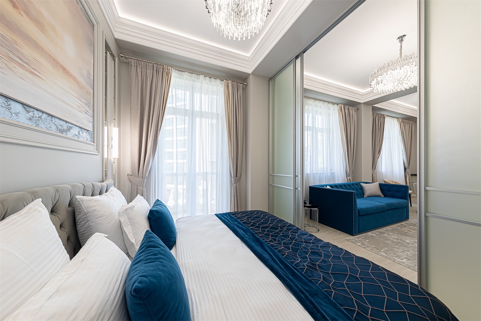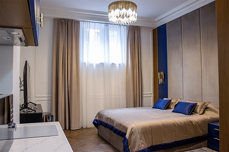 В номере: диван, зеркало, кровать двуспальная, стол, столик журнальный, столик туалетный, стулья, тумба багажная, шкаф, гладильная доска, кондиционер, набор посуды, плита электрическая, сейф, стиральная машина, телевизор ЖК, утюг, холодильник, чайный набор посуды, электрочайник