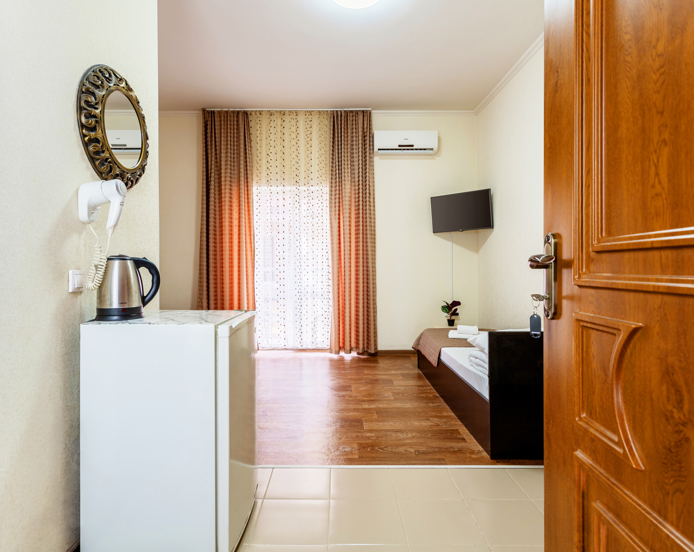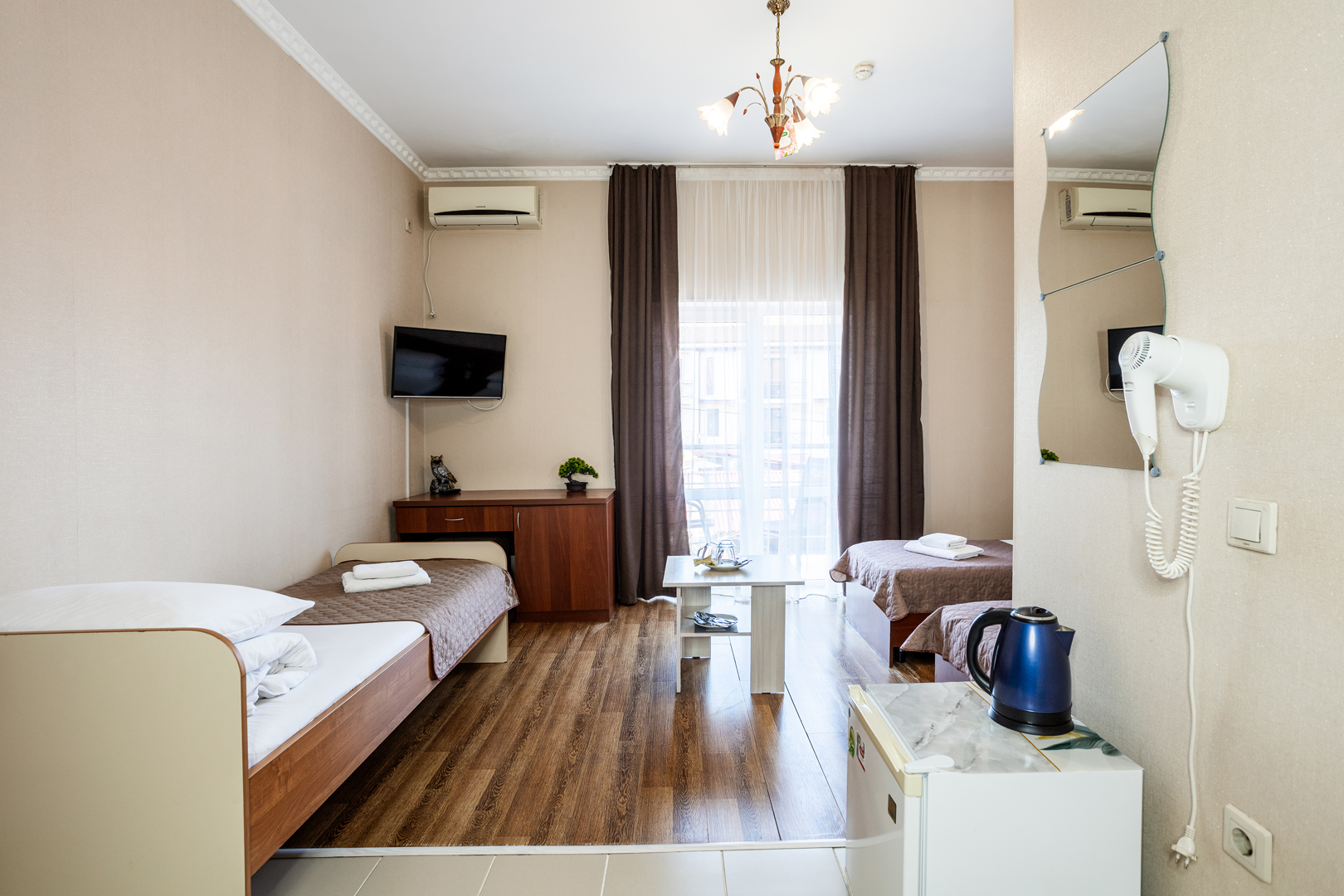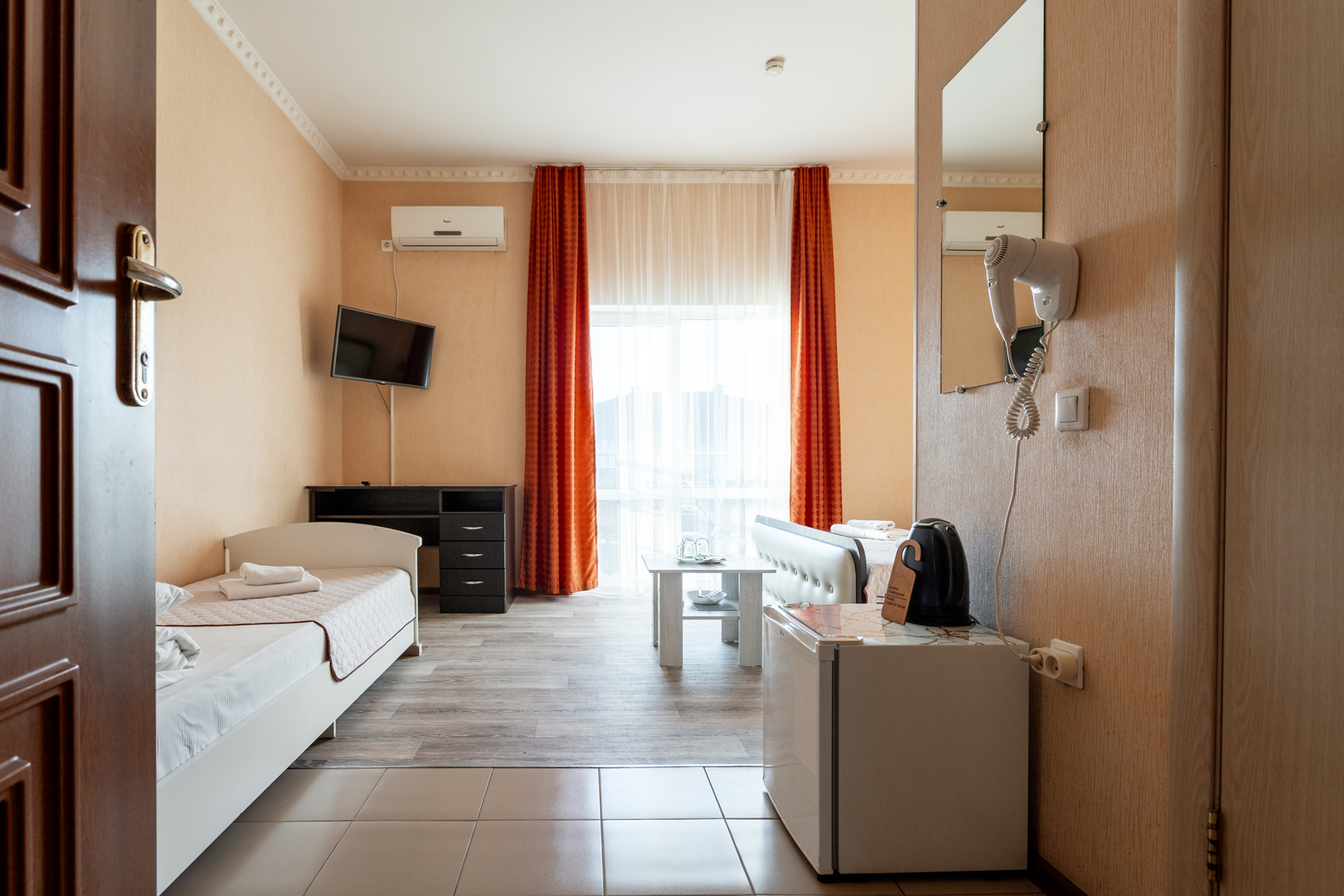 В номере: зеркало, кровати односпальные, прикроватные тумбочки, стол, шкаф, кондиционер, мини-холодильник, сейф, телевизор, теплый пол, чайный набор посуды, электрочайник