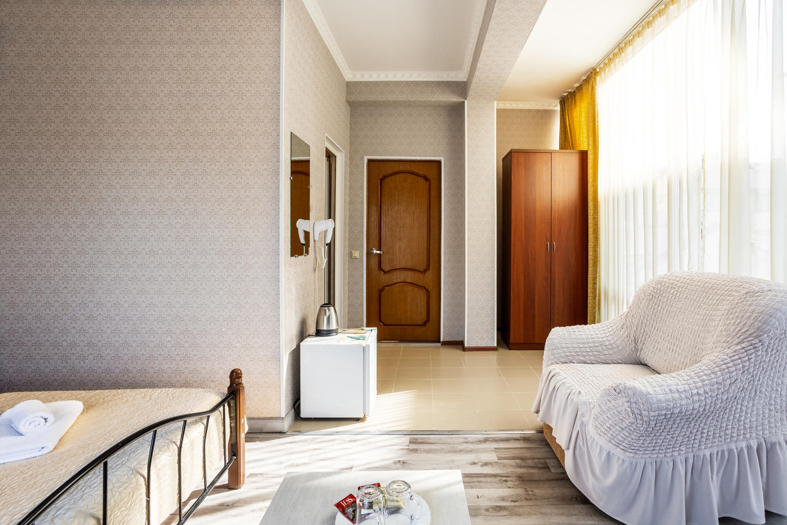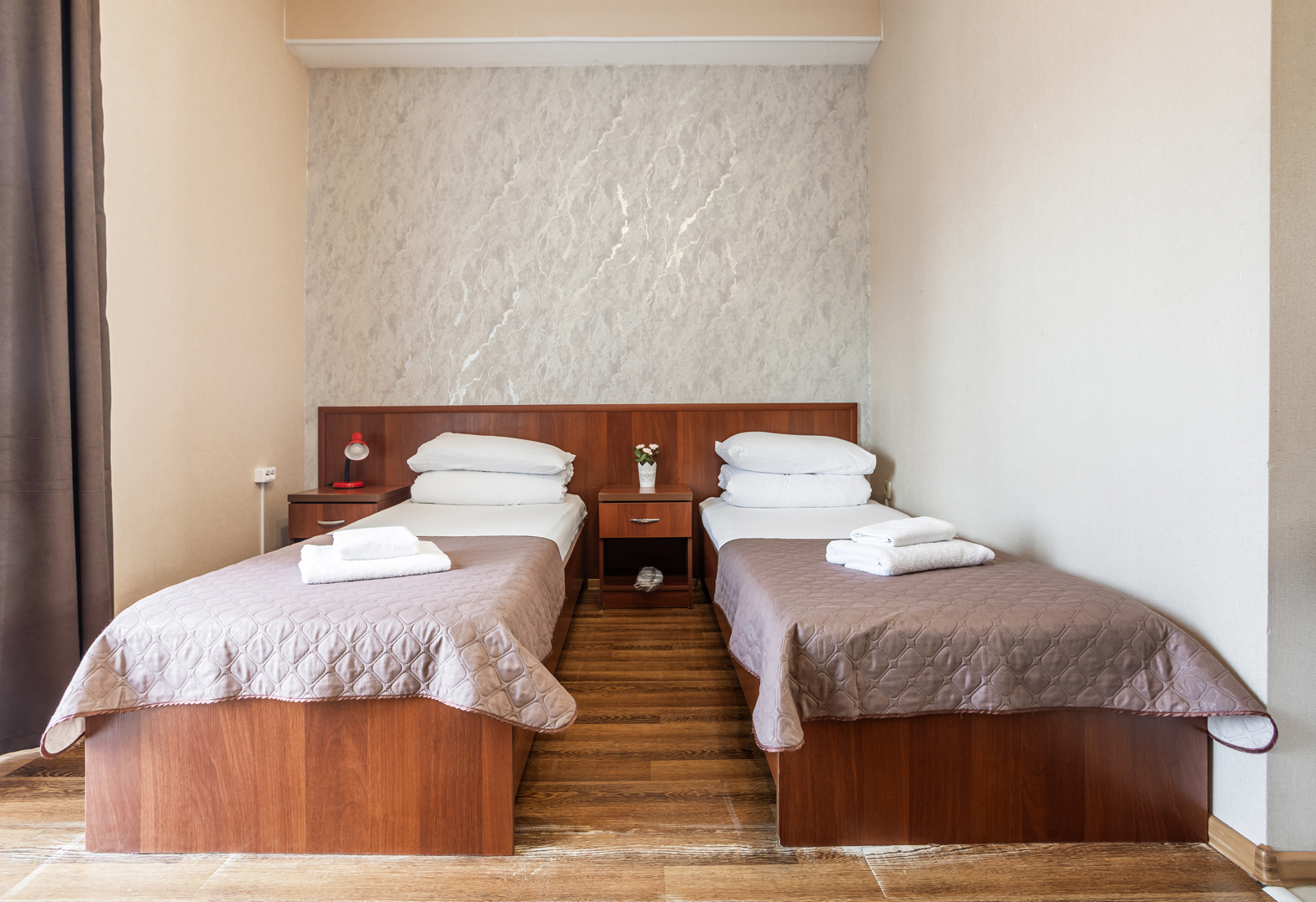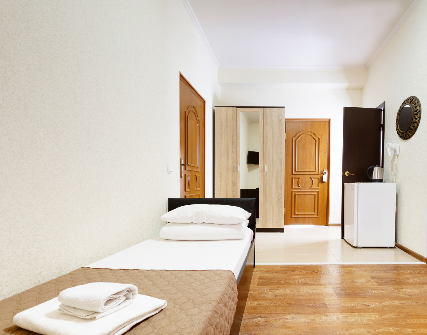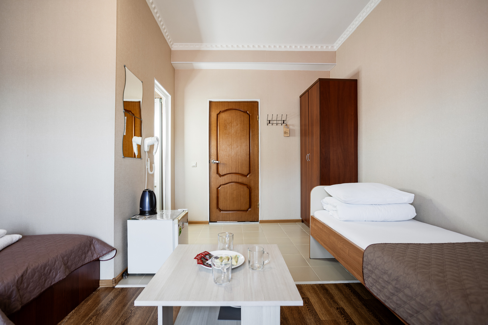 В номере: зеркало, кровати односпальные, прикроватные тумбочки, стол, шкаф, кондиционер, мини-холодильник, сейф, телевизор, теплый пол, чайный набор посуды, электрочайник