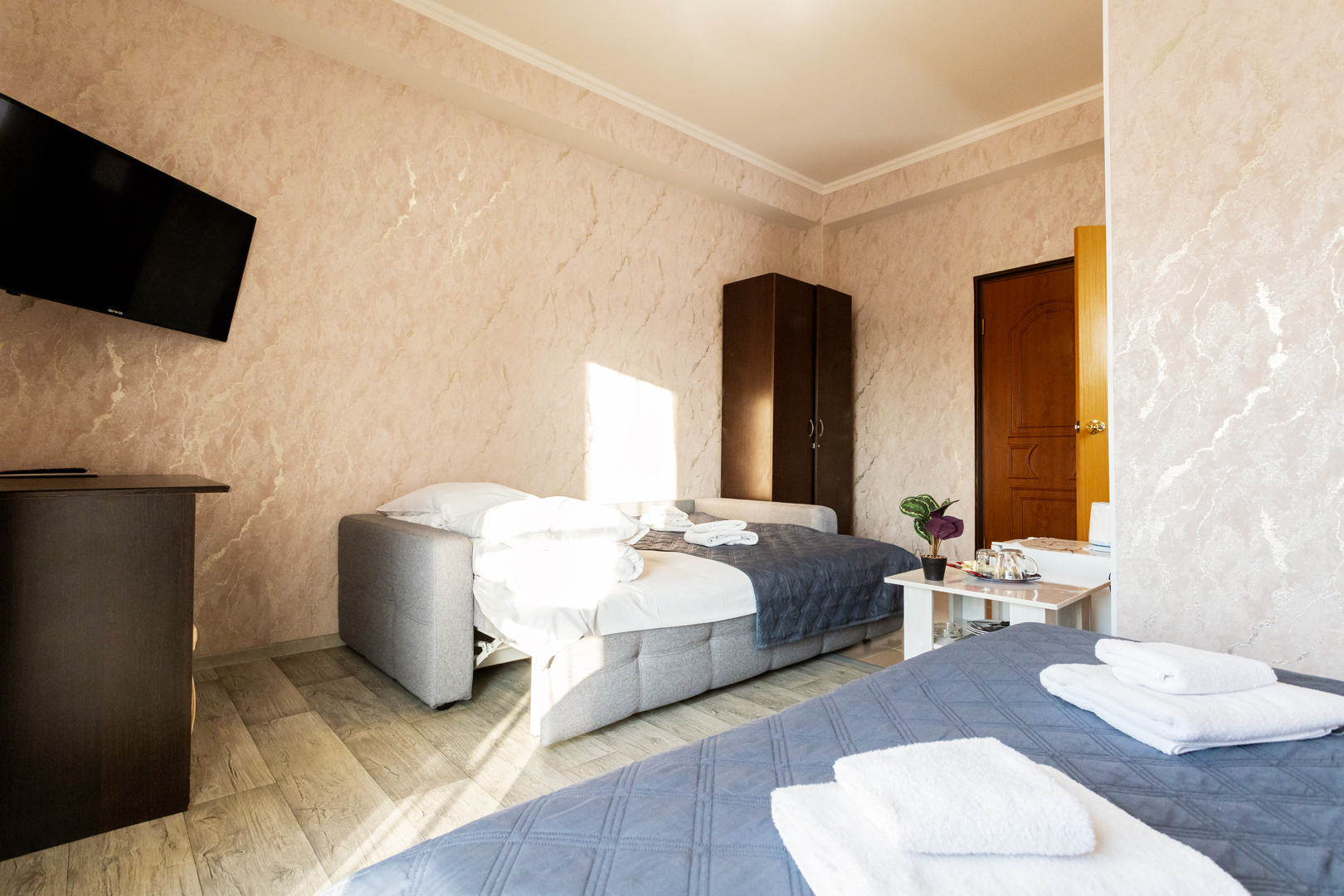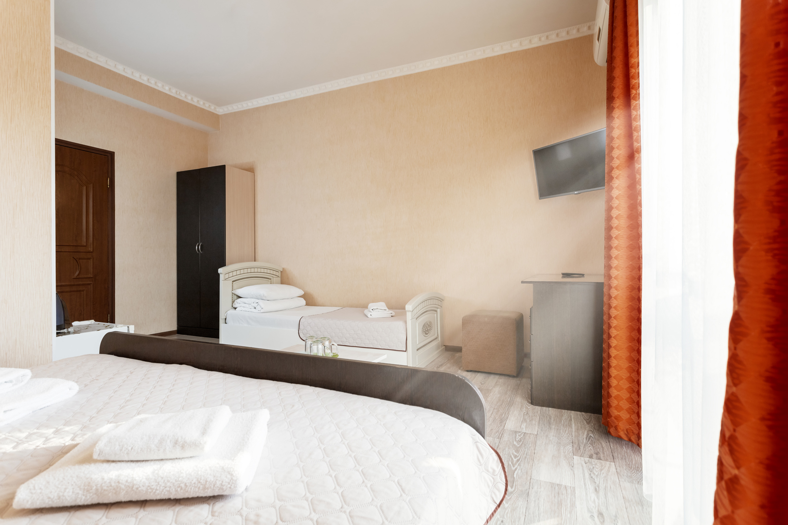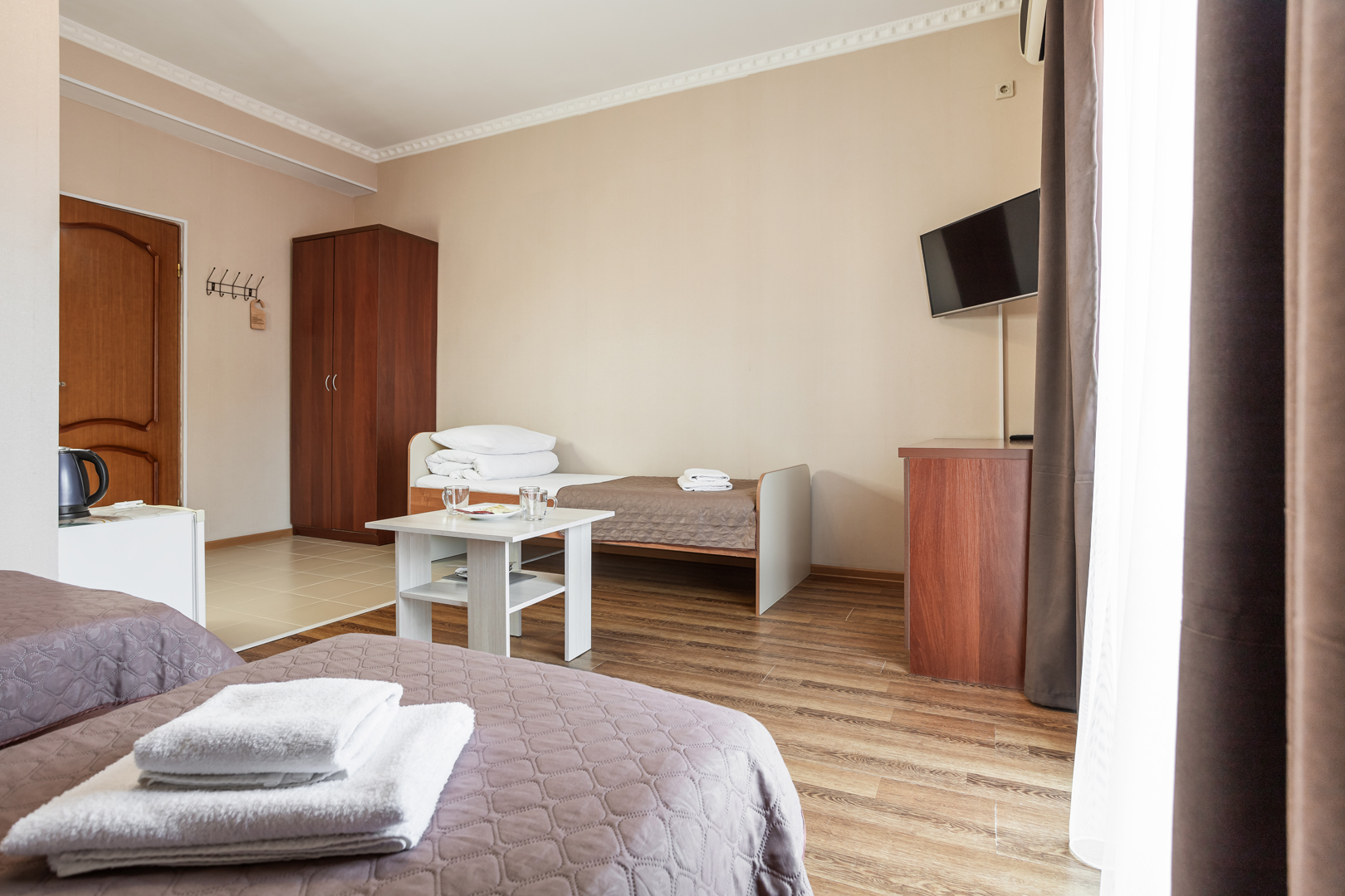 В номере: зеркало, кровать двуспальная, кровать односпальная, прикроватные тумбочки, стол, шкаф, кондиционер, мини-холодильник, сейф, телевизор, теплый пол, чайный набор посуды, электрочайник
