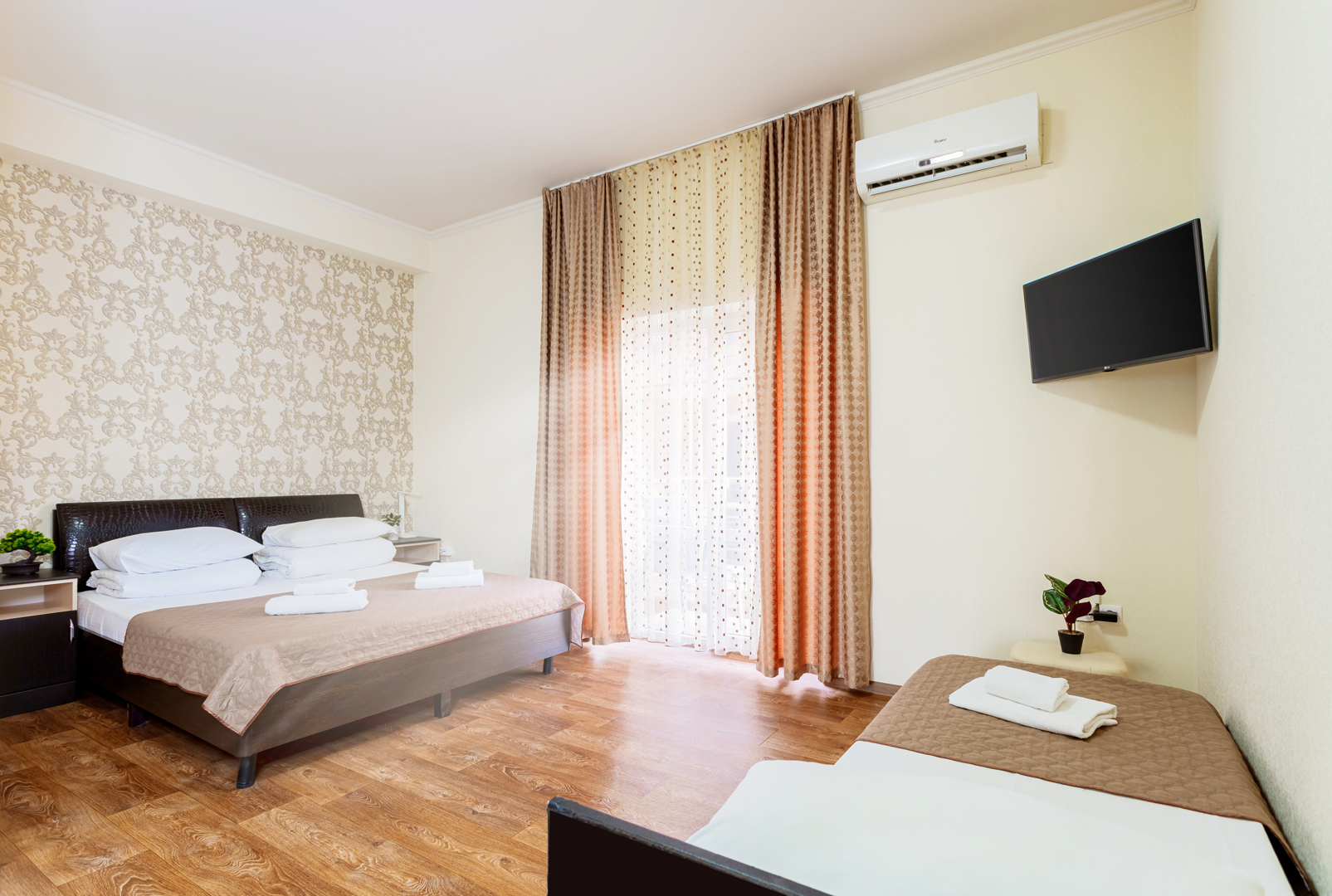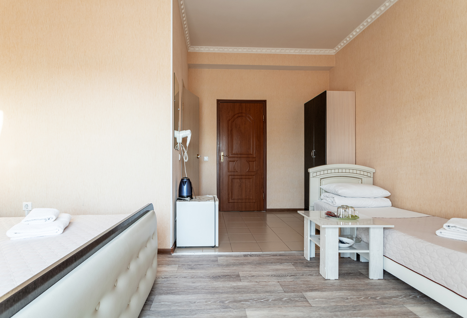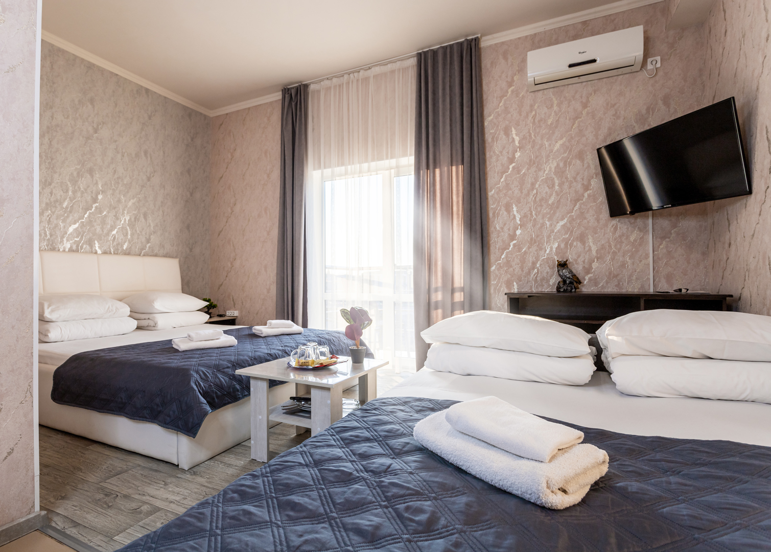 В номере: зеркало, кровать двуспальная, кровать односпальная, прикроватные тумбочки, стол, шкаф, кондиционер, мини-холодильник, сейф, телевизор, теплый пол, чайный набор посуды, электрочайник