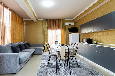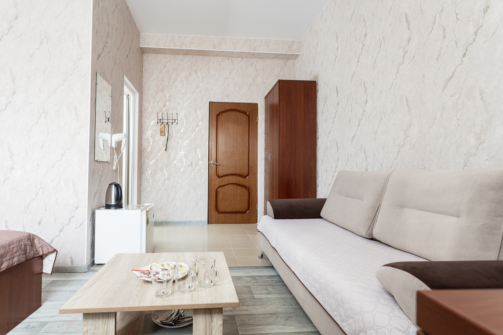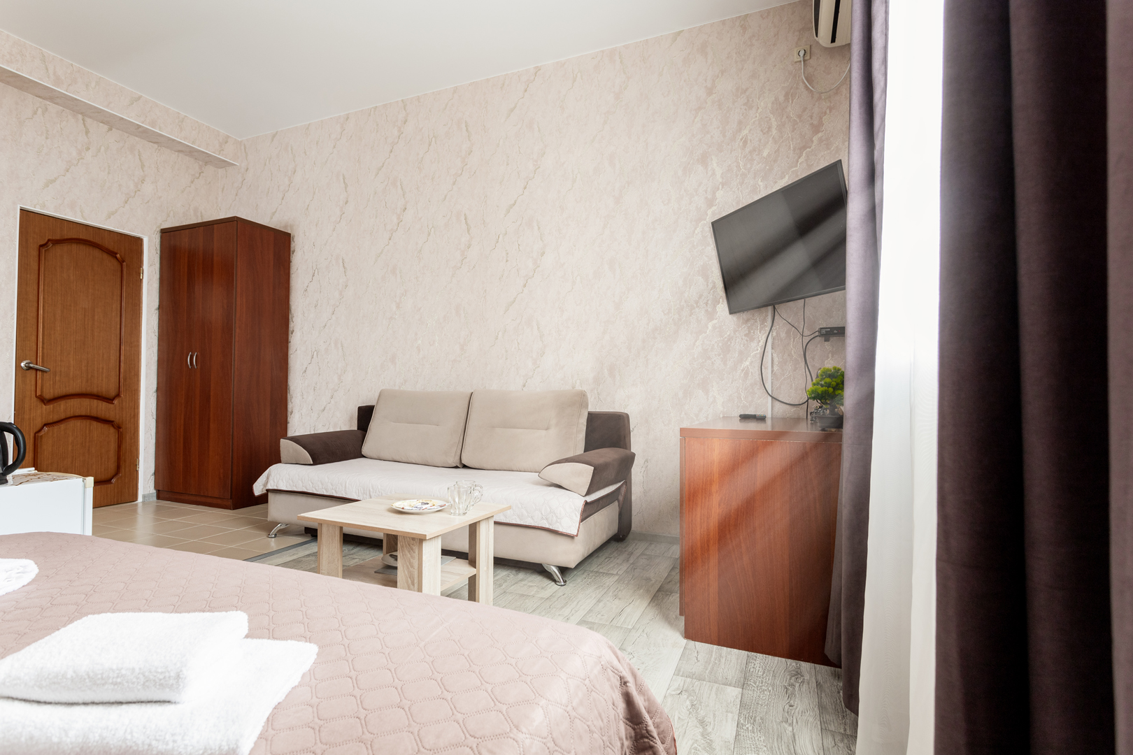 В номере: диван раскладной, зеркало, кровать двуспальная, мягкий уголок, прикроватные тумбочки, стол, стулья, шкаф, кондиционер, микроволновая печь, набор посуды, плита электрическая, сейф, телевизор, теплый пол, холодильник, электрочайник