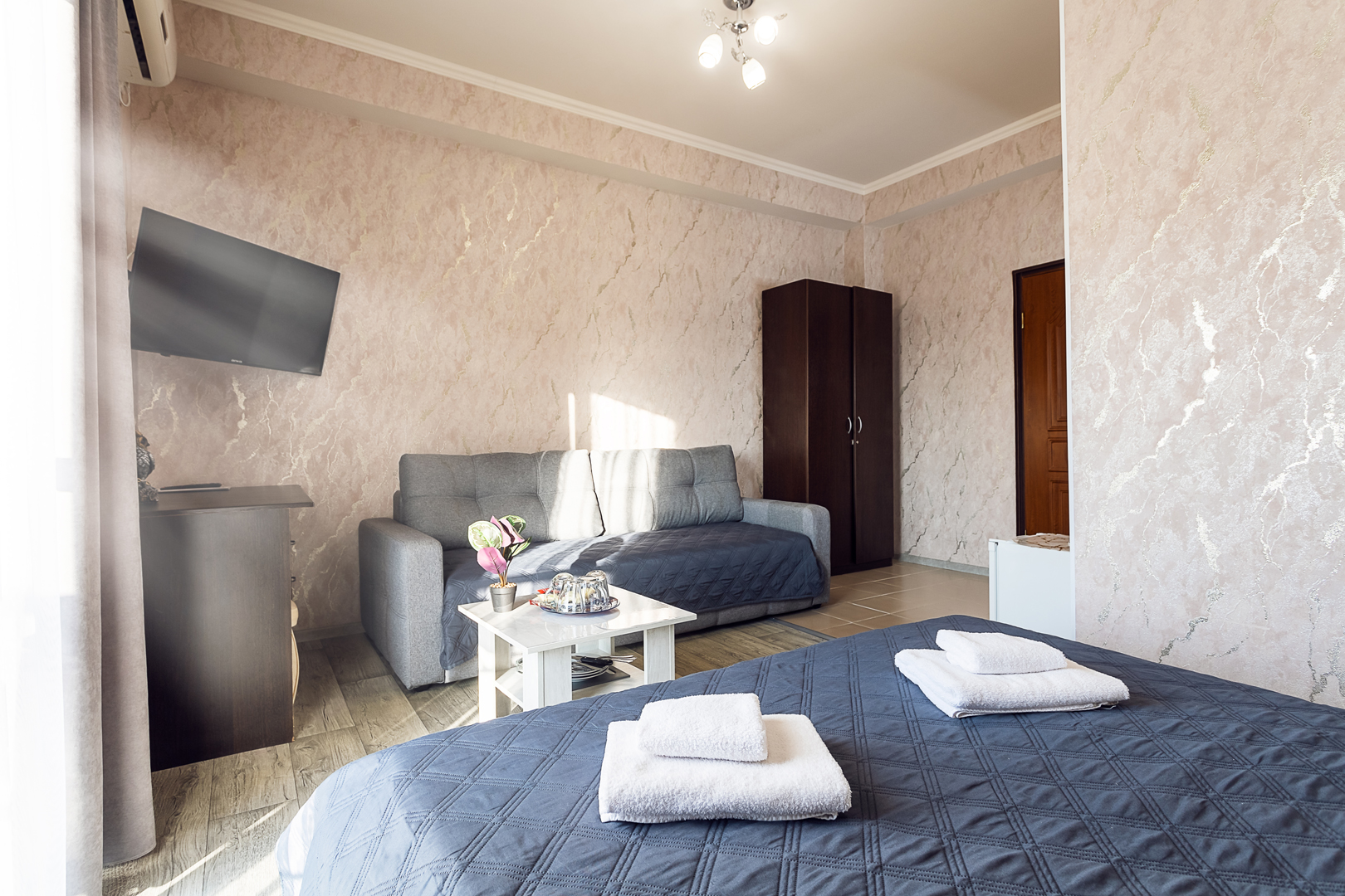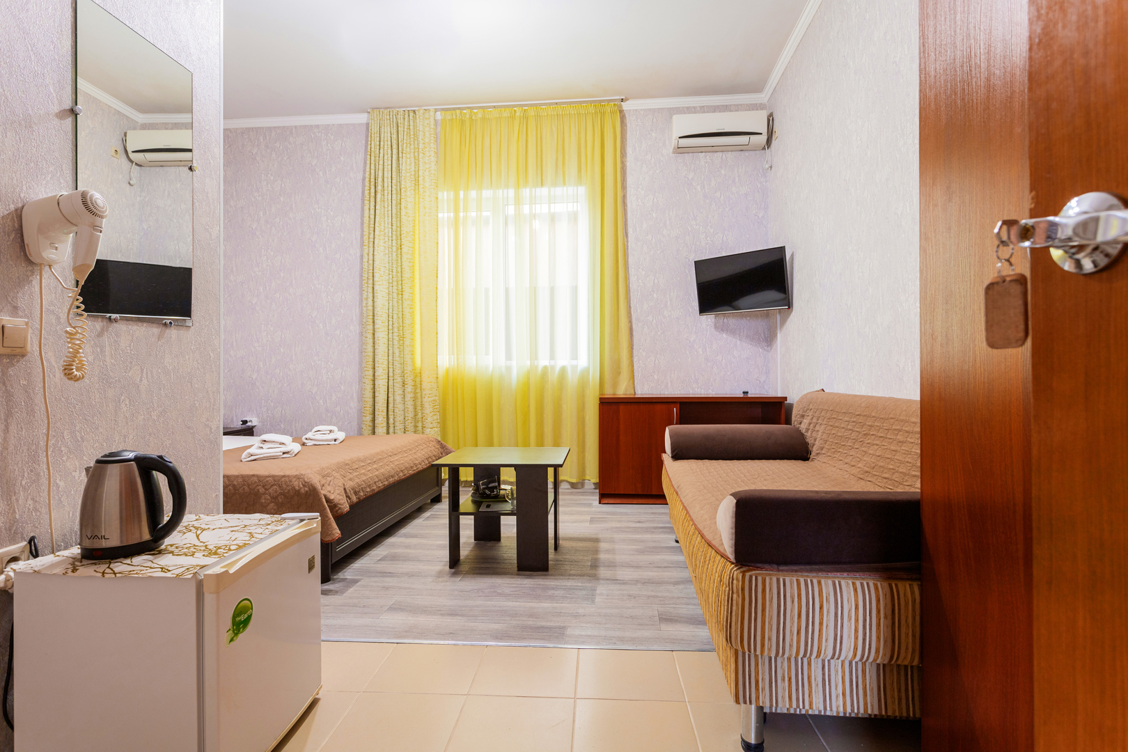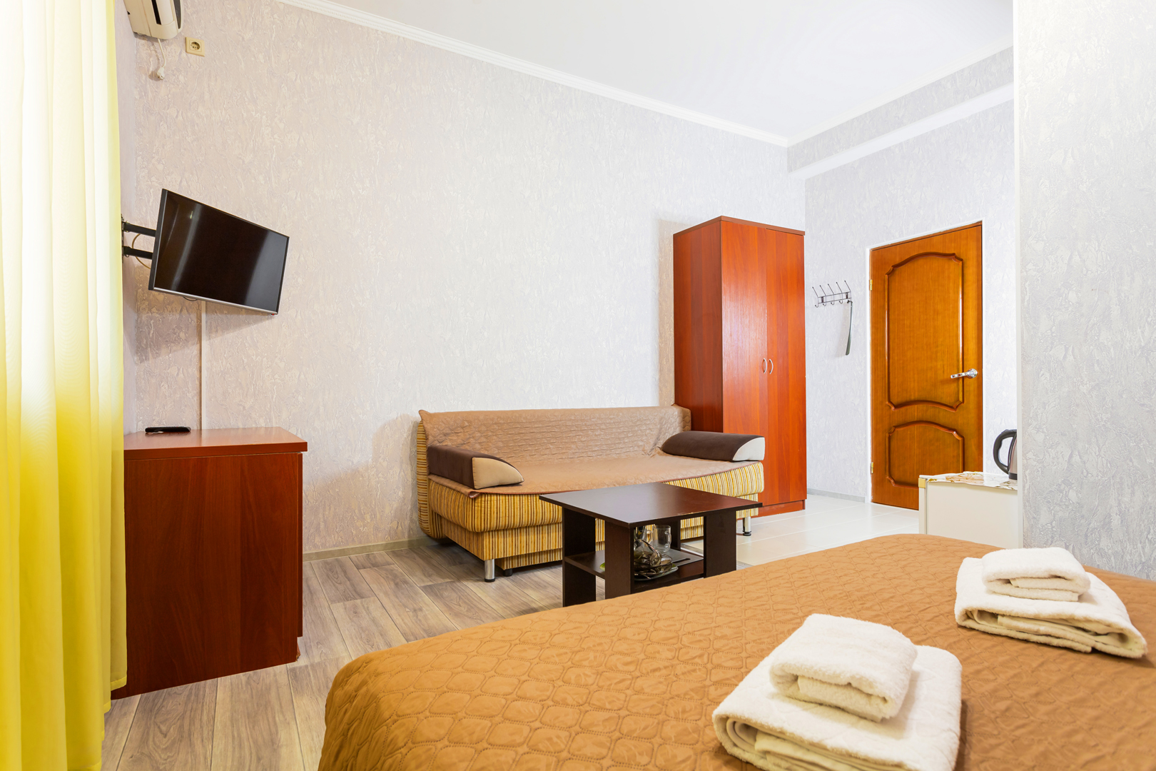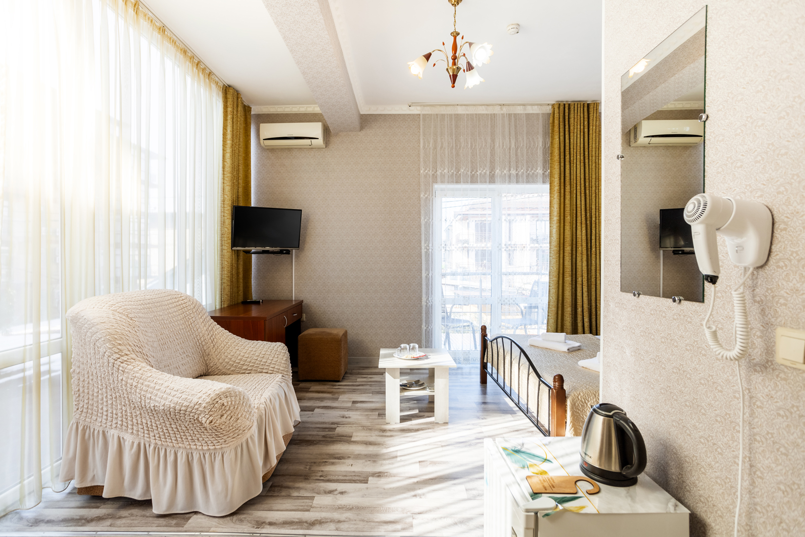 В номере: диван раскладной, зеркало, кровать двуспальная, прикроватные тумбочки, стол, шкаф, кондиционер, мини-холодильник, сейф, телевизор, чайный набор посуды, электрочайник