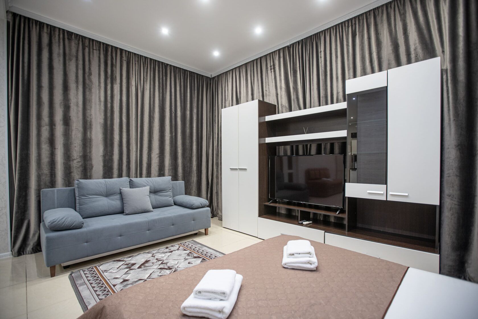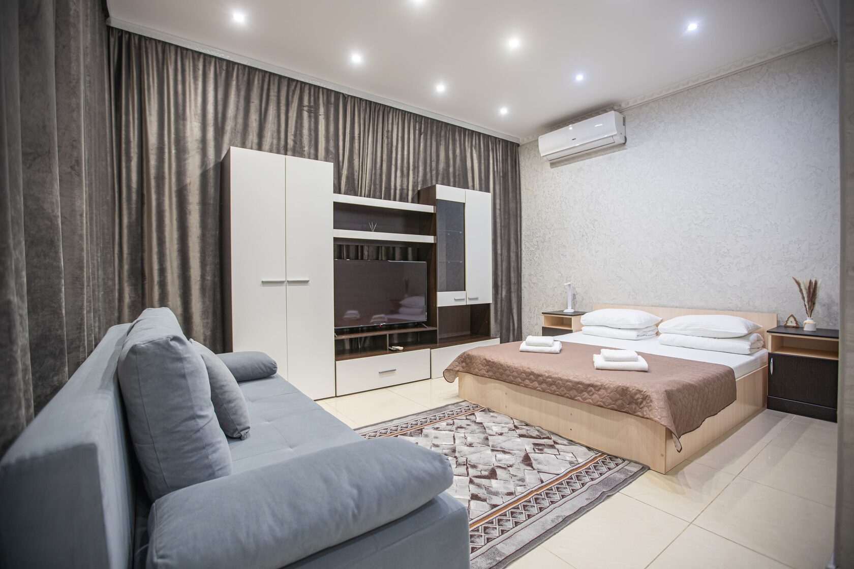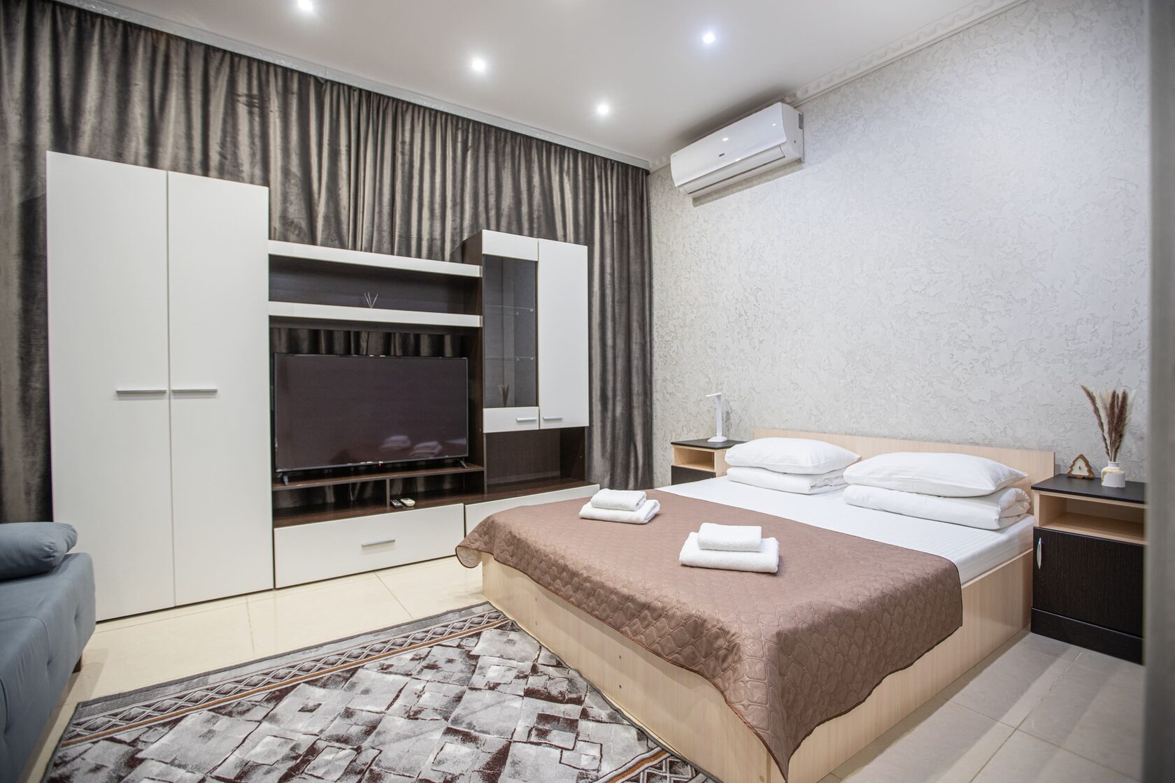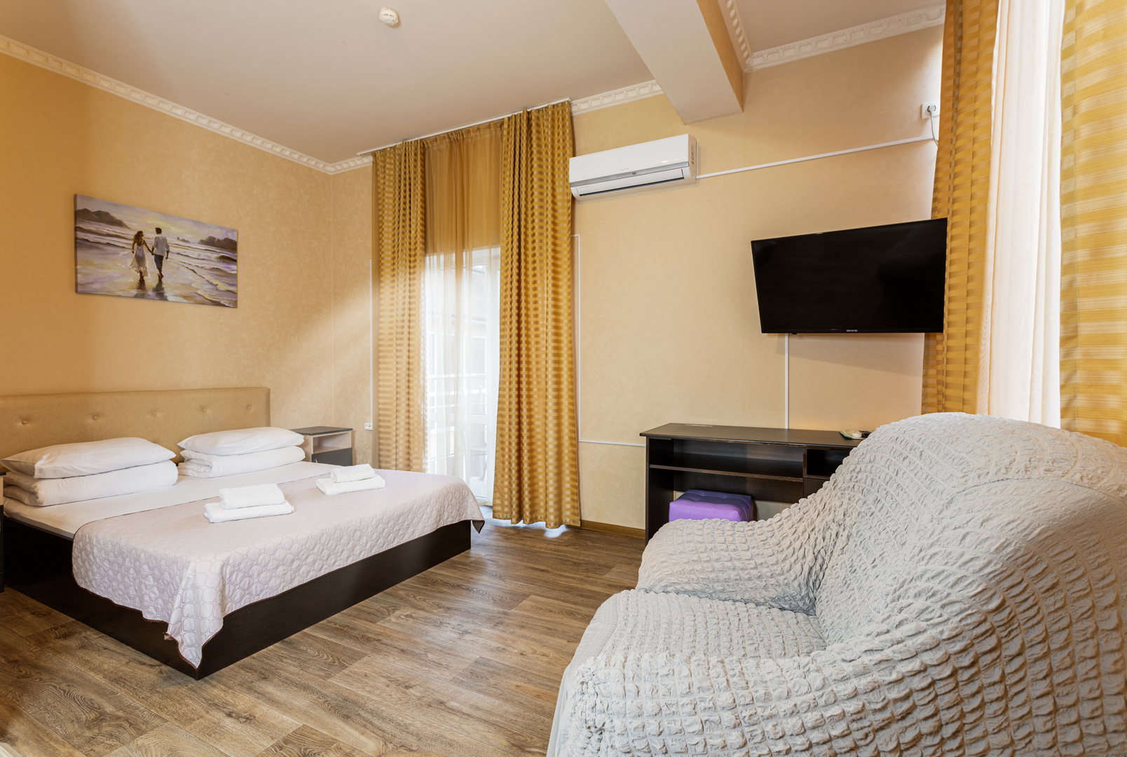 В номере: диван раскладной, зеркало, кровать двуспальная, прикроватные тумбочки, стол, шкаф, кондиционер, мини-холодильник, сейф, телевизор, чайный набор посуды, электрочайник