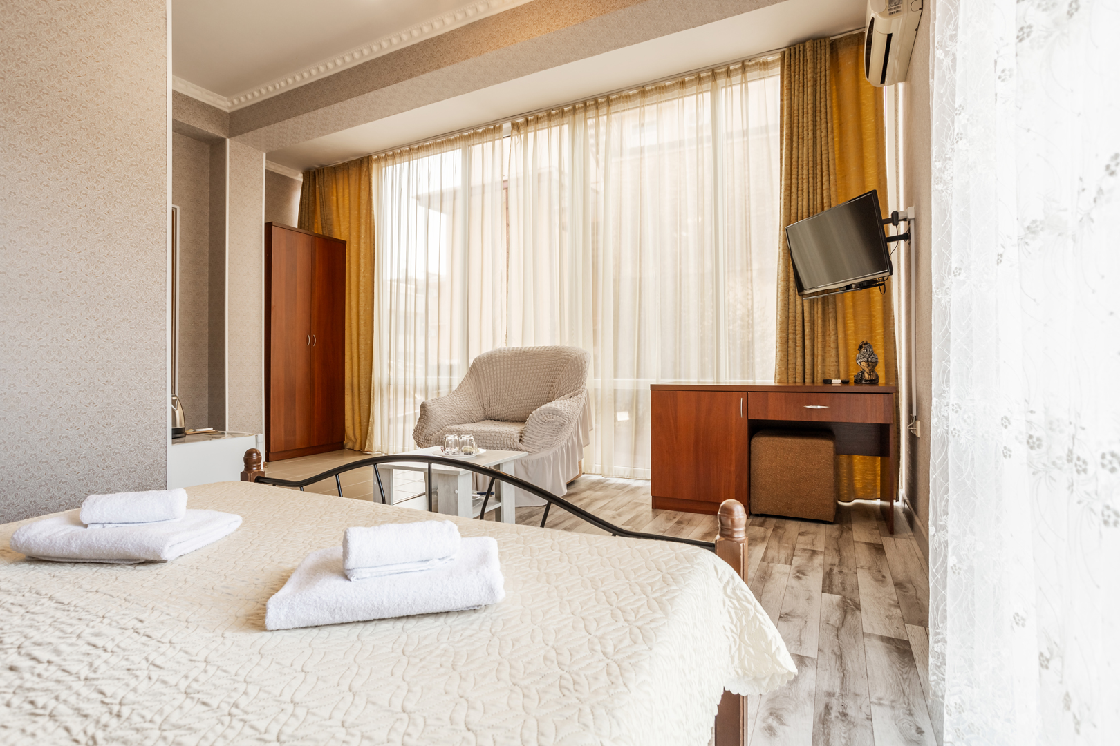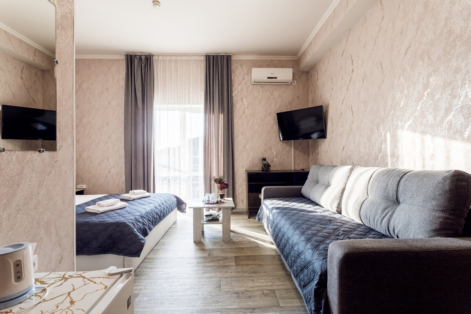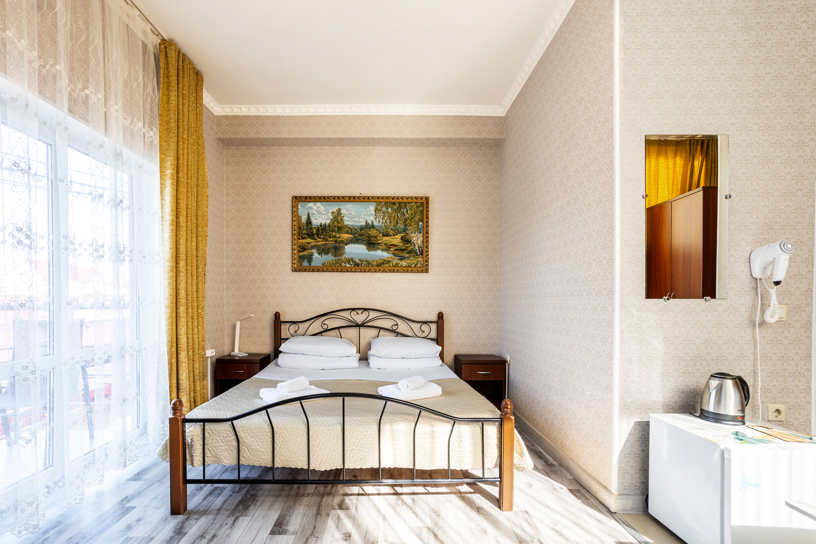 В номере: зеркало, кровать двуспальная, прикроватные тумбочки, стол, шкаф, кондиционер, мини-холодильник, сейф, телевизор, теплый пол, чайный набор посуды, электрочайник