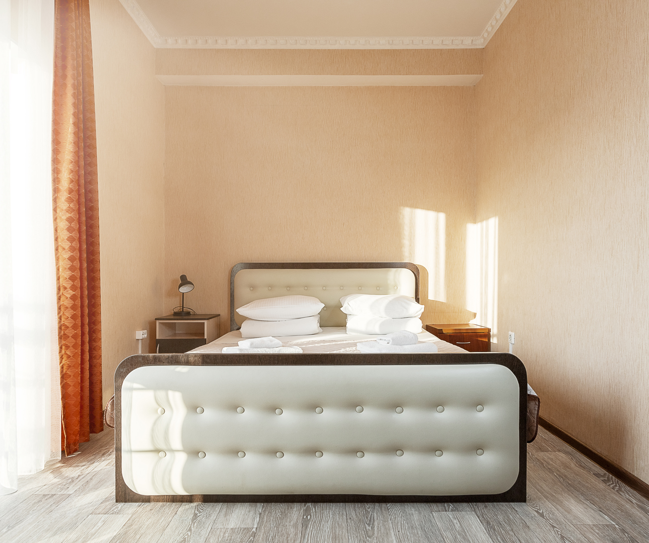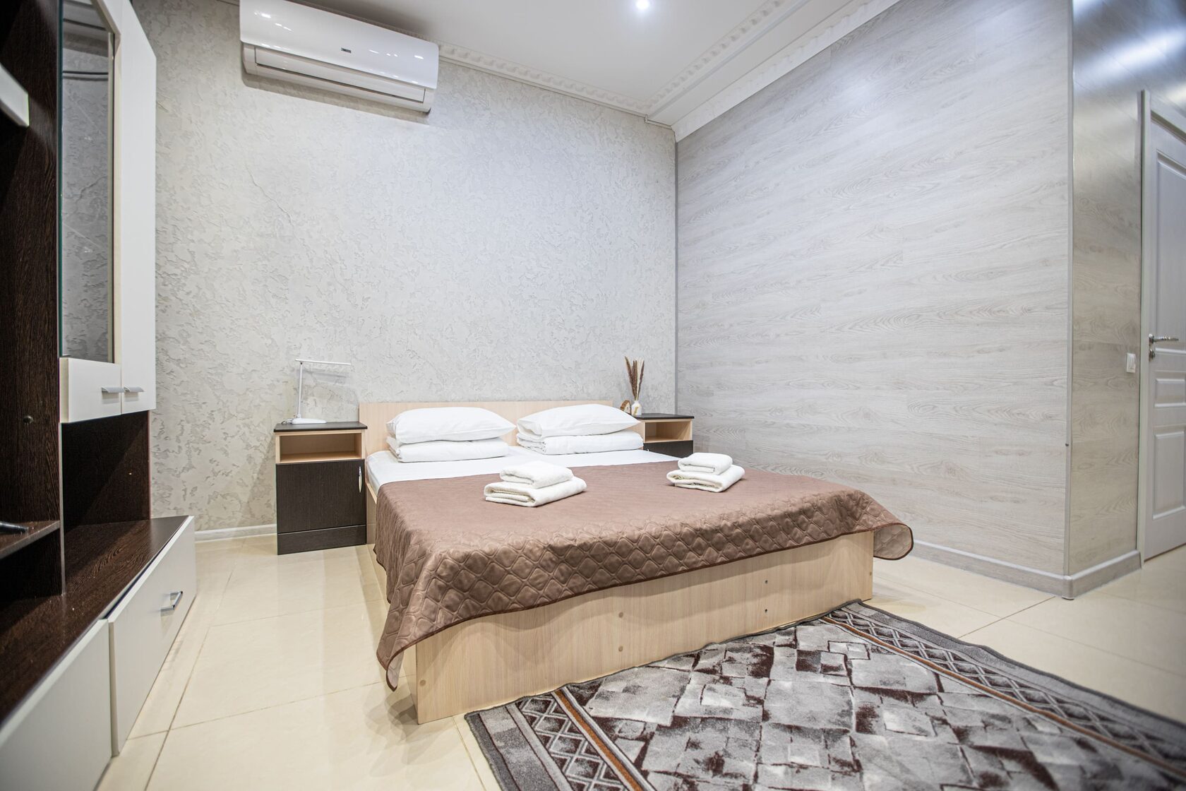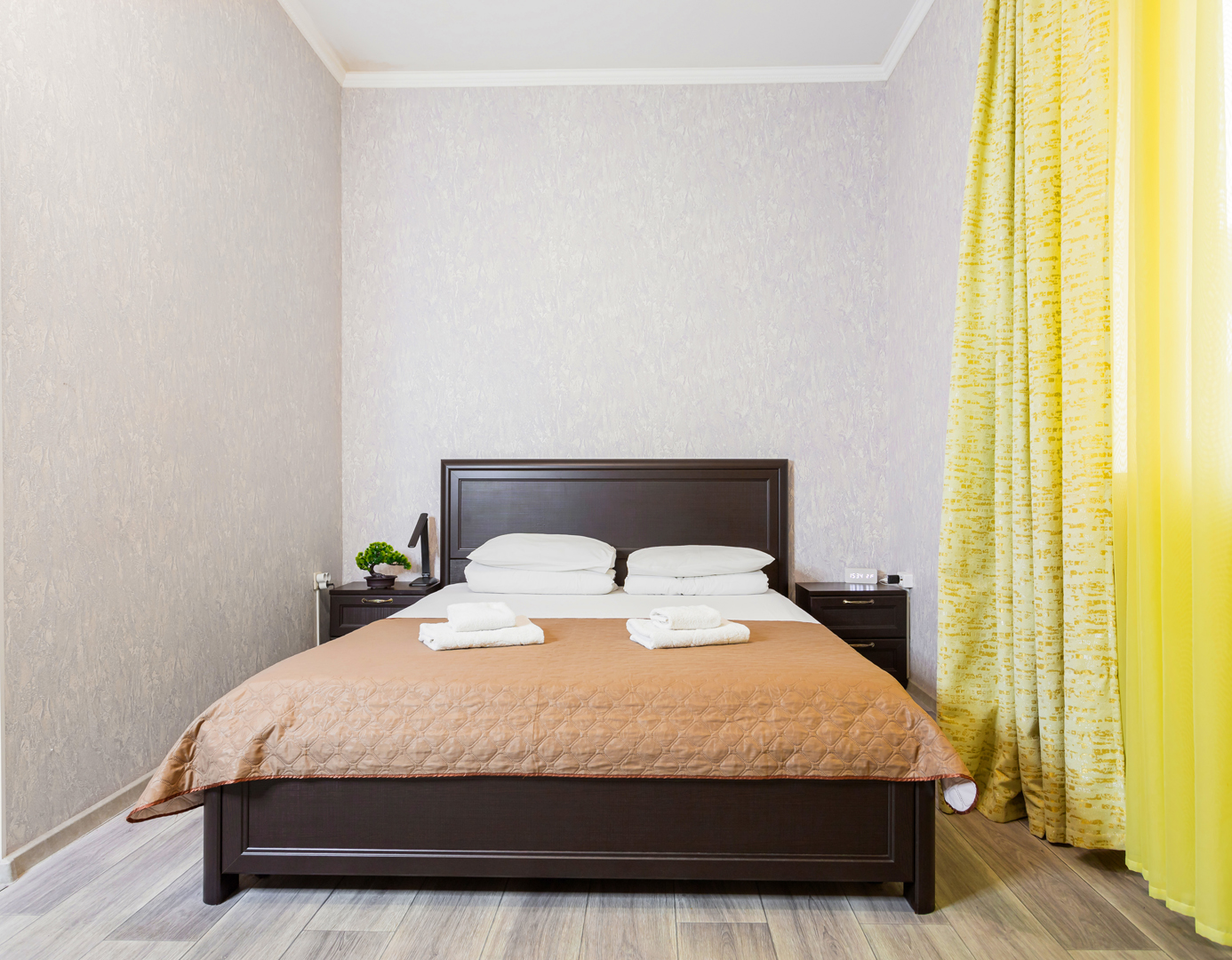 В номере: зеркало, кровать двуспальная, прикроватные тумбочки, стол, шкаф, кондиционер, мини-холодильник, сейф, телевизор, теплый пол, чайный набор посуды, электрочайник