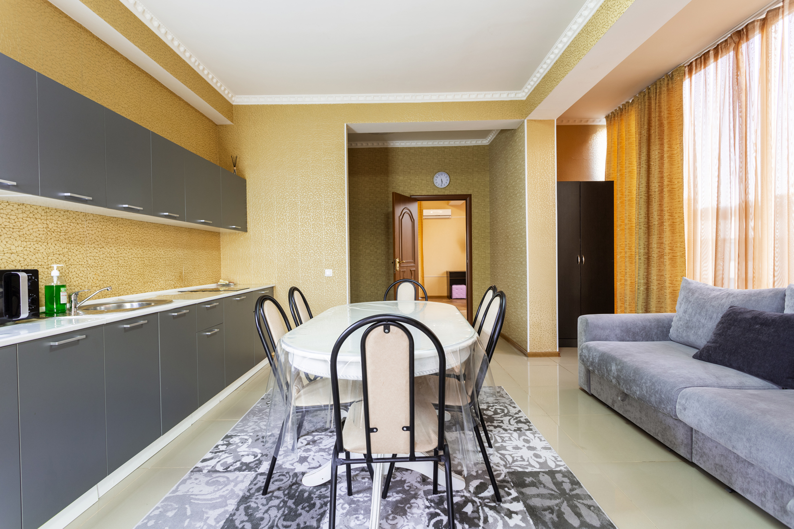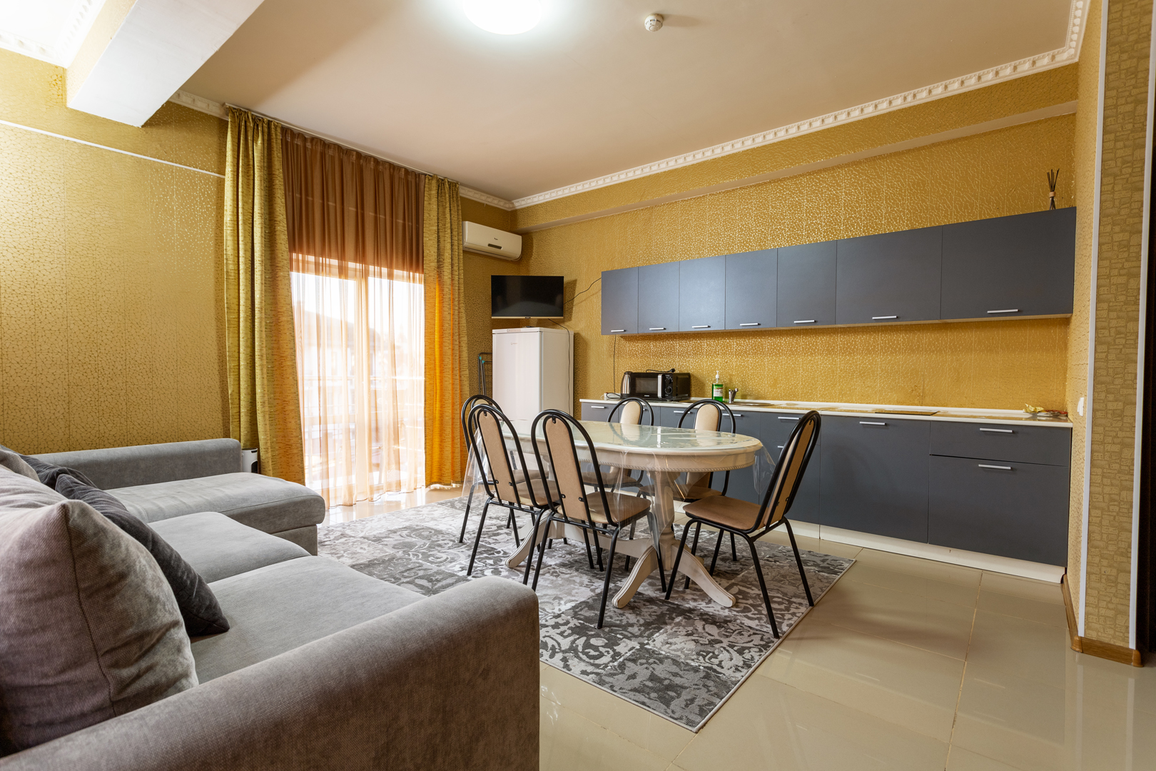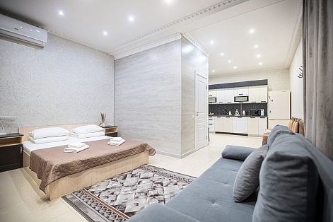 В номере: диван раскладной, зеркало, кресло-кровать, кровать двуспальная, прикроватные тумбочки, стол, стулья, шкаф, кондиционер, микроволновая печь, набор посуды, плита электрическая, сейф, стиральная машина, телевизор, теплый пол, холодильник, электрочайник