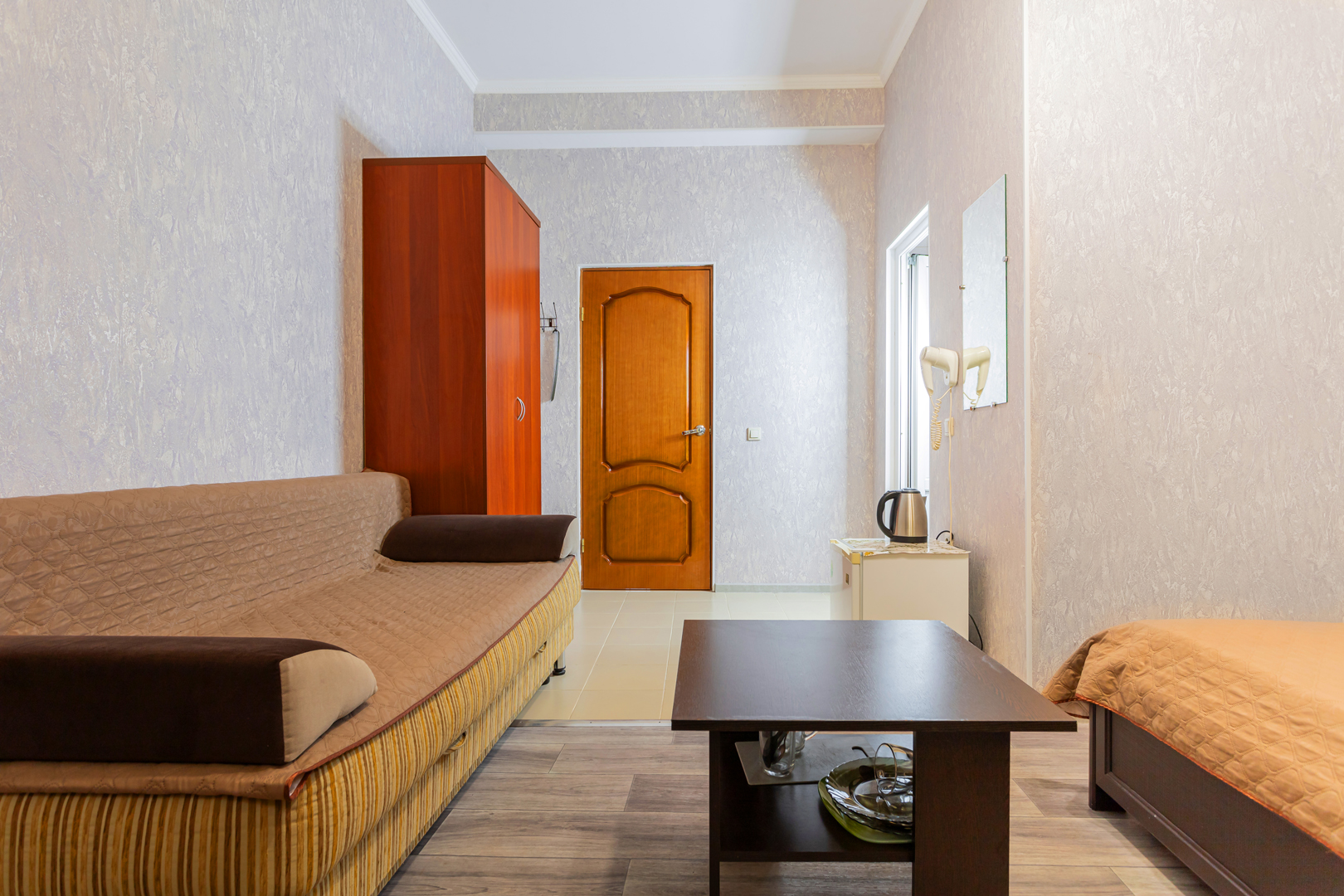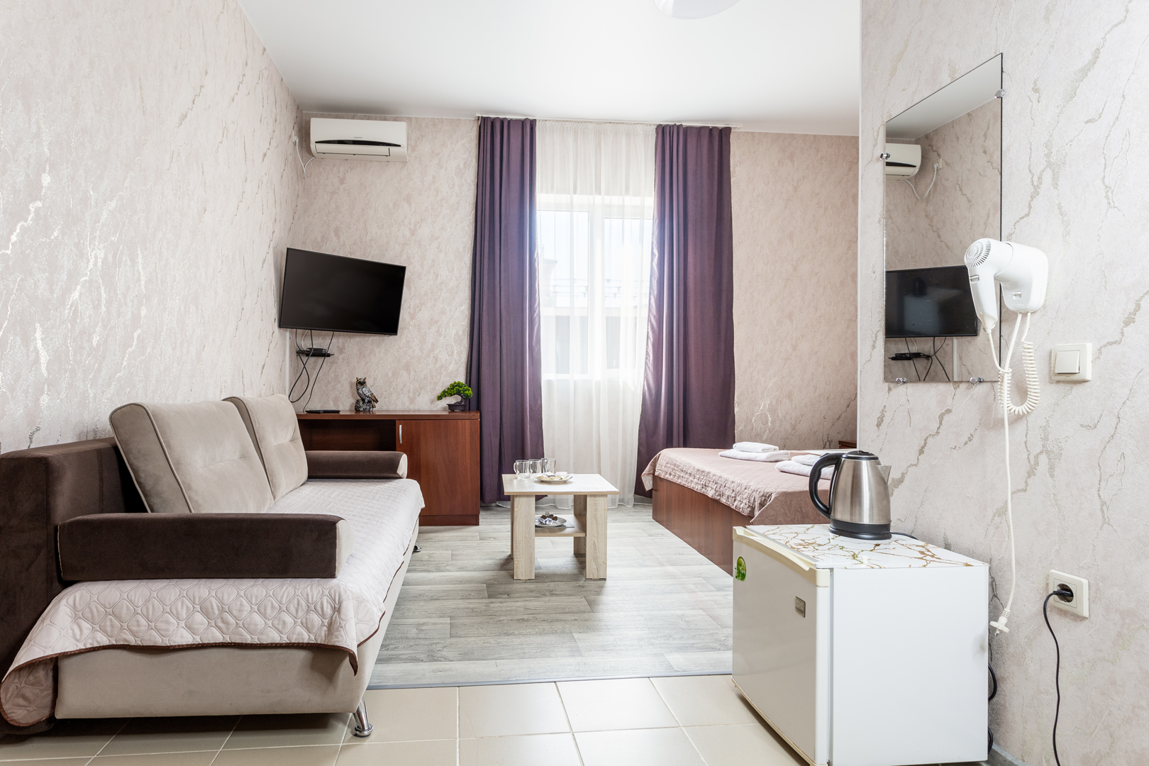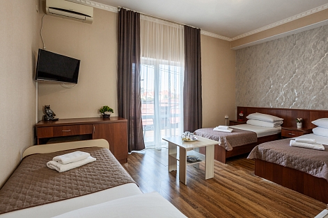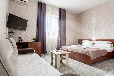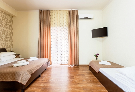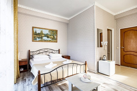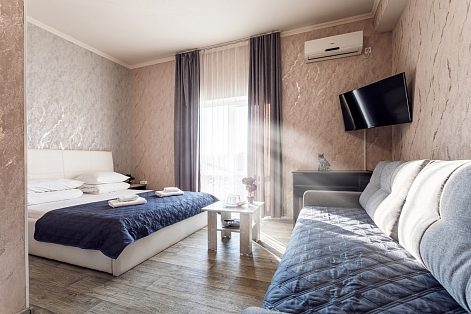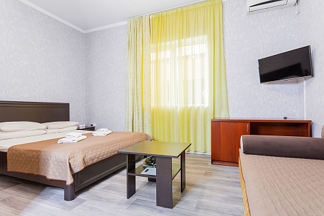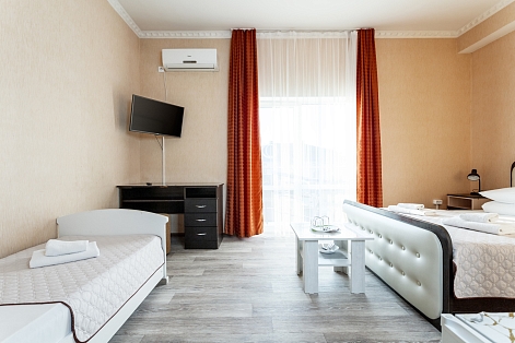 В номере: зеркало, кровать двуспальная, кровать односпальная, мягкий уголок, прикроватные тумбочки, стол, шкаф, кондиционер, мини-холодильник, набор посуды, сейф, телевизор, теплый пол, электрочайник