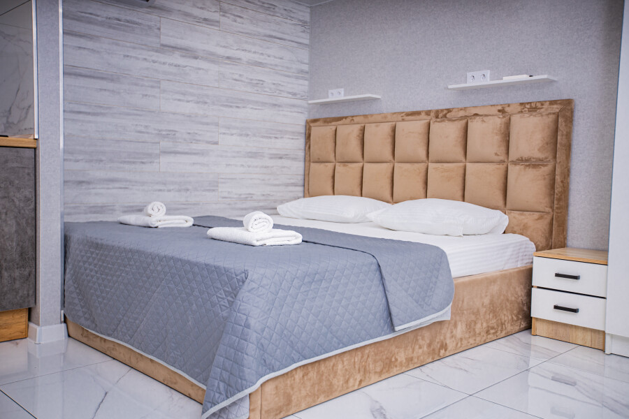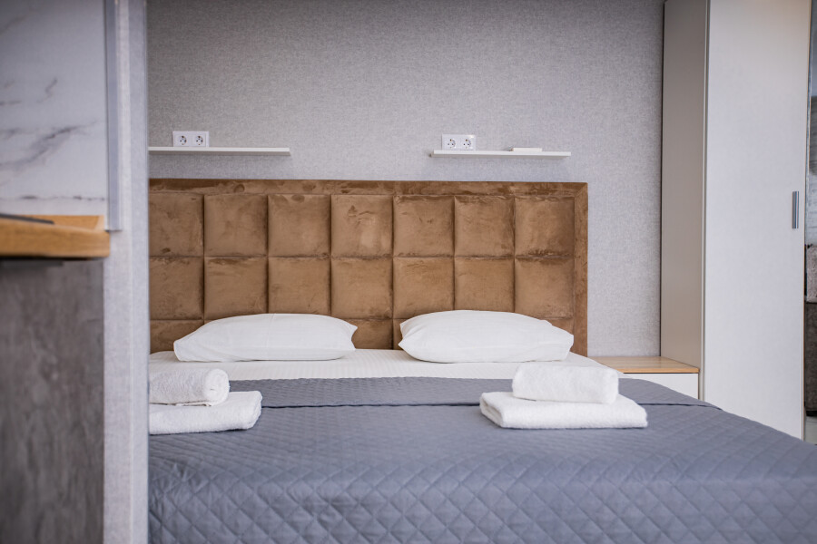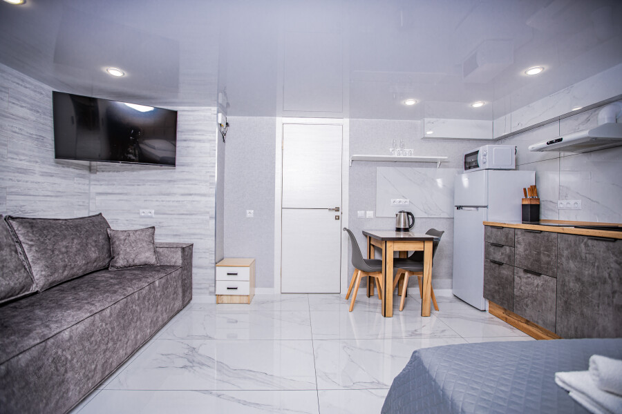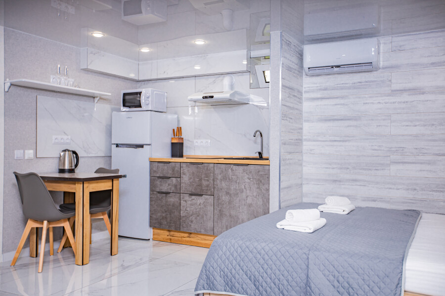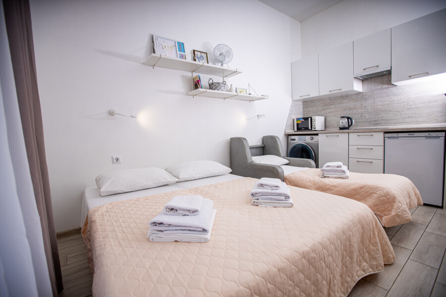В номере: вешалка, зеркало, кресло-кровать, кровать двуспальная, стол, стулья, шкаф, кондиционер, микроволновая печь, мини-холодильник, набор посуды, плита индукционная, посудомоечная машина, стиральная машина, телевизор ЖК, электрочайник