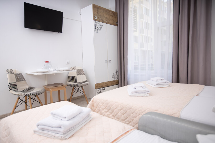 В номере: диван раскладной, кровать двуспальная, прикроватная тумбочка, стол, стулья, шкаф, кондиционер, микроволновая печь, набор посуды, плита индукционная, стиральная машина, телевизор ЖК, холодильник, электрочайник