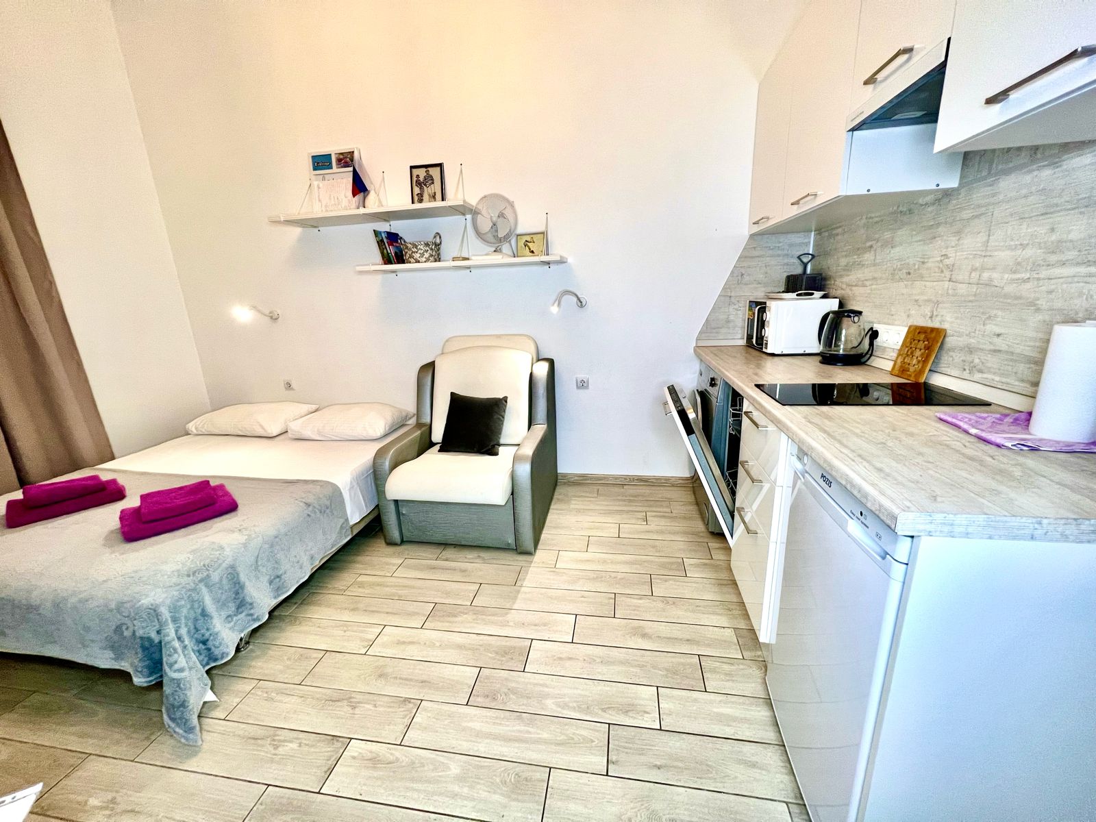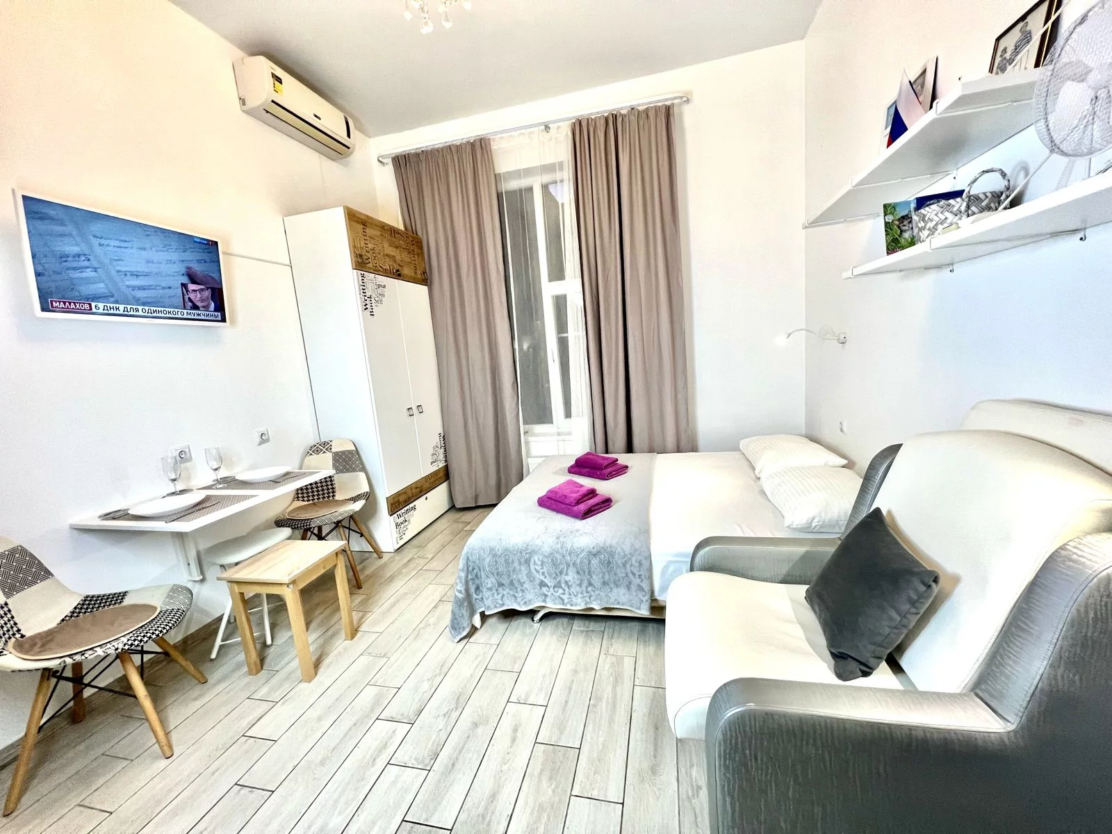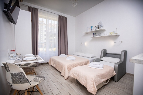 А привычные покупки доступны в супермаркете Пятерочка поблизости.Специально для авто путешественников организована парковка на территории под шлагбаумом и видеонаблюдением. Апартаменты-студия находятся на закрытой территории Отеля Sigma Sirius с детской и спортивной площадкой.Апартаменты оборудованы мини-кухней, набором современной мебели для удобства гостей, телевизором, кондиционером, холодильником, индукционной плитой, микроволновой печью, электрочайником, набором посуды, стиральной машиной. Санузел с ванной или душем. Доступен интернет Wi-Fi.