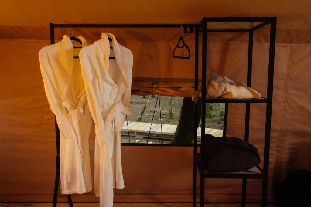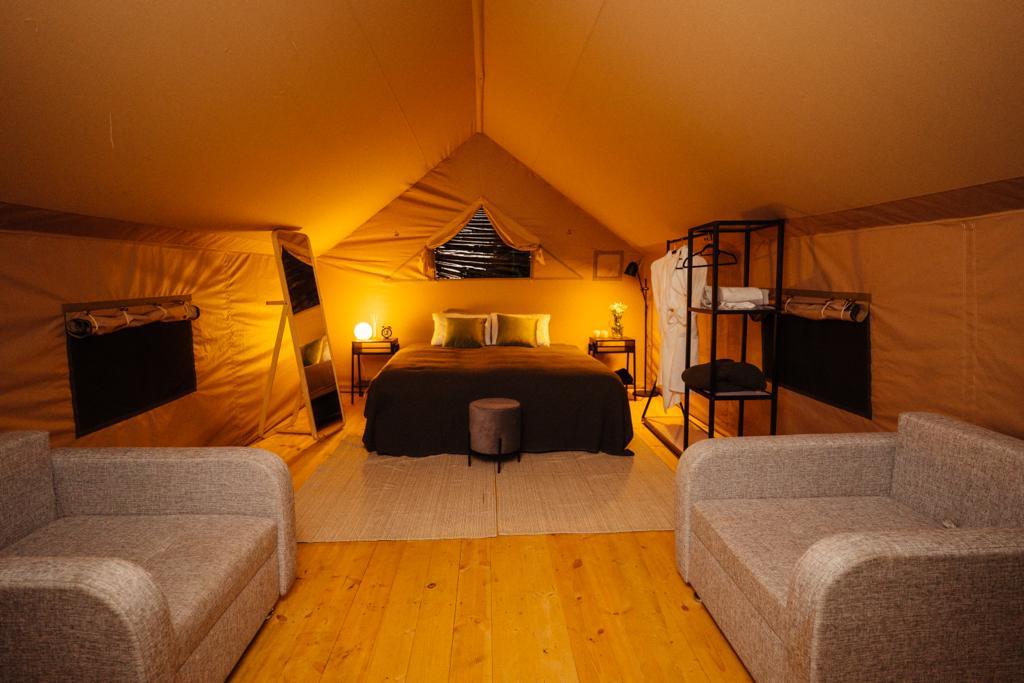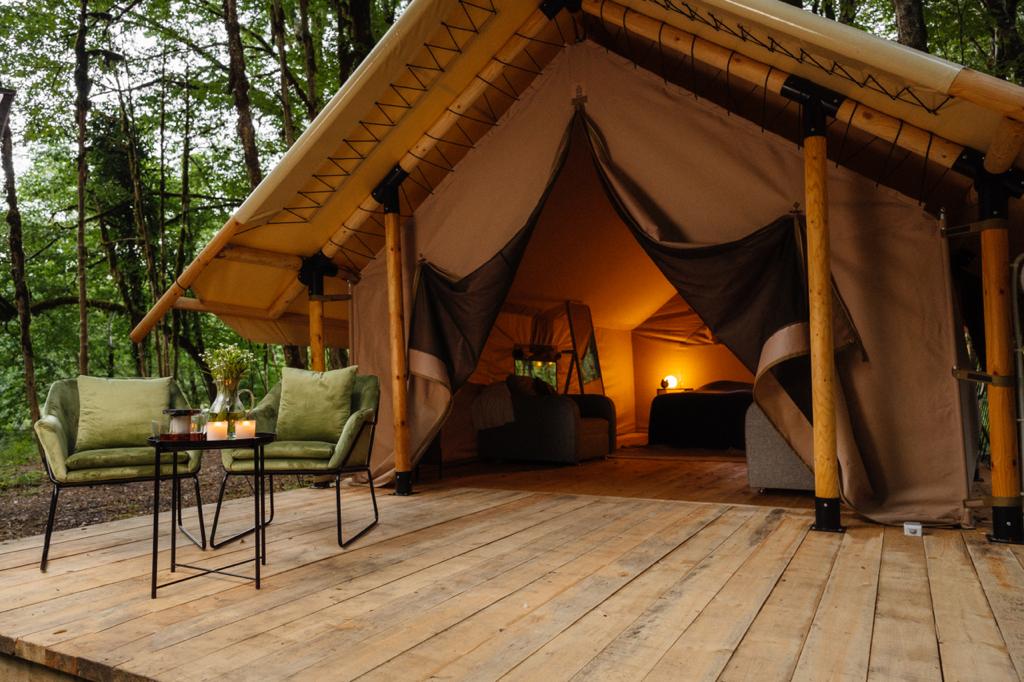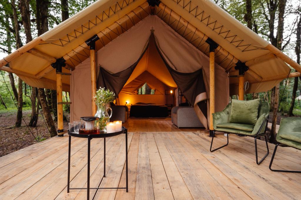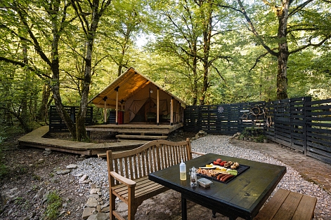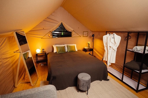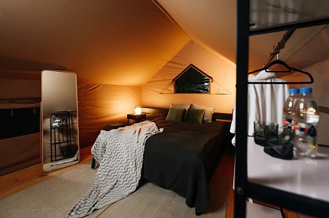 Гостям для размещения предлагаются комфортабельные палатки и шатры в стиле сафари. Палатки находятся в отдалении друг от друга, а значит, отдыхающим никто не будет мешать. Все шатры укомплектованы необходимой мебелью – есть двухспальная кровать, большое зеркало, стеллажи для хранения, также предусмотрен собственный санузел и душ, проведено электричество. На территории кемпинга работает ресторан, в распоряжении гостей русская баня с массажным кабинетом, для автовладельцев обустроена охраняемая парковка, а юные гости могут весело провести время на игровой площадке.